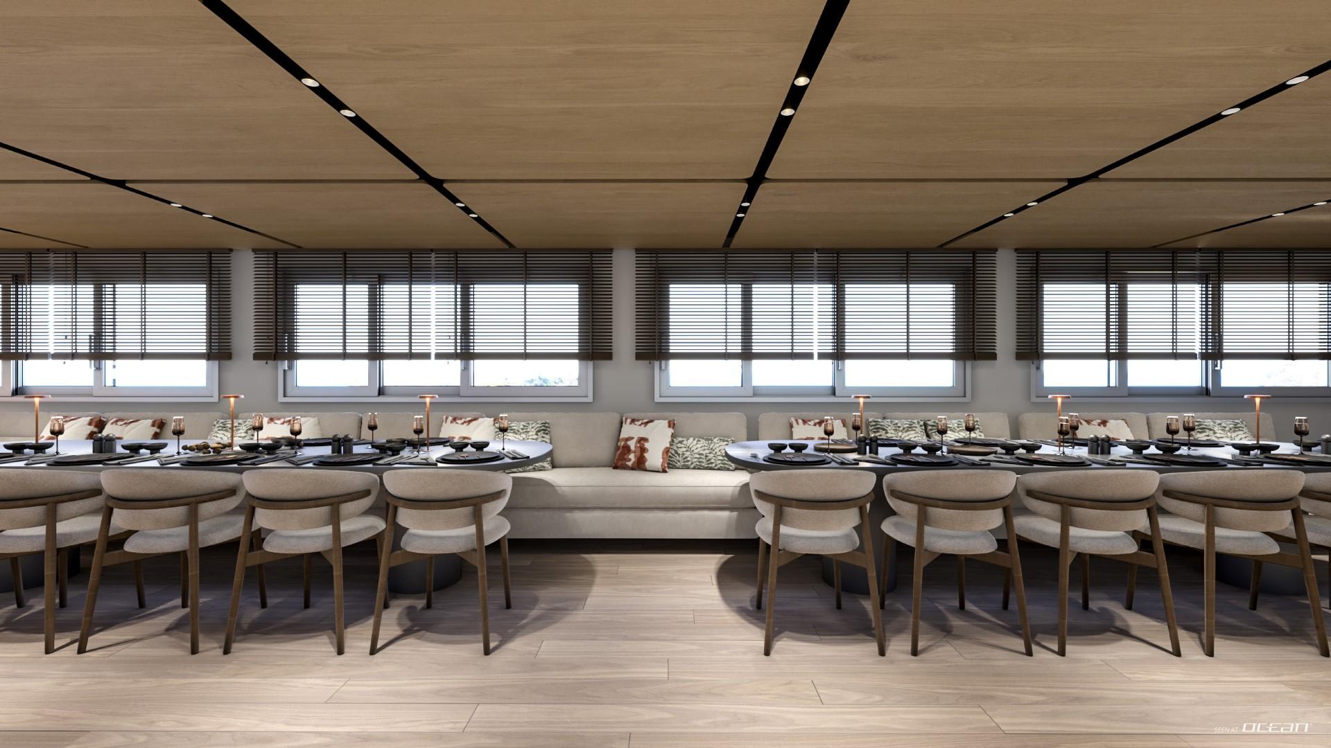 The interior reflects an elegant and minimalistic design approach, with a spacious main salon offering flexible areas for dining and relaxation. Large windows enhance the sense of openness, while direct access to the aft deck creates an easy flow between indoor and outdoor living. Exterior decks invite long days outside, complemented by a jacuzzi, sauna, private cinema, and inviting lounge areas that encourage shared moments from morning to night.