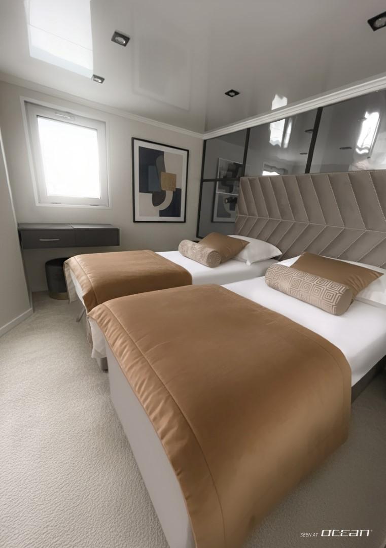 PREMIER welcomes up to 22 guests across 11 beautifully appointed cabins, all located on the upper deck and each featuring a private balcony. This unique layout allows every guest to enjoy fresh sea air and uninterrupted views directly from their own space. Contemporary styling, soft tones, and thoughtful detailing create a tranquil environment designed for rest and privacy, even with a full guest complement on board.