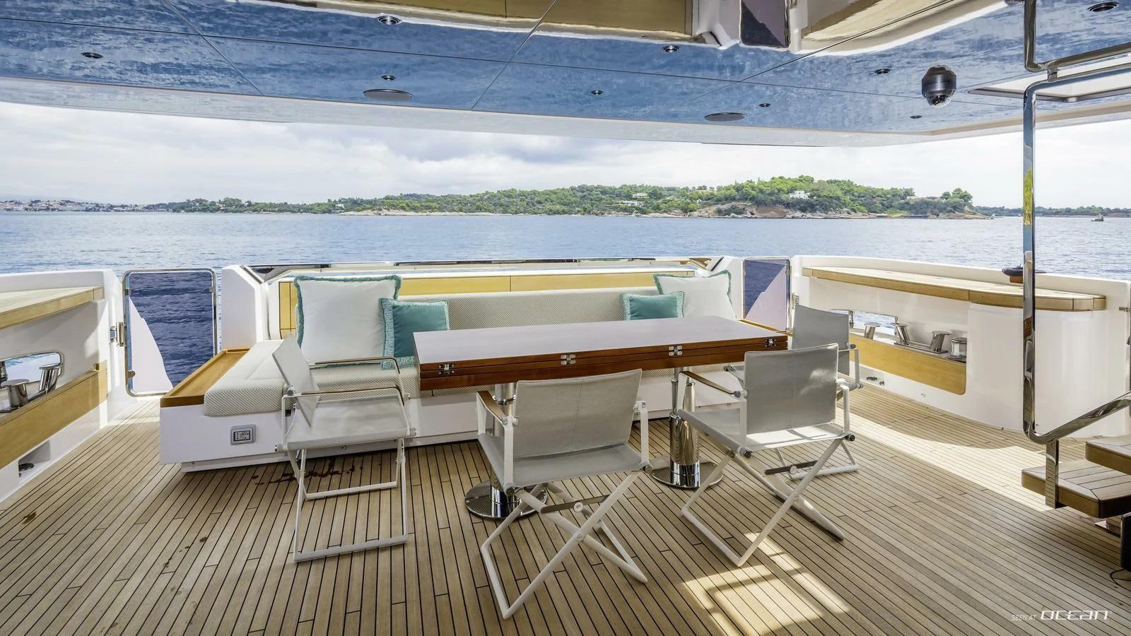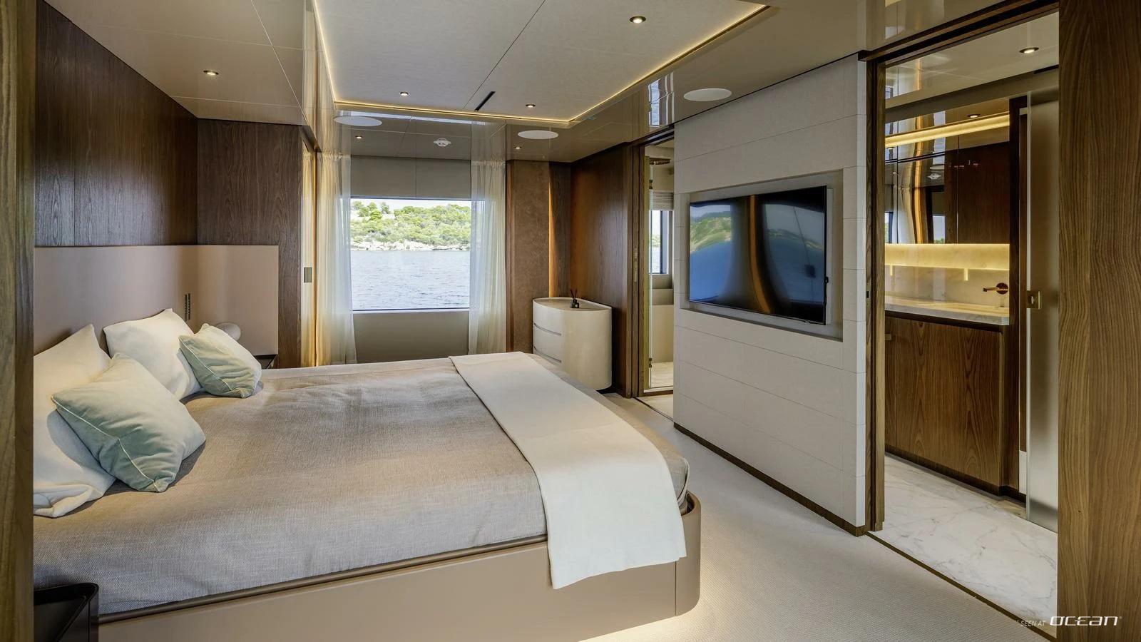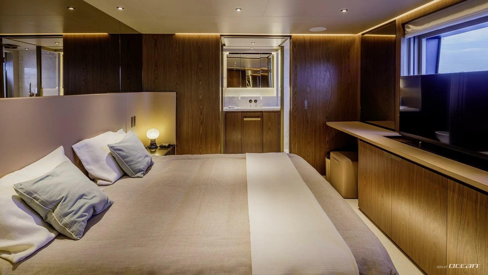 On board, Custom Line M/Y QUANT for charter offers a balanced layout that blends privacy with social living. The main deck features a spacious master suite, while 4 additional guest cabins below accommodate up to 10 guests in comfort. The salon is filled with natural light thanks to full-length windows, creating a relaxed atmosphere for both entertaining and quiet moments on board. A professional crew of 6 ensures a smooth and attentive charter experience throughout.