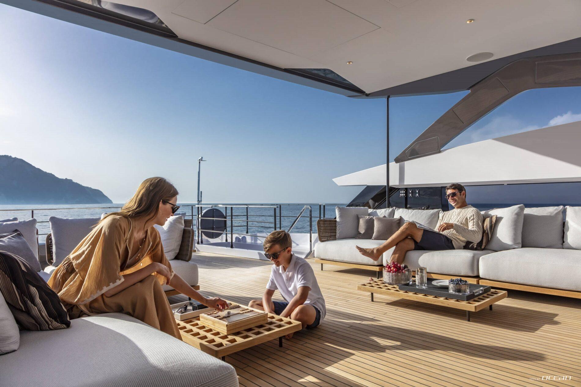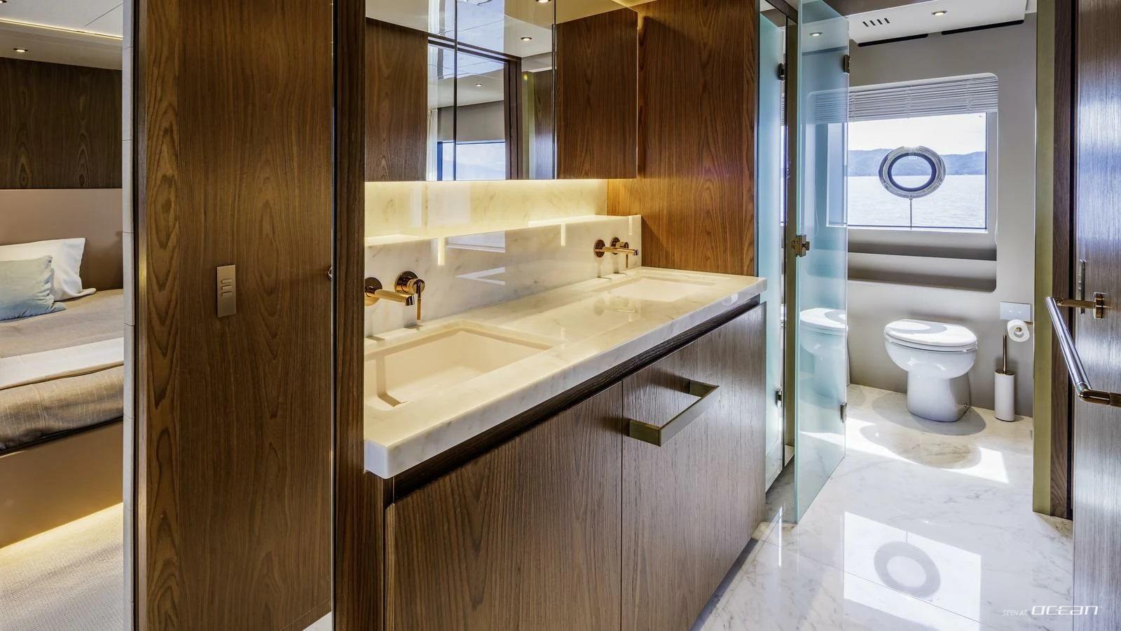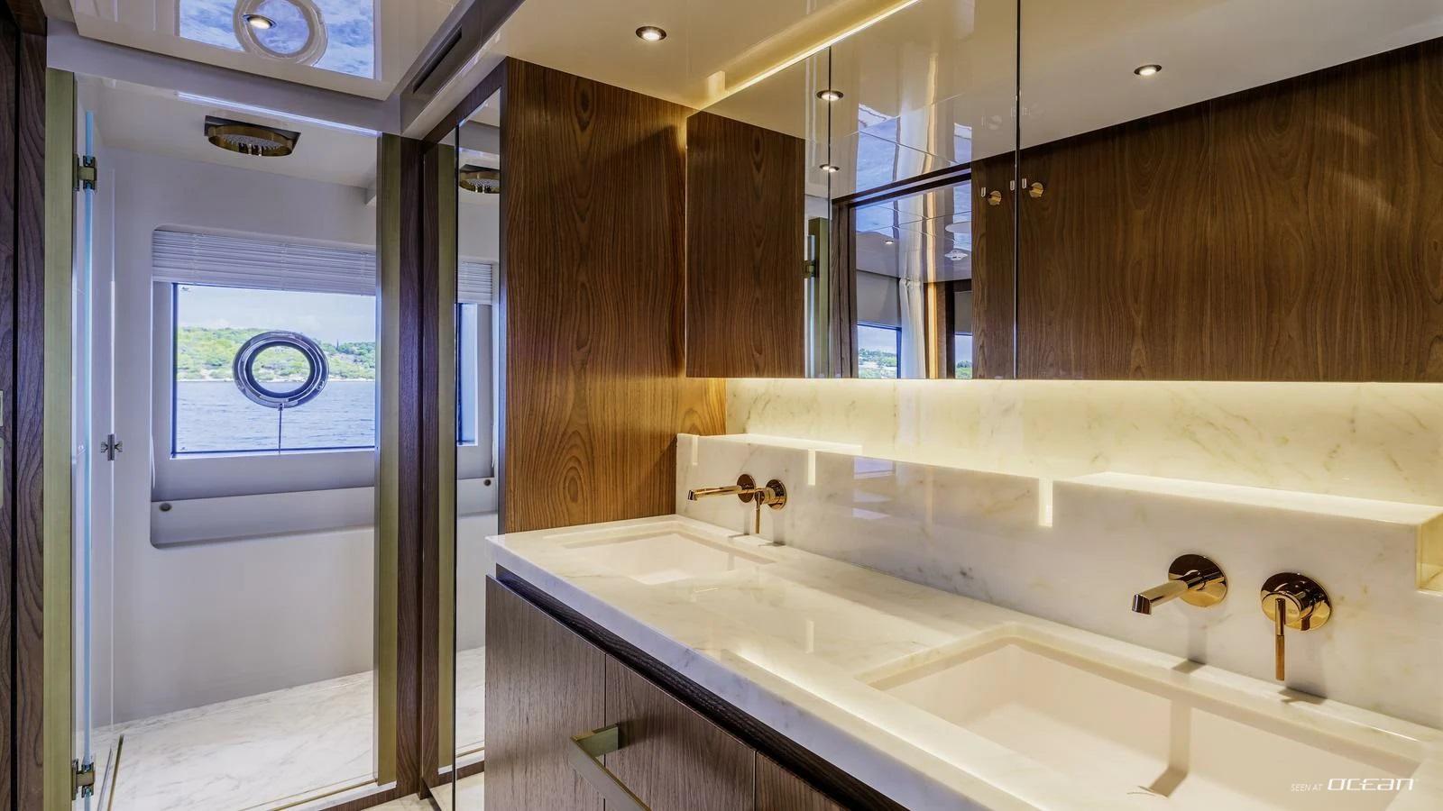 On board, Custom Line M/Y QUANT for charter offers a balanced layout that blends privacy with social living. The main deck features a spacious master suite, while 4 additional guest cabins below accommodate up to 10 guests in comfort. The salon is filled with natural light thanks to full-length windows, creating a relaxed atmosphere for both entertaining and quiet moments on board. A professional crew of 6 ensures a smooth and attentive charter experience throughout.