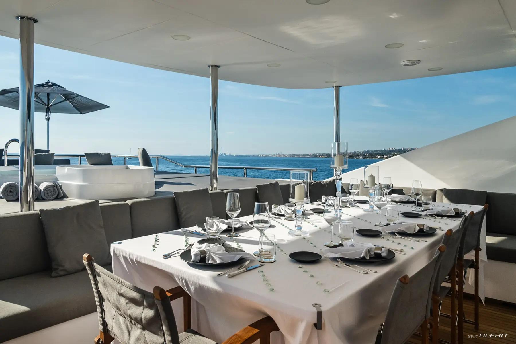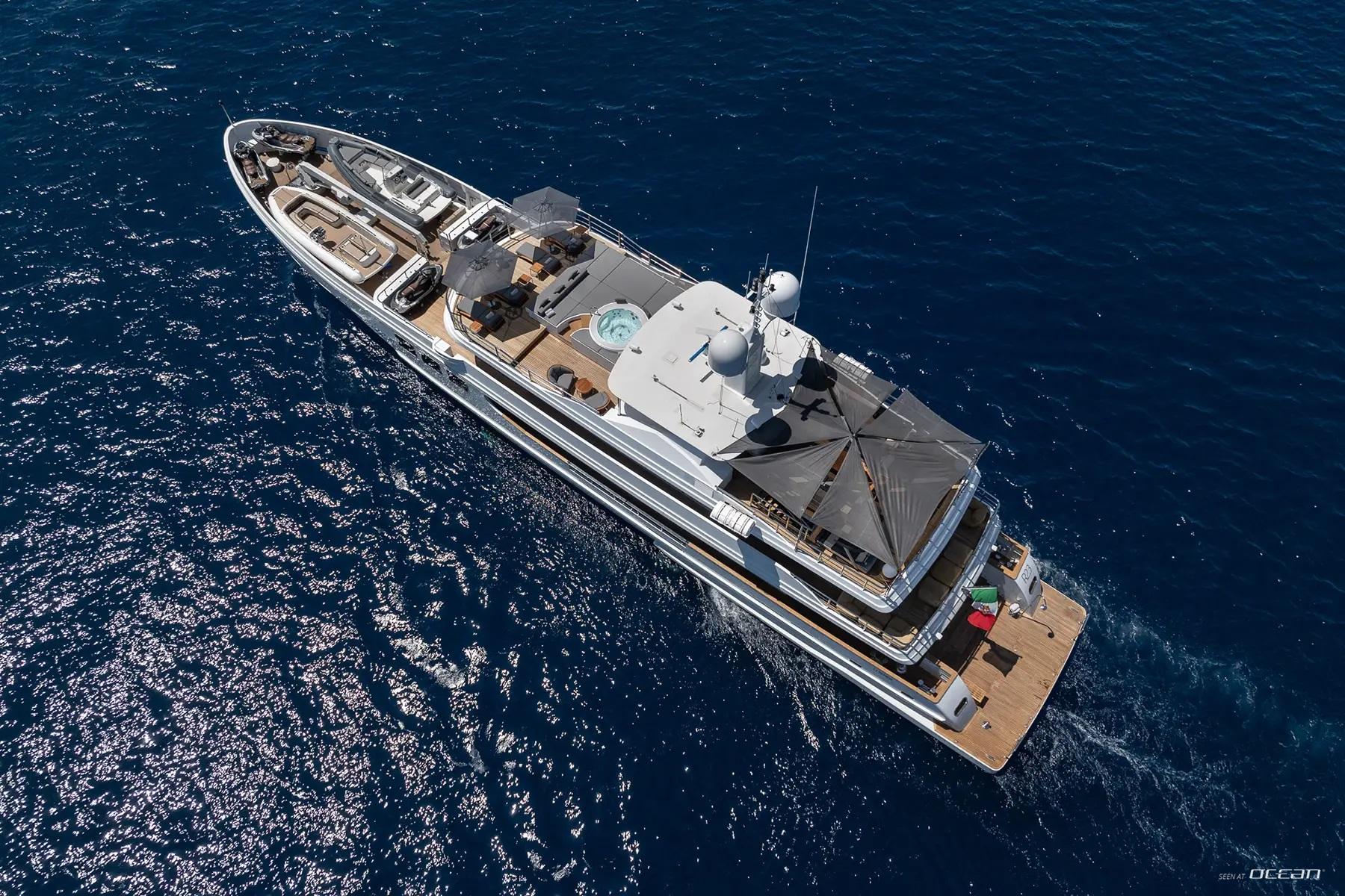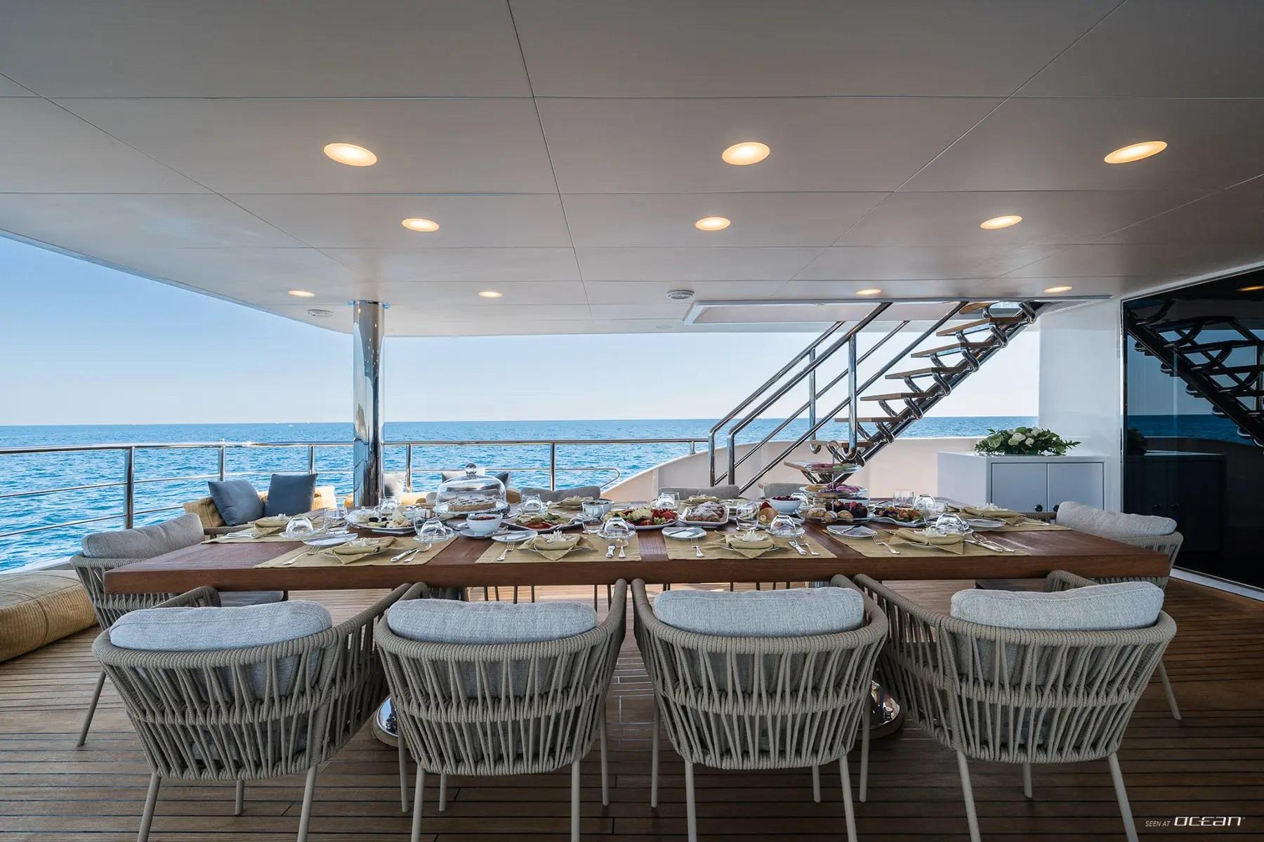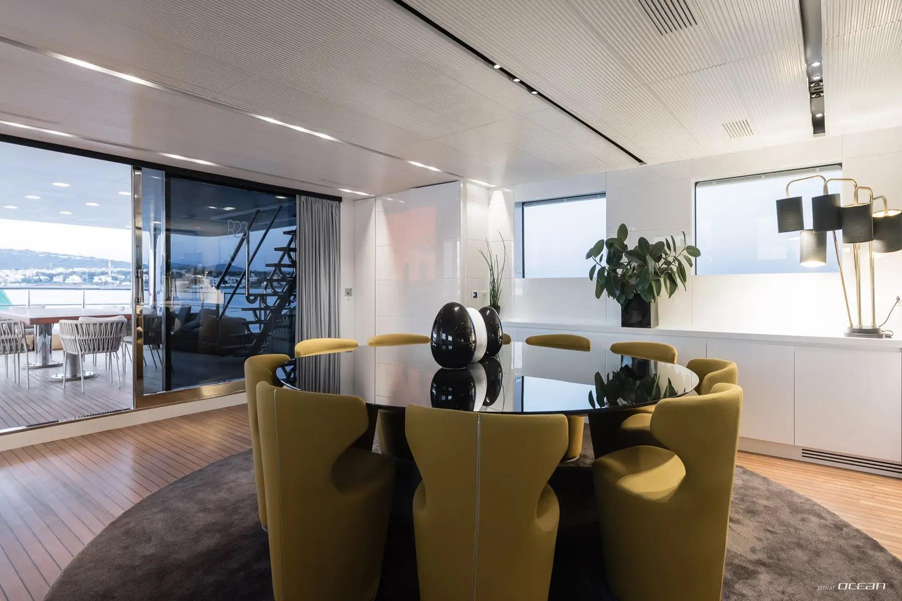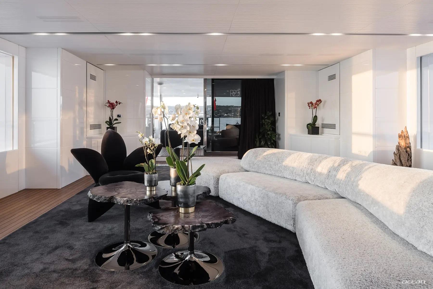 R23 boasts a 60-square-meter sun deck complete with a bar and lounge, ideal for hosting events or relaxing in the sun. Her redesigned stern and upper deck spaces provide generous areas for alfresco dining and social gatherings, accommodating up to 100 guests for cocktail receptions at the quay. The yacht’s sleek, light grey hull and white superstructures complement her modern, minimalist aesthetic.