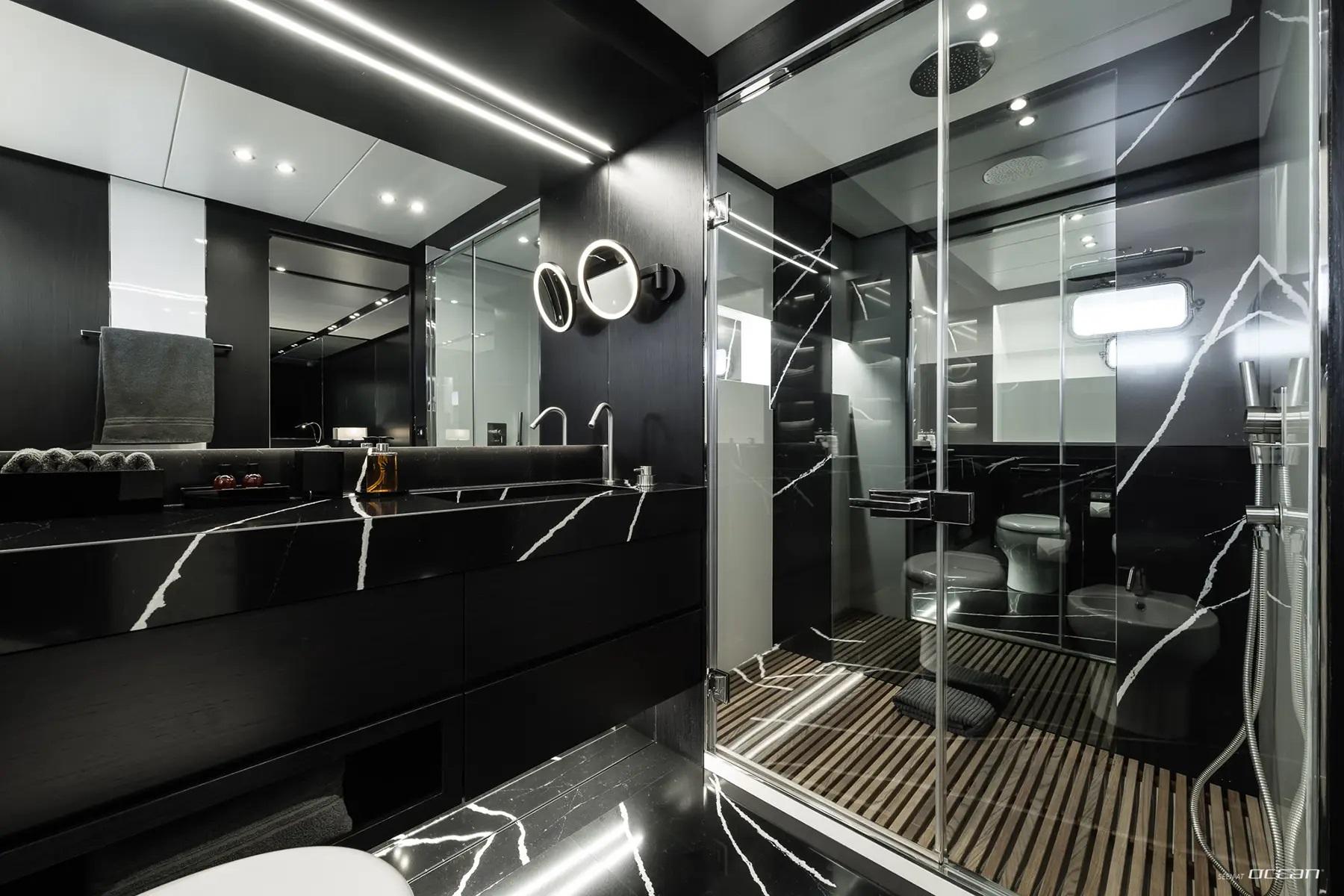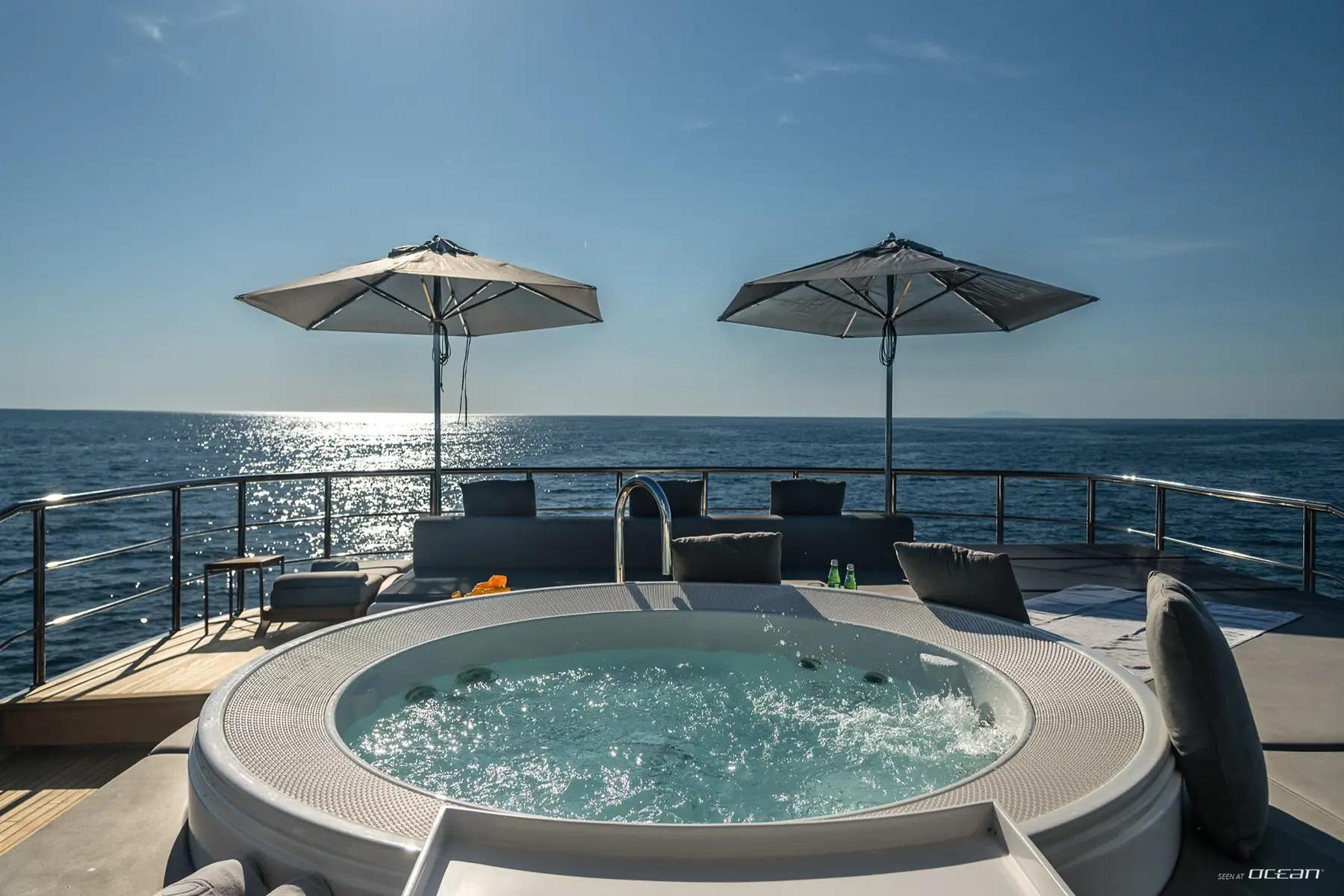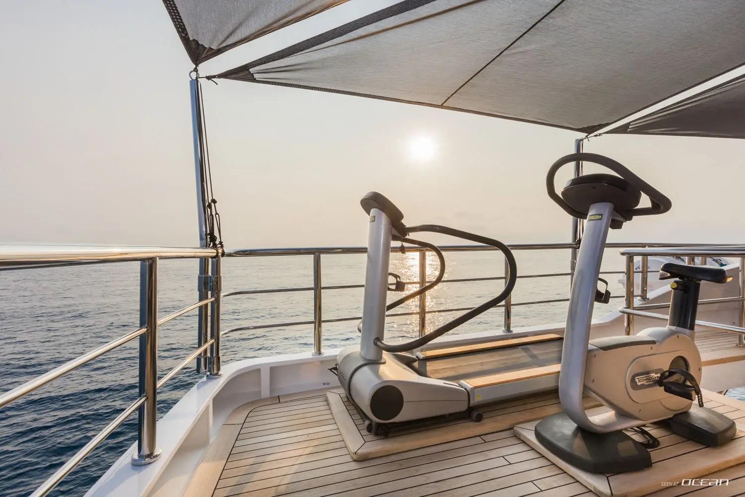 All cabins with en-suite bathrooms, air condition throughout, generator, deck jacuzzi, stabilizers at anchor, stabilizers underway, TV in all cabins, Dolby surround system, Denon system for music in air play, Wi-Fi internet, gym gear, and a variety of water toys.