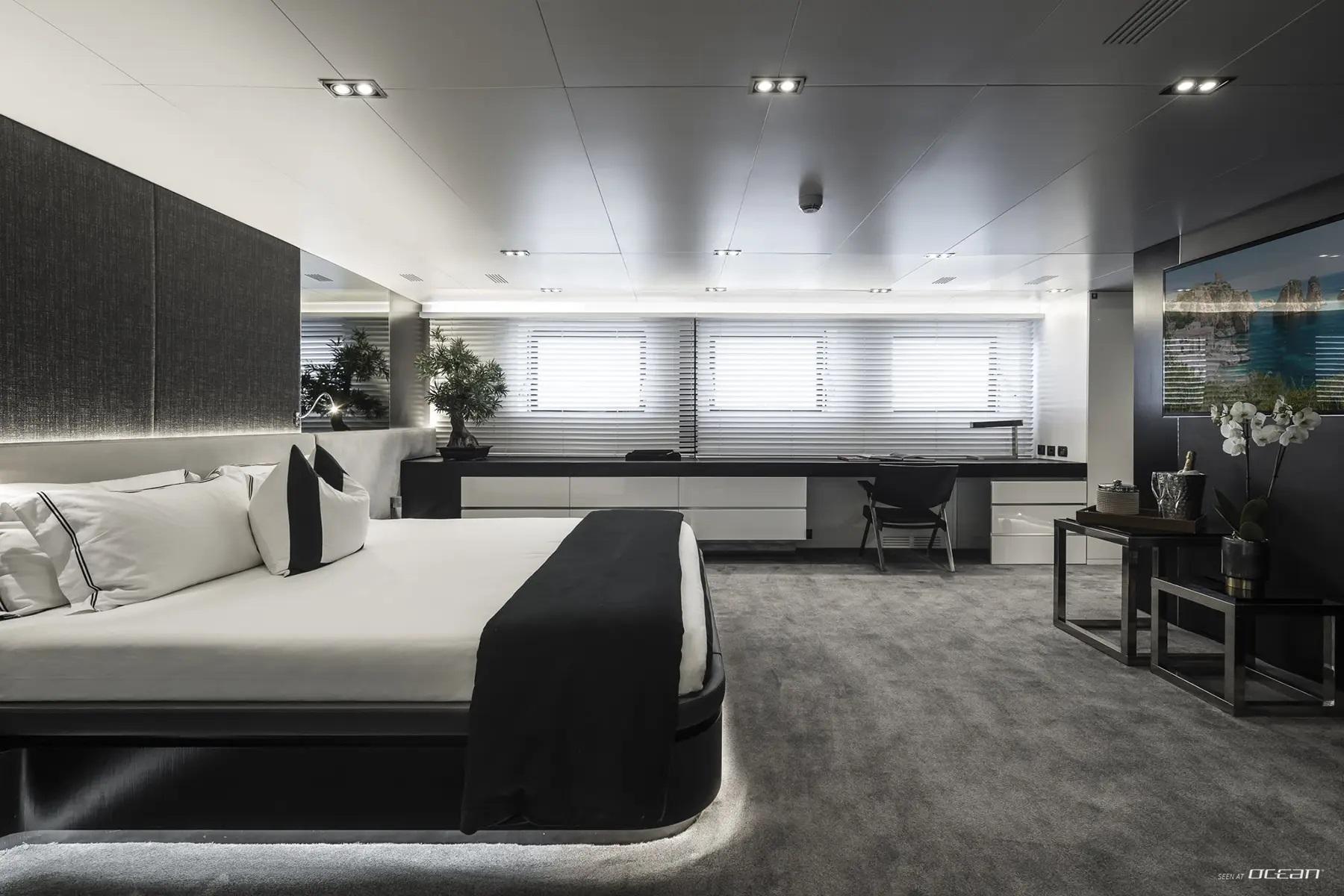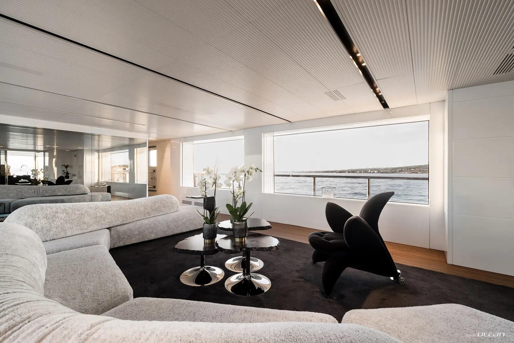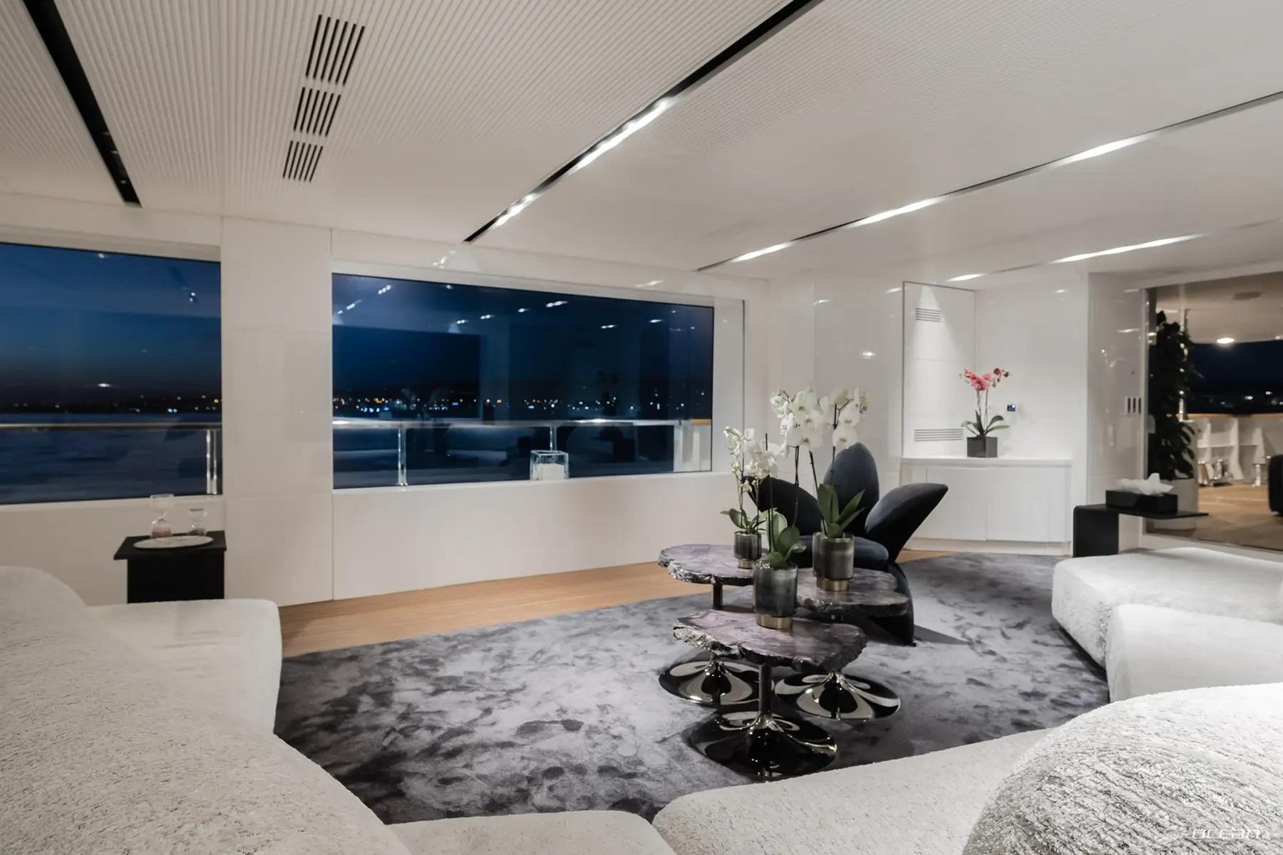 R23 luxury motor yacht for charter provides versatile accommodation suitable for families or groups of friends, offering multiple cabin configurations and ample indoor and outdoor spaces. The main deck features a grand salon with expansive sofas and elegant designer touches, while the master suite has been fully updated with black-and-white furnishings. The upper deck sky lounge serves as a sophisticated dining area, ensuring comfort and style for all guests.