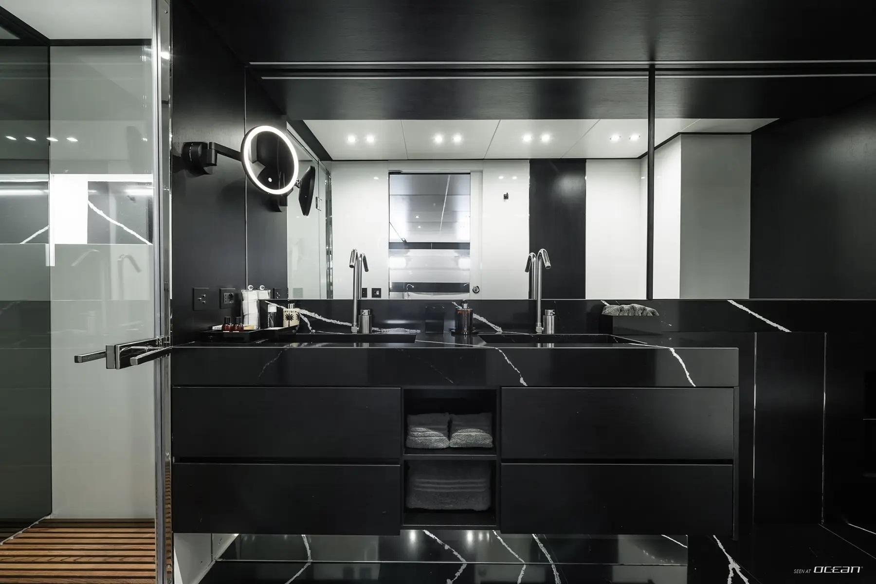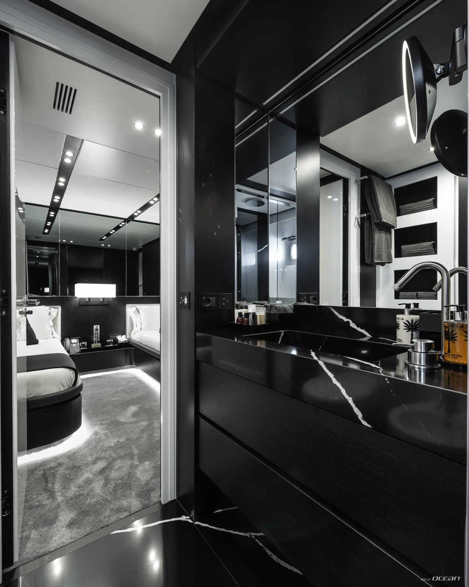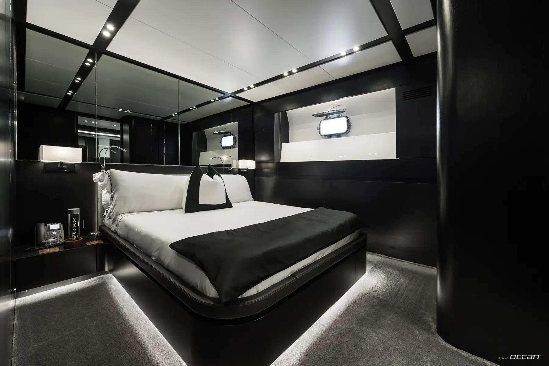 R23 luxury motor yacht for charter provides versatile accommodation suitable for families or groups of friends, offering multiple cabin configurations and ample indoor and outdoor spaces. The main deck features a grand salon with expansive sofas and elegant designer touches, while the master suite has been fully updated with black-and-white furnishings. The upper deck sky lounge serves as a sophisticated dining area, ensuring comfort and style for all guests.