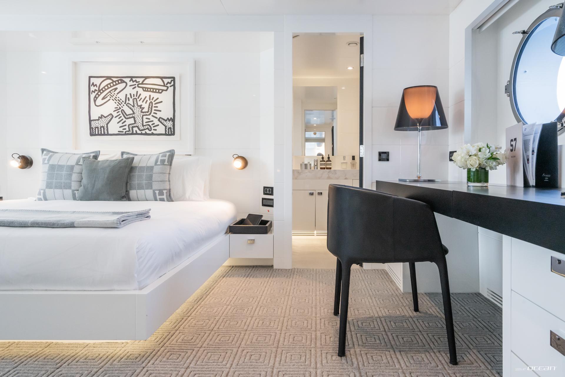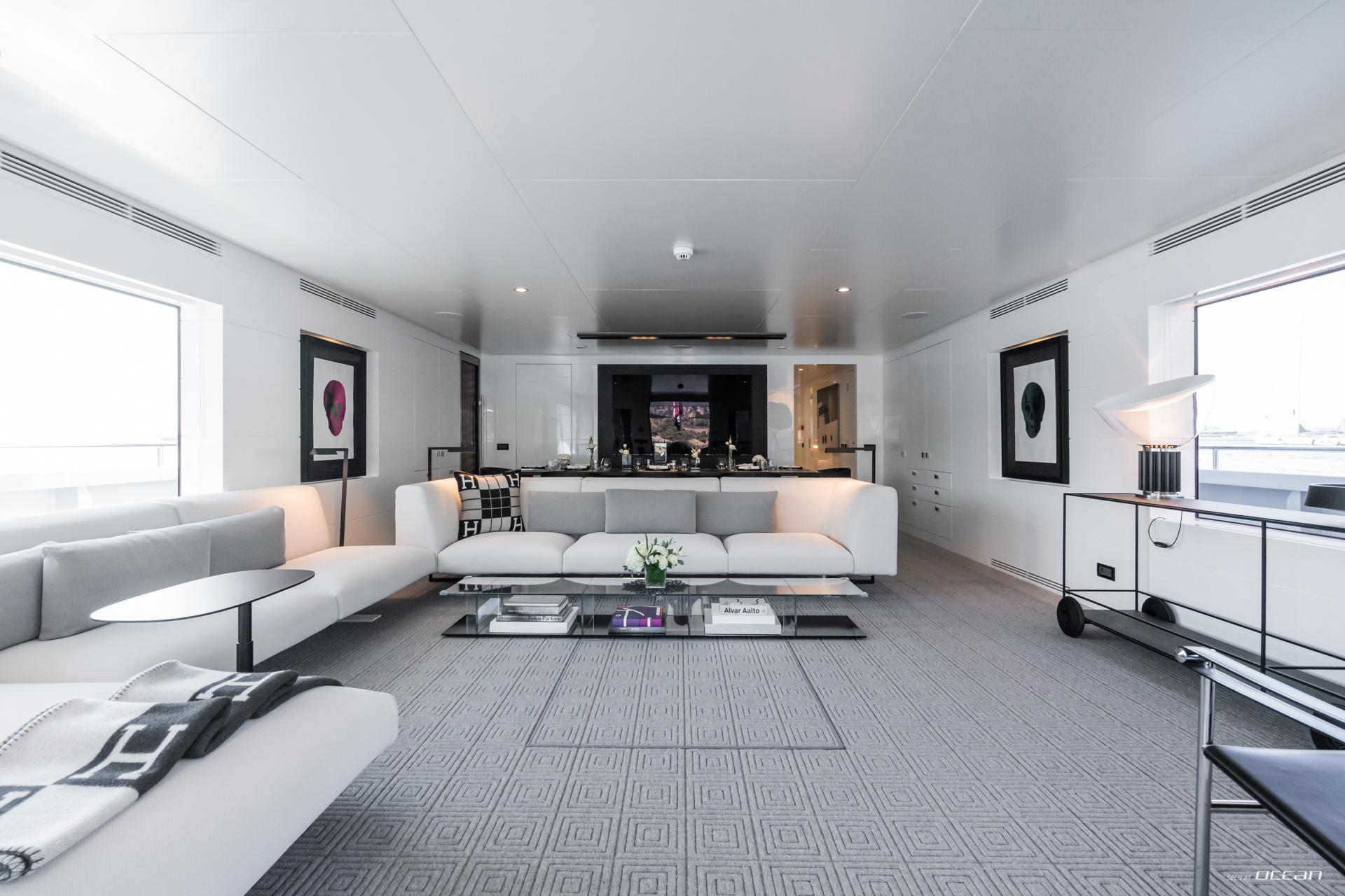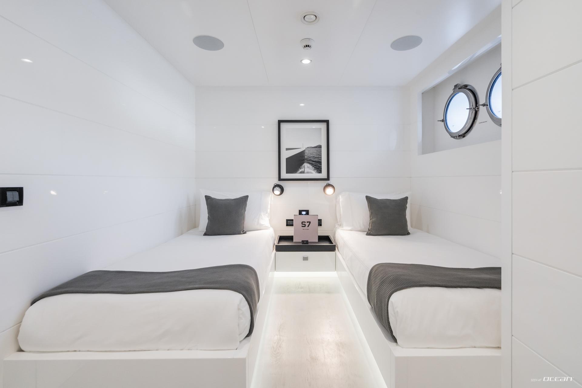 Inside, S7 presents a bright and minimalist interior with panoramic windows and a welcoming main salon with dining area and wine fridge. Accommodation is arranged for up to 12 guests in 5 en-suite cabins, including 3 doubles and 2 twins with additional Pullman berths. The full-beam master suite features an office space and separate his-and-hers bathrooms with a central rain shower. Luxury motor yacht charter in Caribbean or Mediterranean waters becomes a refined and easygoing escape on board S7.