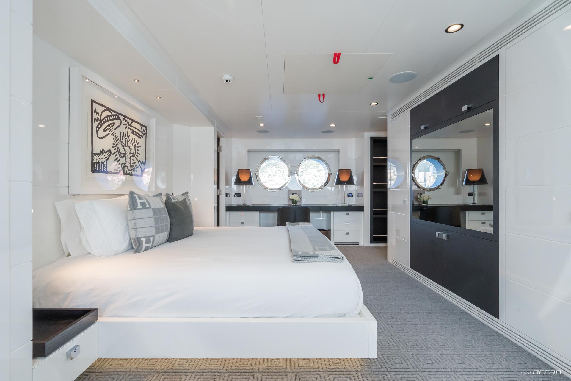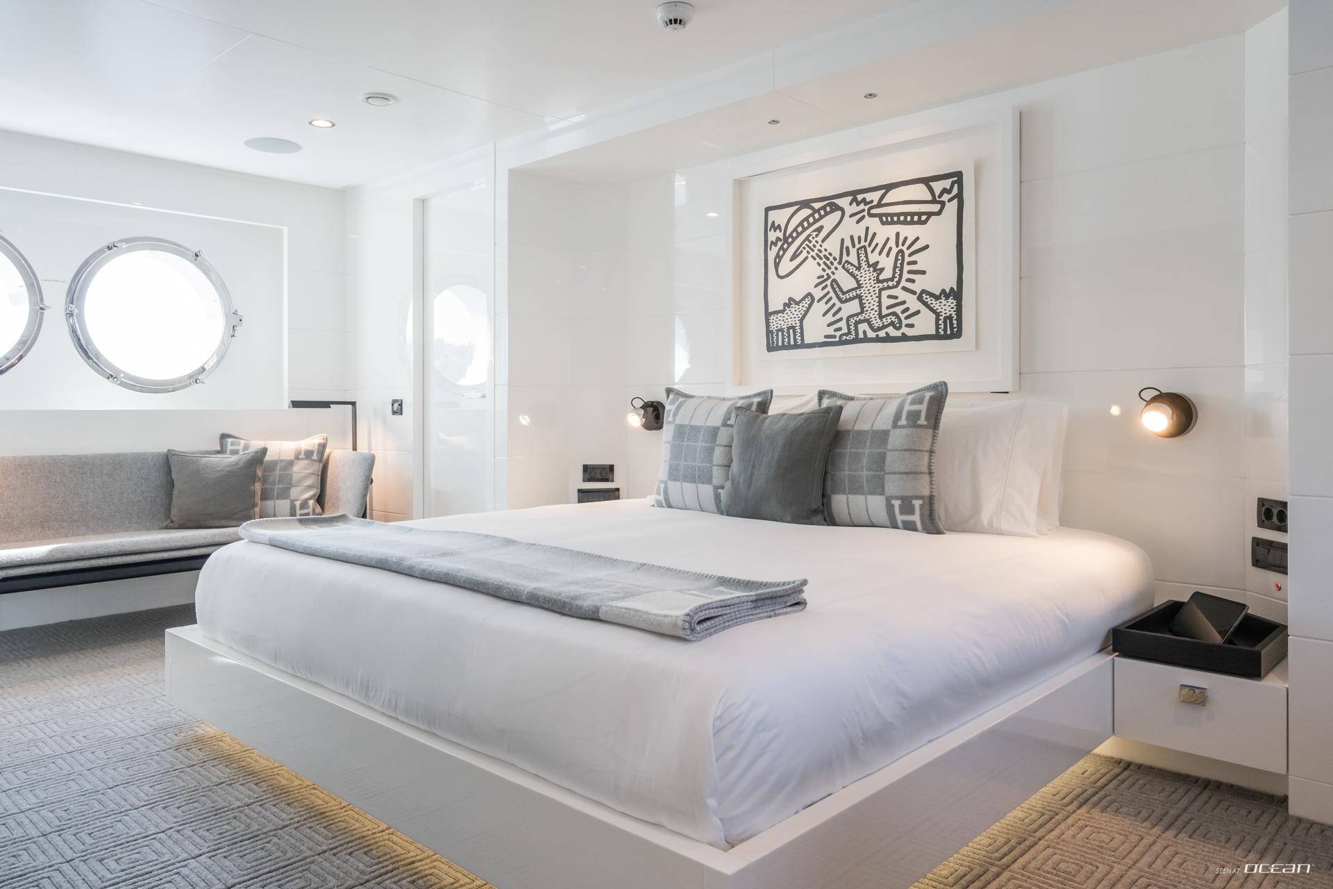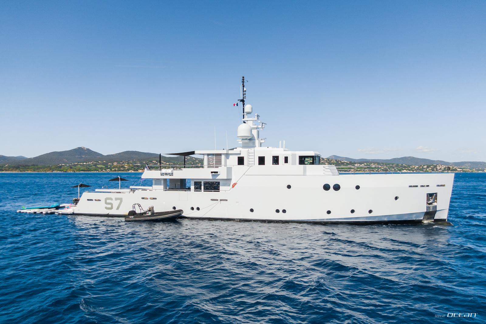 Inside, S7 presents a bright and minimalist interior with panoramic windows and a welcoming main salon with dining area and wine fridge. Accommodation is arranged for up to 12 guests in 5 en-suite cabins, including 3 doubles and 2 twins with additional Pullman berths. The full-beam master suite features an office space and separate his-and-hers bathrooms with a central rain shower. Luxury motor yacht charter in Caribbean or Mediterranean waters becomes a refined and easygoing escape on board S7.