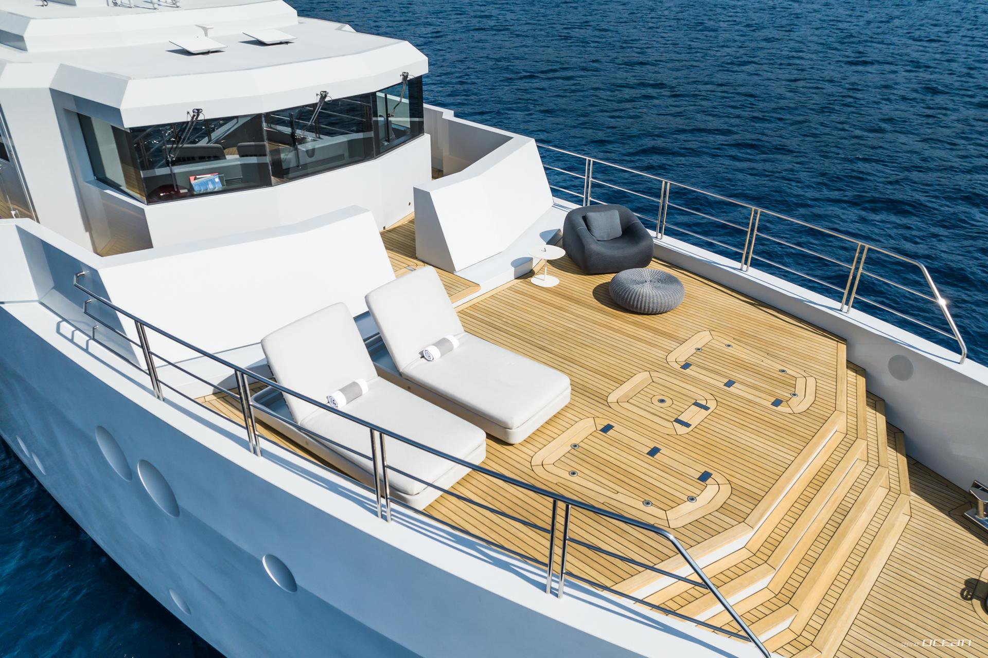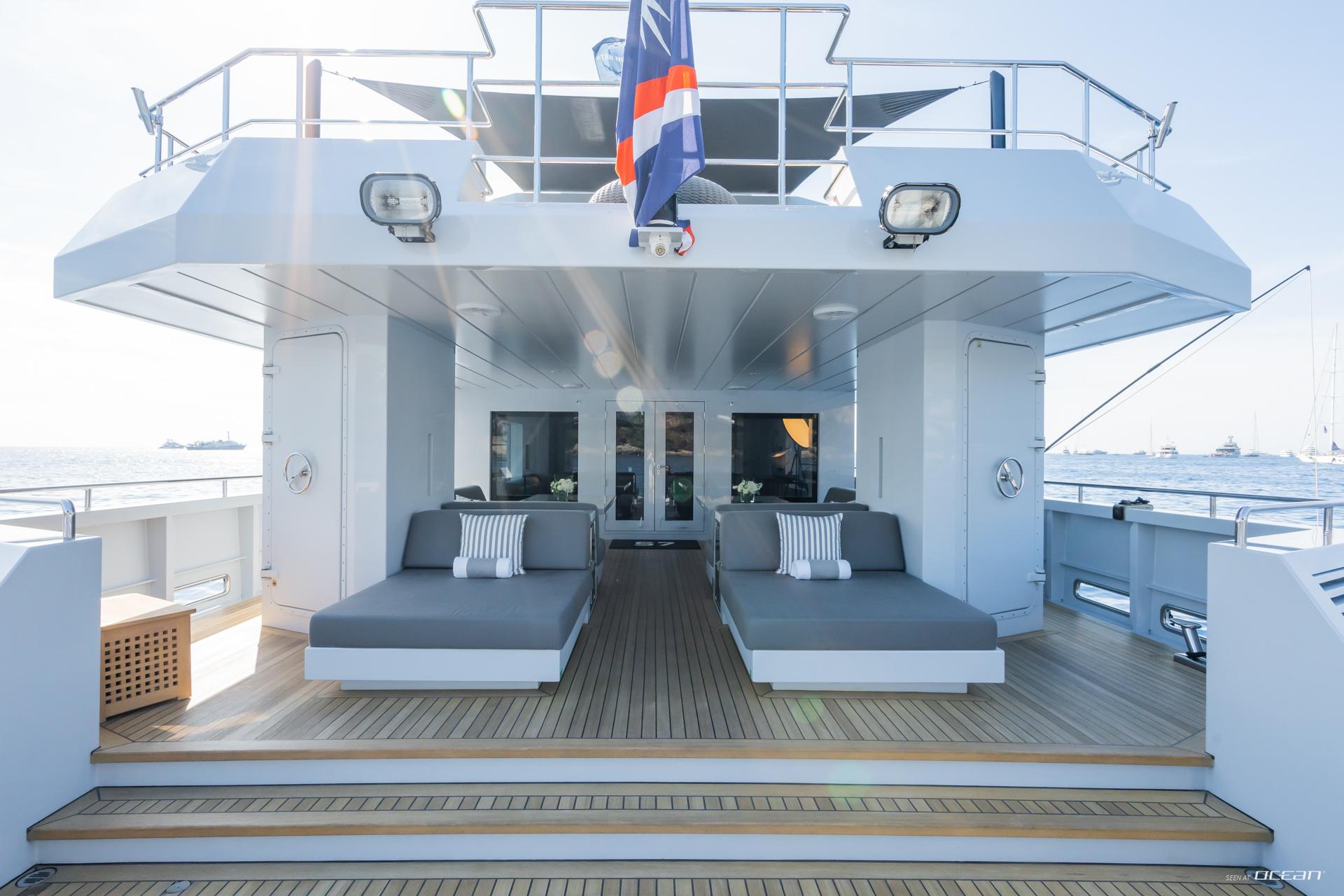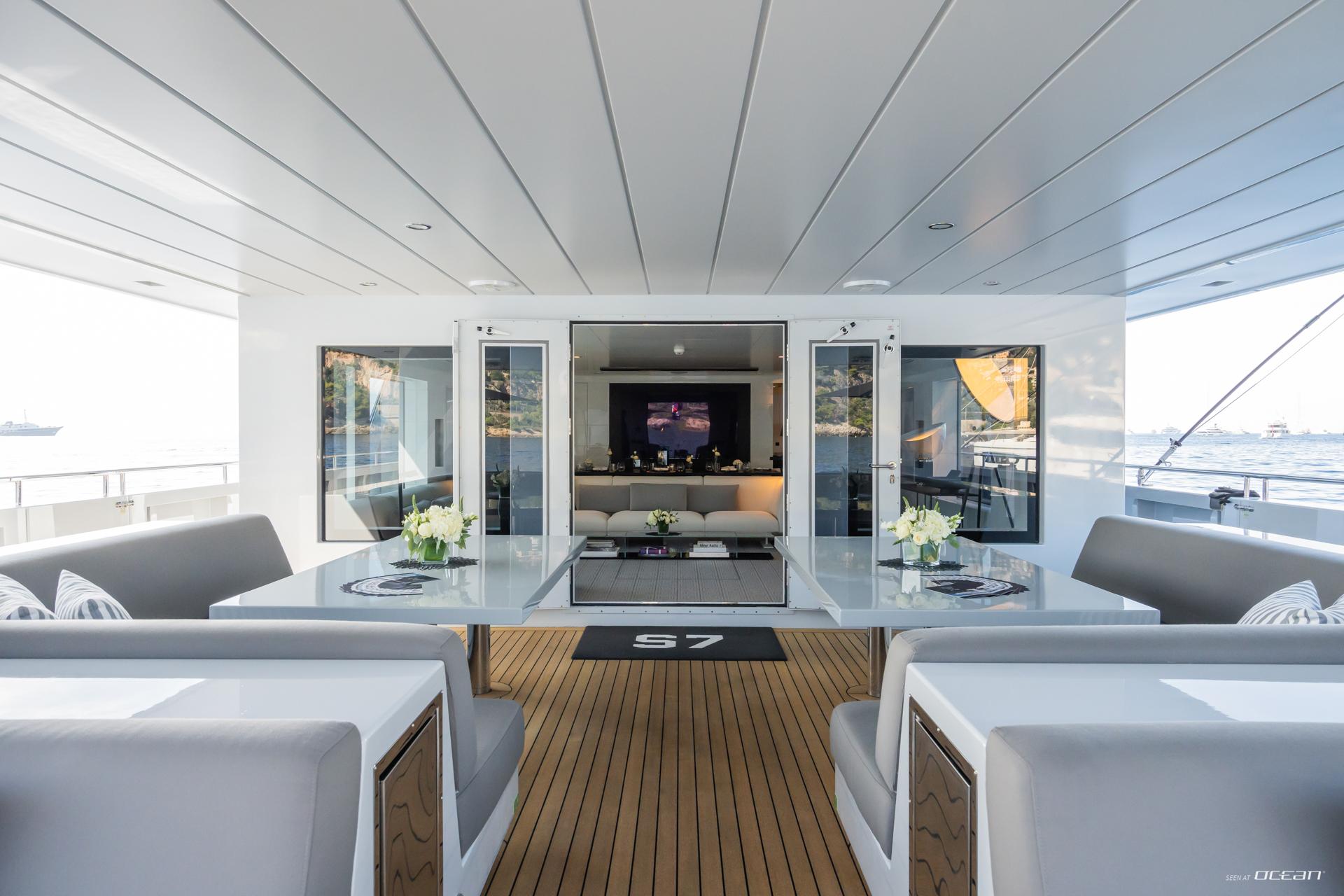 Outdoor areas define life on board luxury motor yacht S7 for charter, with a vast aft deck offering space for sunbathing, water sports, or casual lounging. The expansive sundeck features a central bar with panoramic views, retractable roof, and generous sun pads for all-day relaxation. Shaded dining areas on the main deck invite long lunches and sunset gatherings. This layout makes S7 an ideal choice for West Med Yacht Charter and Caribbean cruising alike.