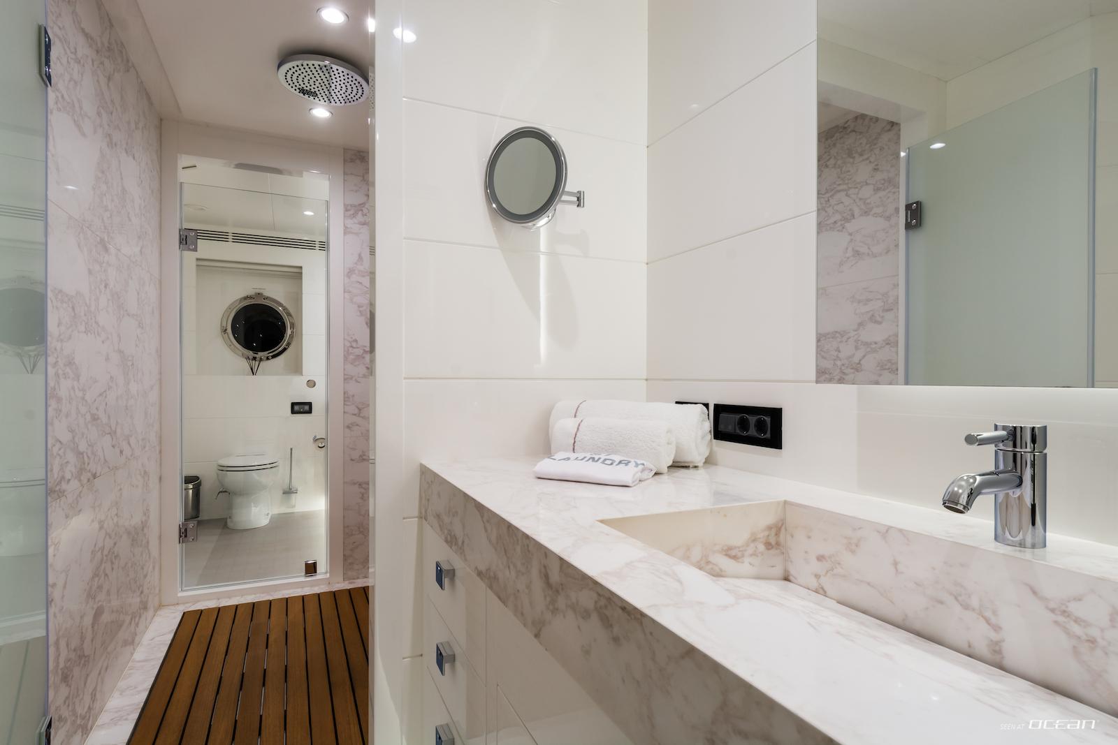 All cabins with en-suite bathrooms, air condition throughout, 2 generators, stabilizers at anchor, stabilizers underway, teak deck, smart TVs in salon and all cabins, Apple TV, Hulu, Netflix, Spotify, speakers in all outside areas, Starlink Wi-Fi internet, swimming platform, and a variety of water toys.