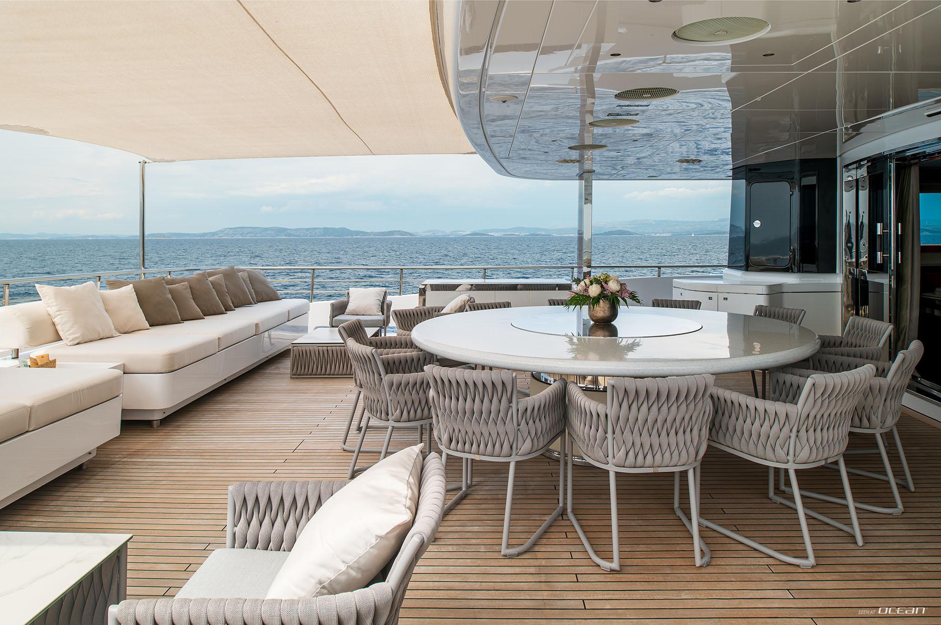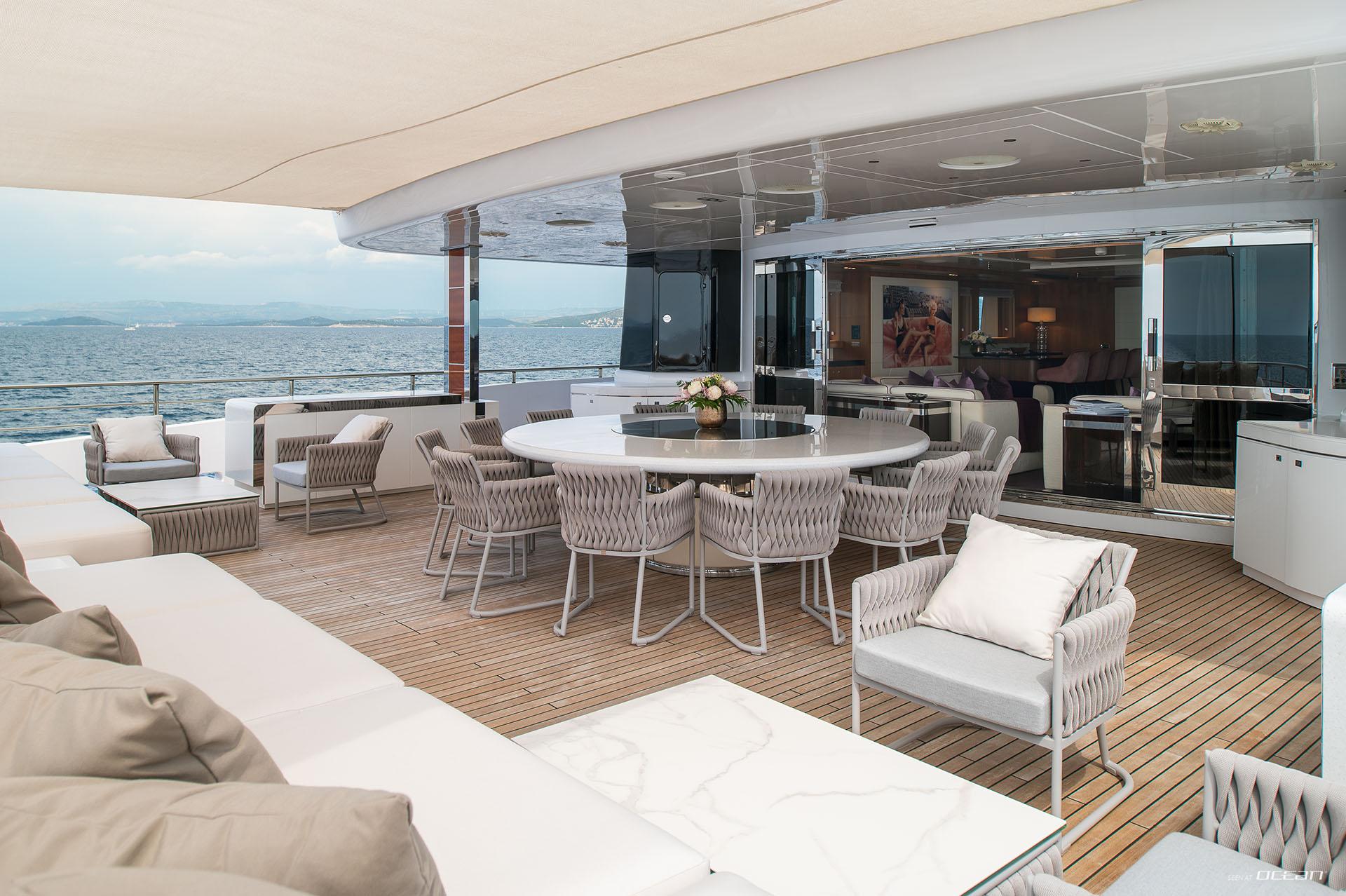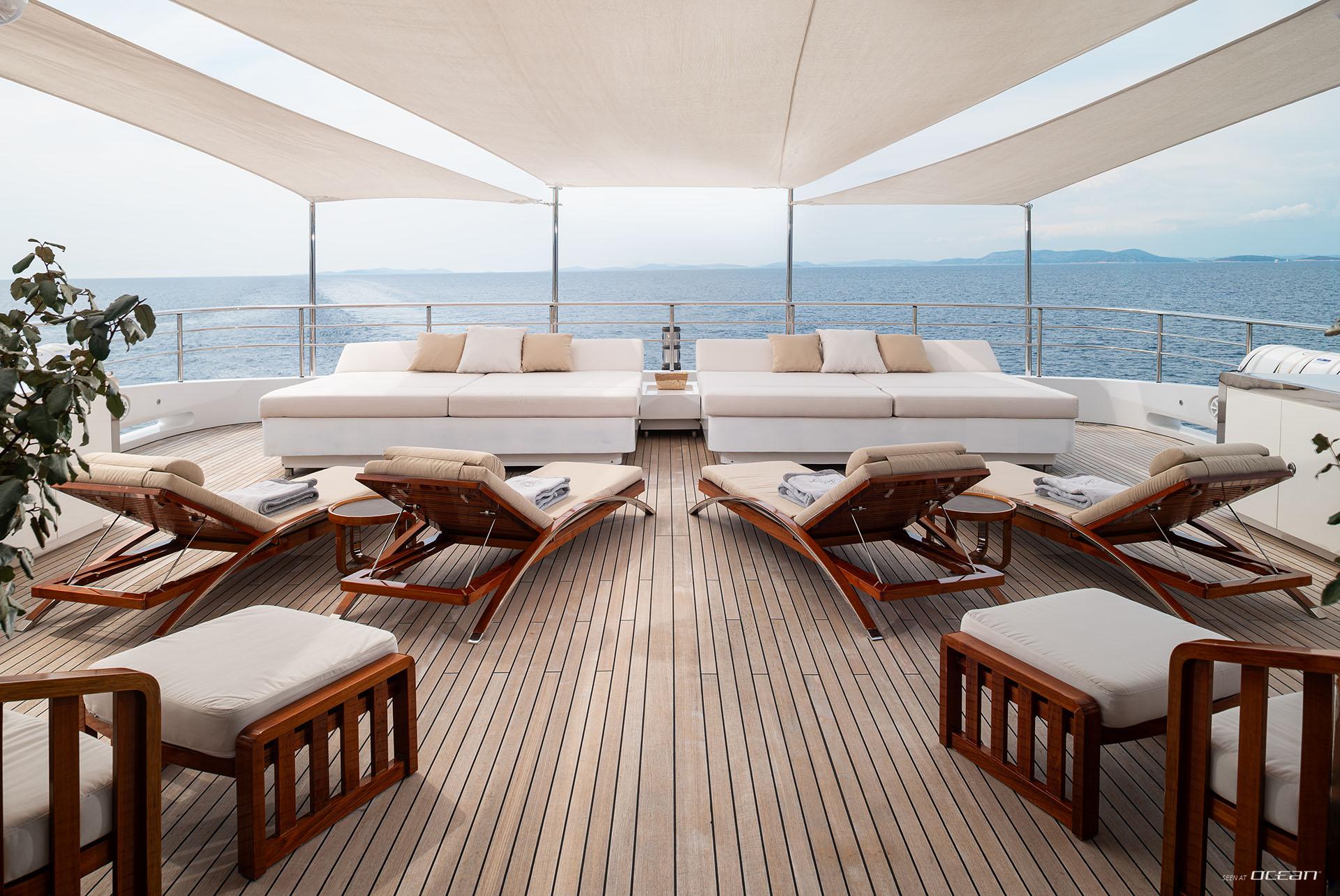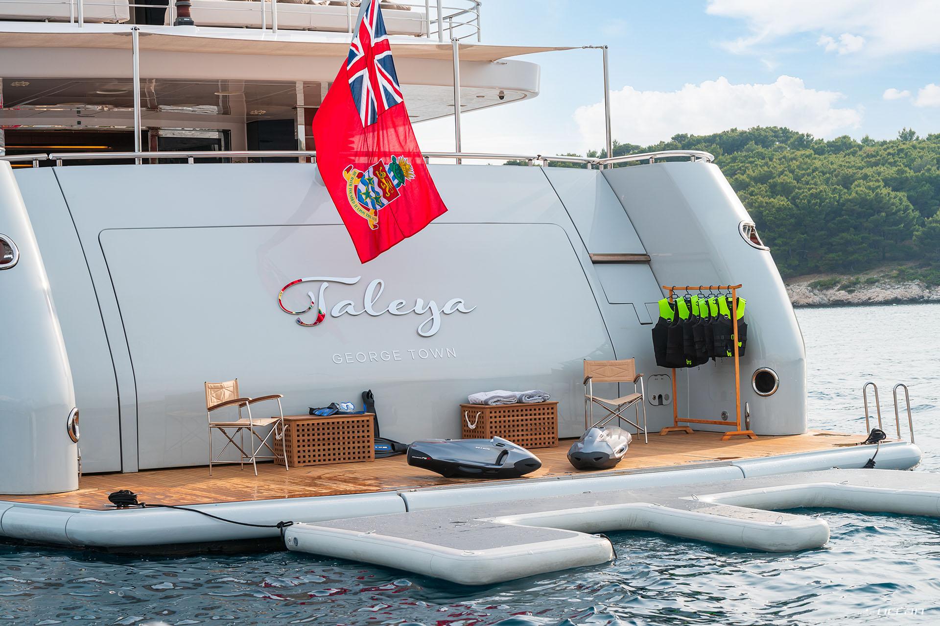 Outdoor areas are designed for leisure and entertainment, with a sun deck featuring a Jacuzzi surrounded by cushioned sun pads, freestanding loungers, and alfresco dining options. The extended swim platform with lowering steps provides seamless access to the water. Superyacht TALEYA offers an extensive collection of water toys, including a 12m chase tender, a 7m jet tender, SeaBobs, jet skis, waterskis, boards, and various inflatables, ensuring fun for all ages.