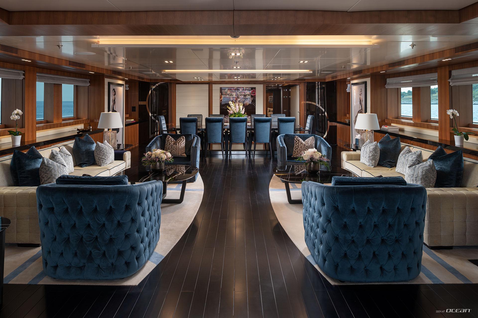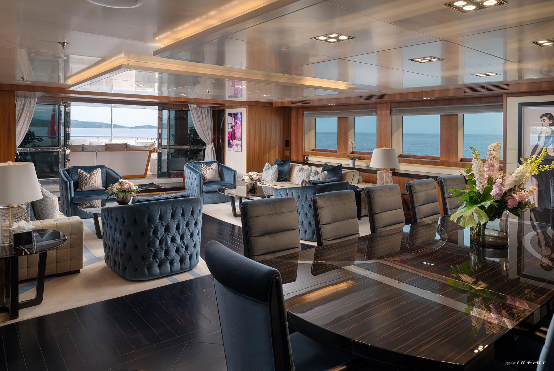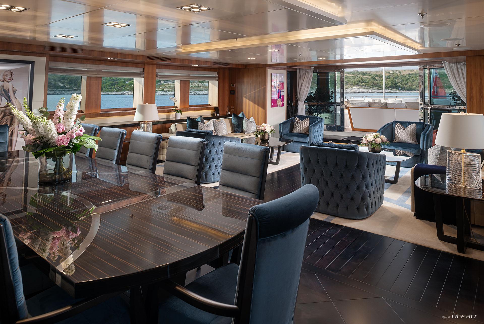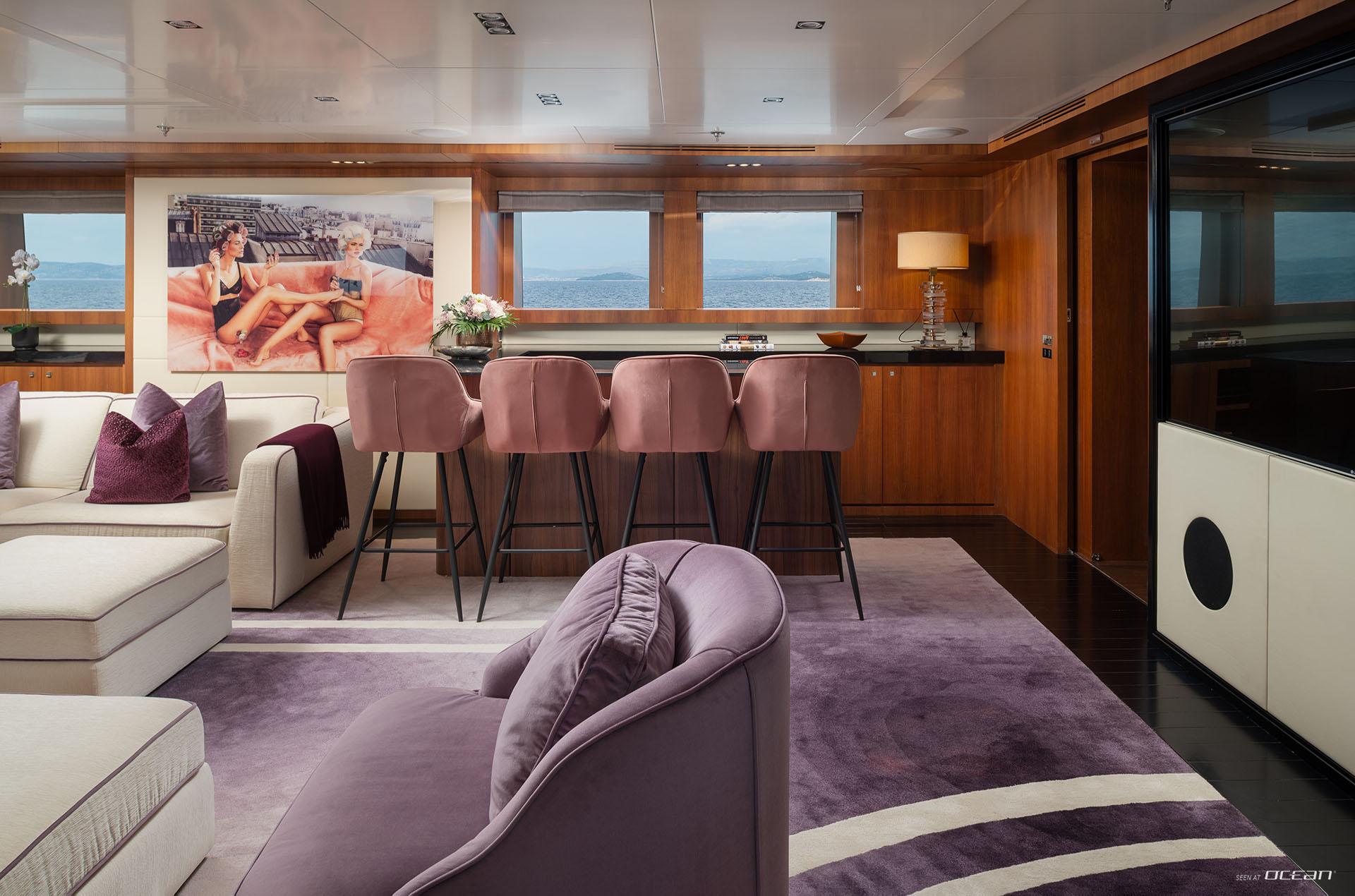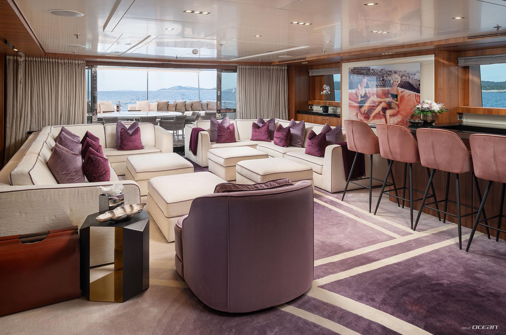 Outdoor areas are designed for leisure and entertainment, with a sun deck featuring a Jacuzzi surrounded by cushioned sun pads, freestanding loungers, and alfresco dining options. The extended swim platform with lowering steps provides seamless access to the water. Superyacht TALEYA offers an extensive collection of water toys, including a 12m chase tender, a 7m jet tender, SeaBobs, jet skis, waterskis, boards, and various inflatables, ensuring fun for all ages.