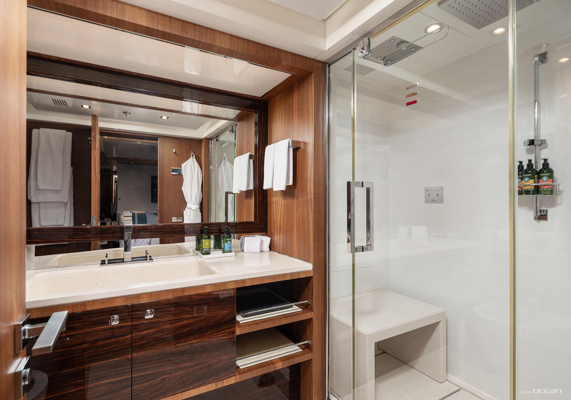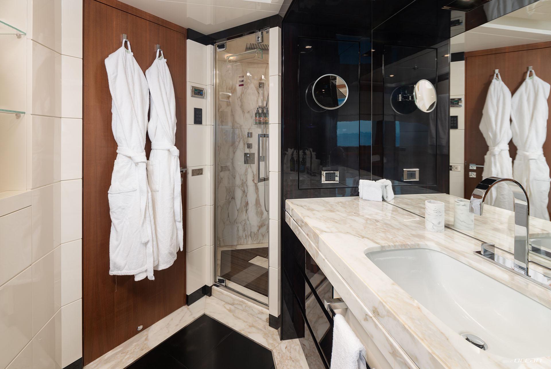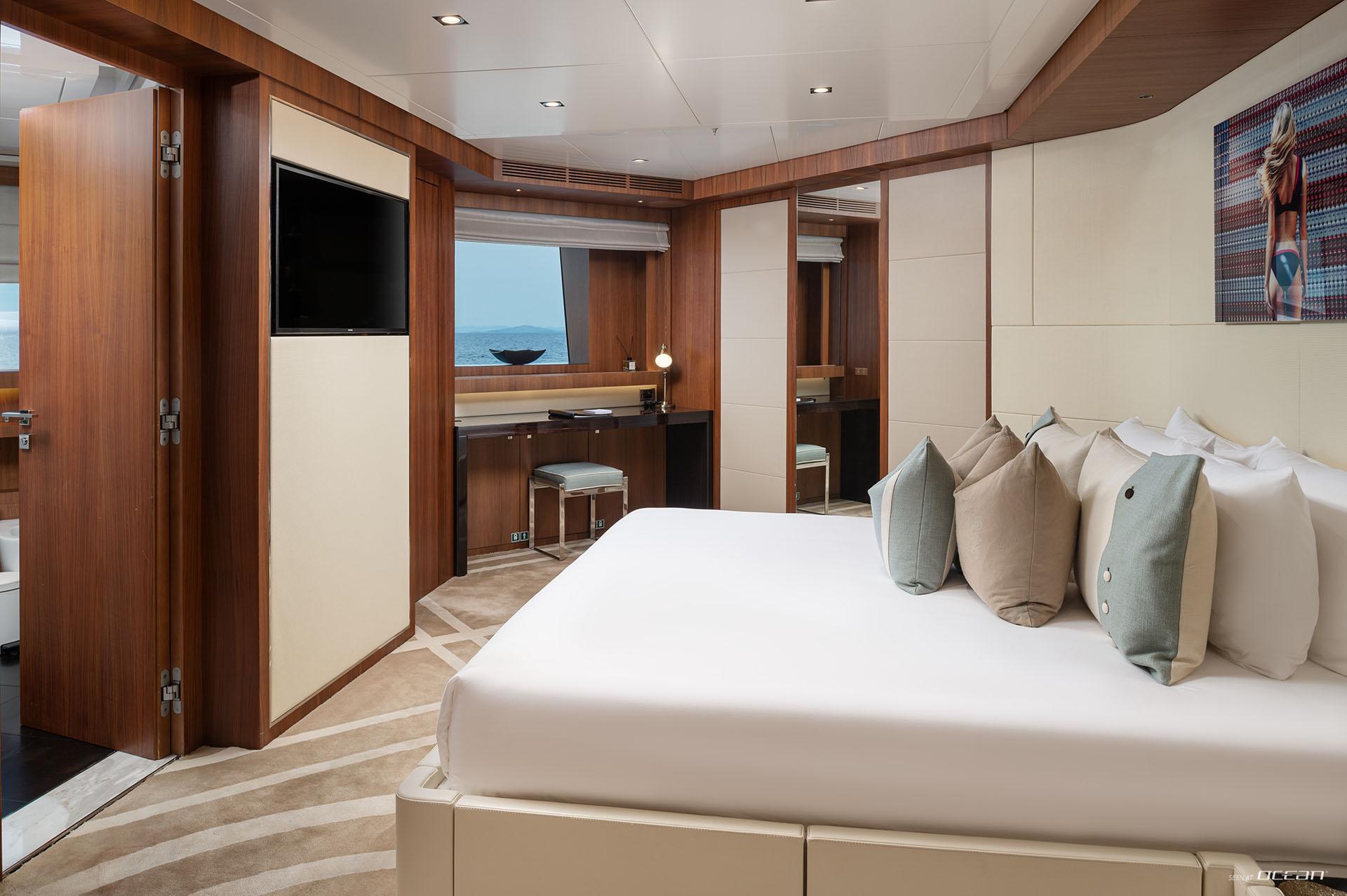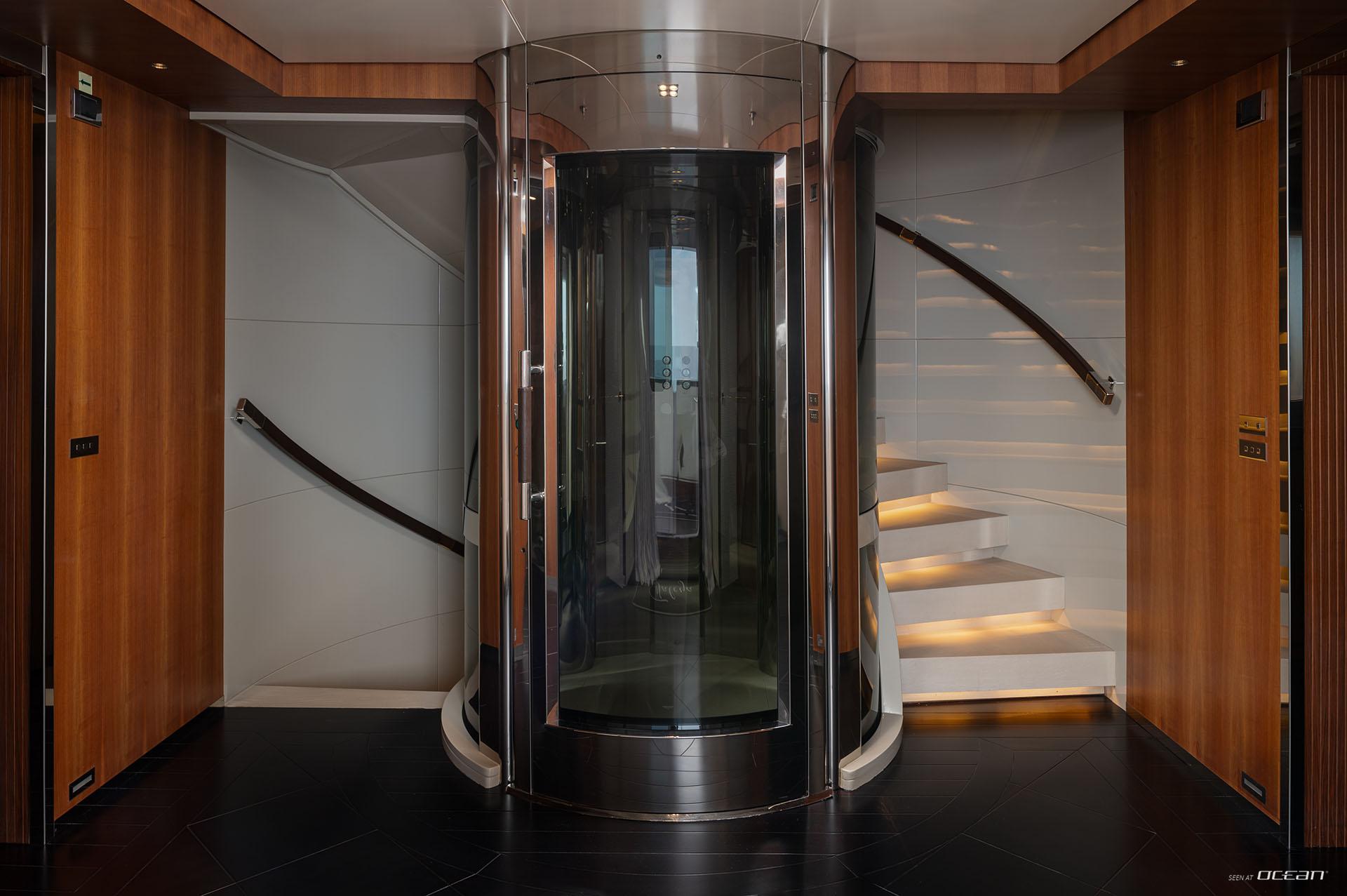 En-suite bathrooms in all cabins, master cabin with private office and walk-in wardrobe, air condition throughout, 3 generators, zero-speed stabilizers, stabilizers underway, Wi-Fi internet via Starlink, Crestron control system, TV in all cabins, Movie and music library, PlayStation 4, elevator connecting all decks, fully equipped gym, sky lounge with 220-inch cinema screen, jacuzzi on sundeck, 2 meters extension swimming platform, underwater lights, hydraulic side boarding ladder on port and starboard, 2 meter wide hydraulic swimming steps into water, and a variety of water toys.