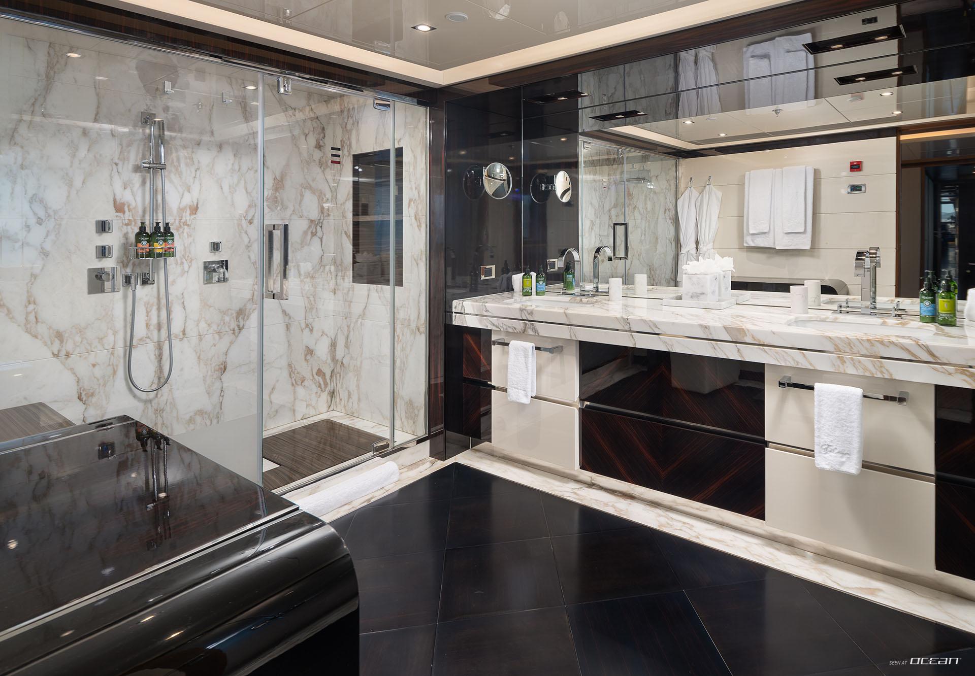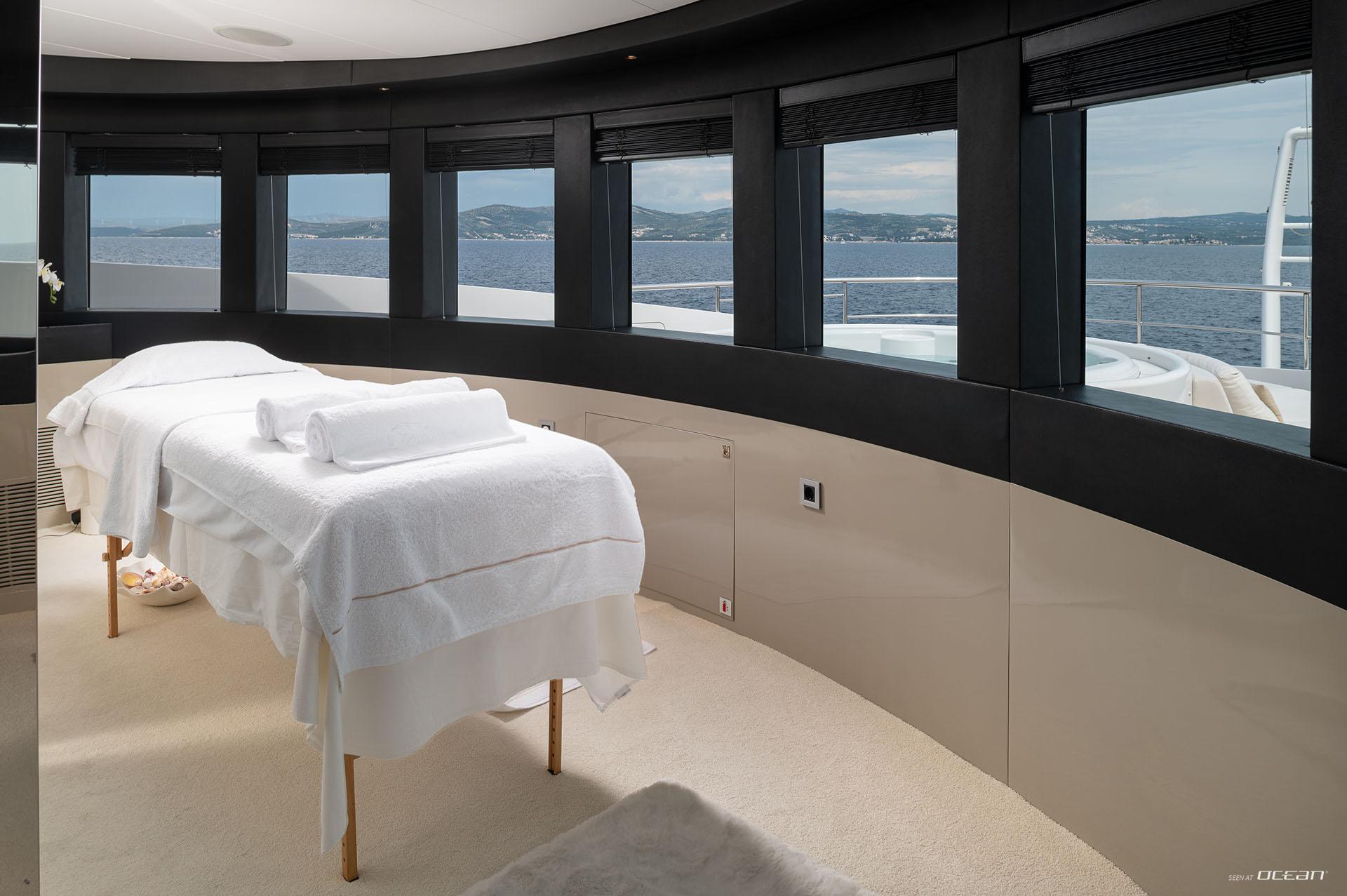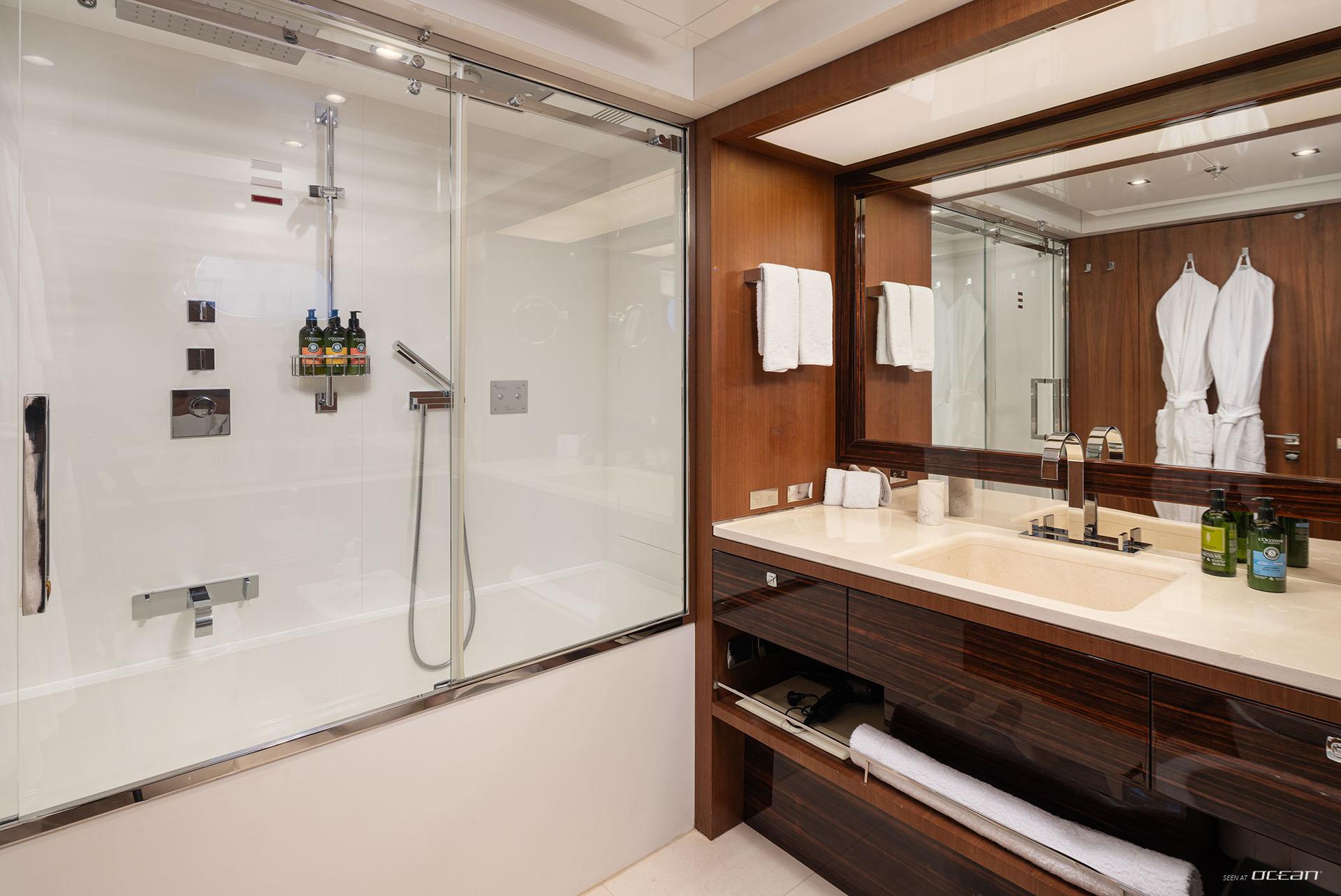 En-suite bathrooms in all cabins, master cabin with private office and walk-in wardrobe, air condition throughout, 3 generators, zero-speed stabilizers, stabilizers underway, Wi-Fi internet via Starlink, Crestron control system, TV in all cabins, Movie and music library, PlayStation 4, elevator connecting all decks, fully equipped gym, sky lounge with 220-inch cinema screen, jacuzzi on sundeck, 2 meters extension swimming platform, underwater lights, hydraulic side boarding ladder on port and starboard, 2 meter wide hydraulic swimming steps into water, and a variety of water toys.
