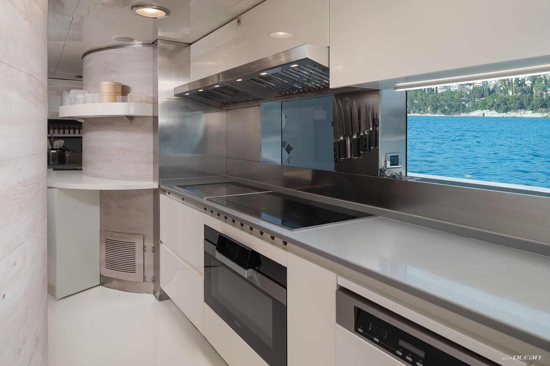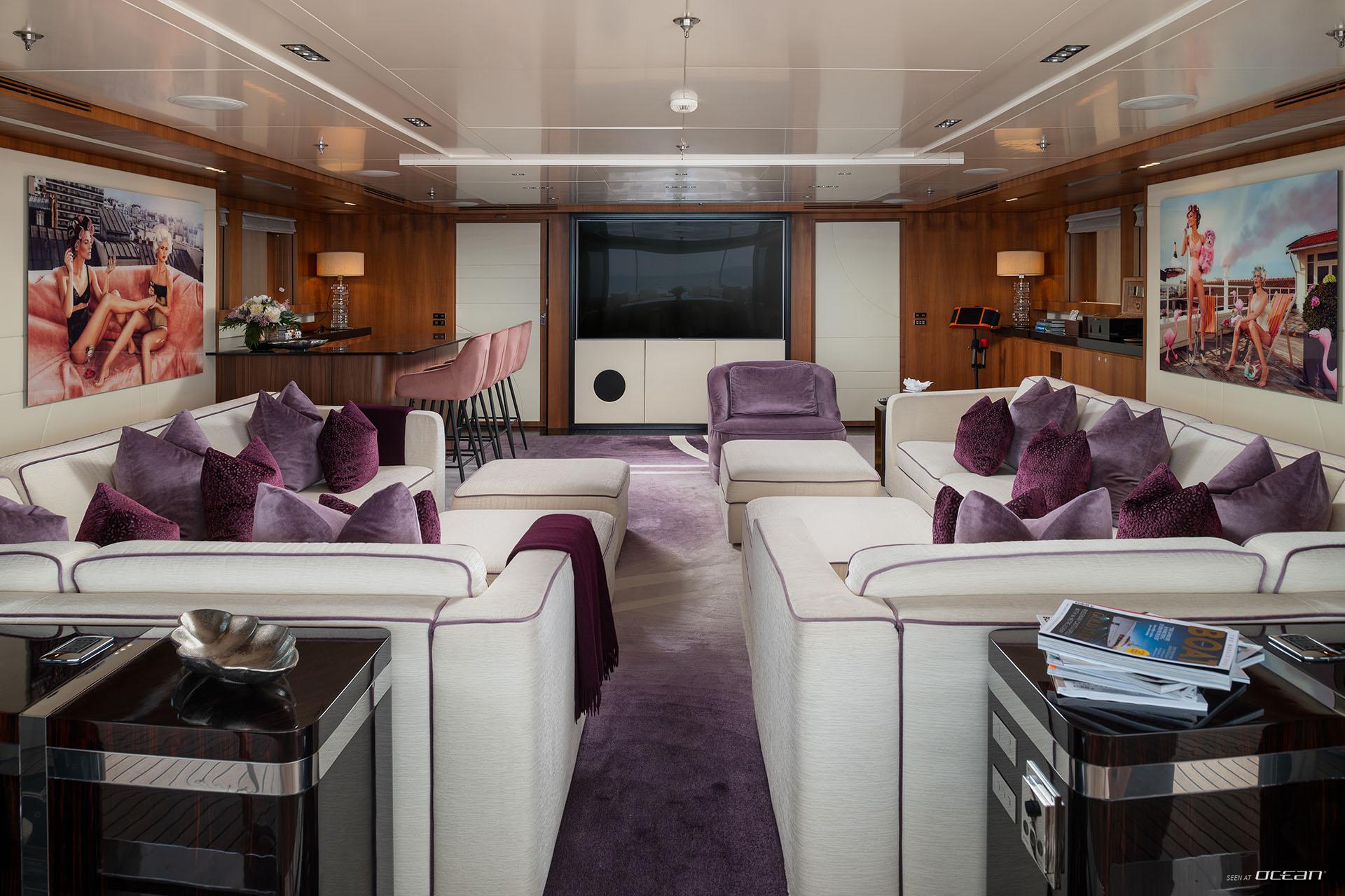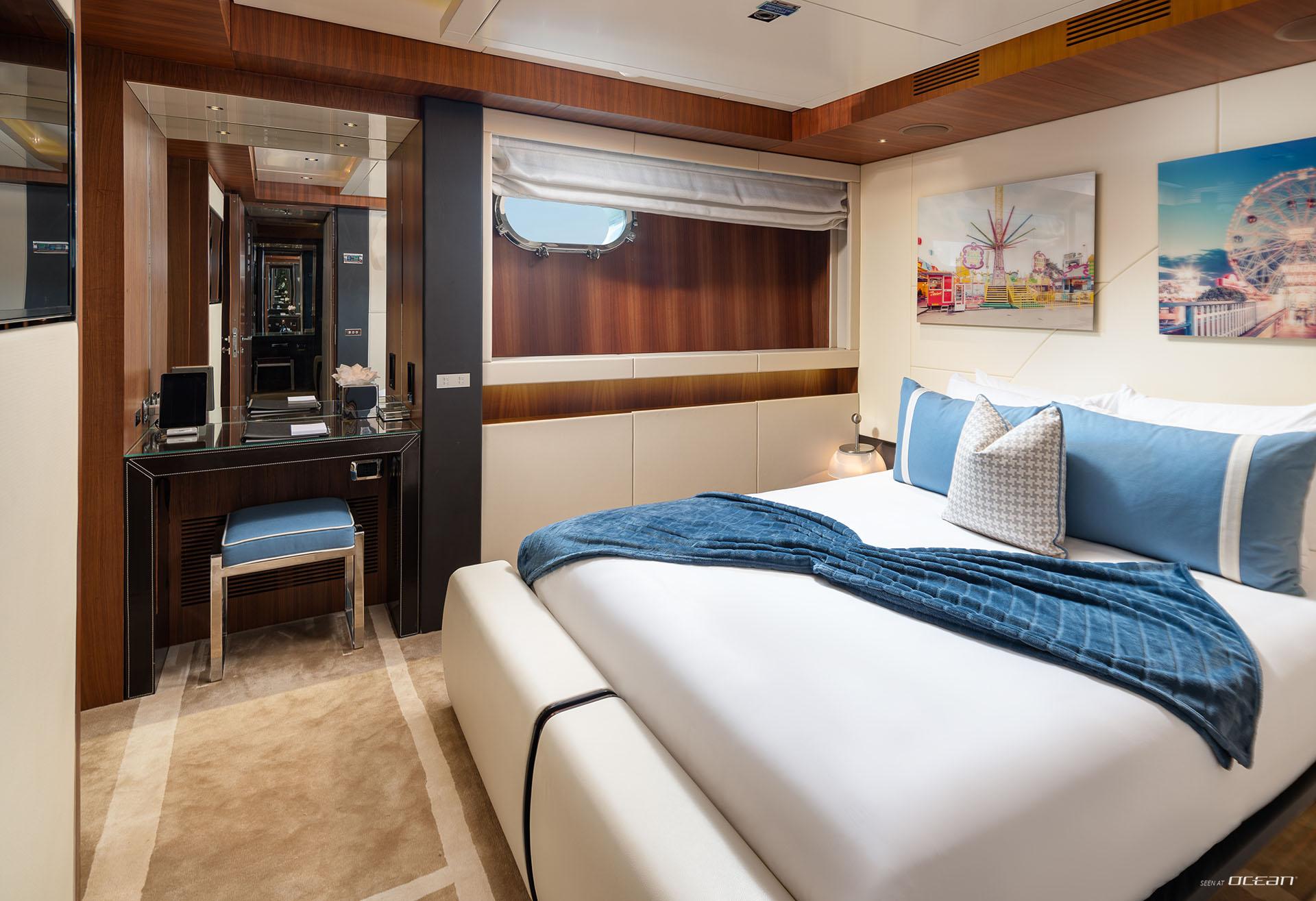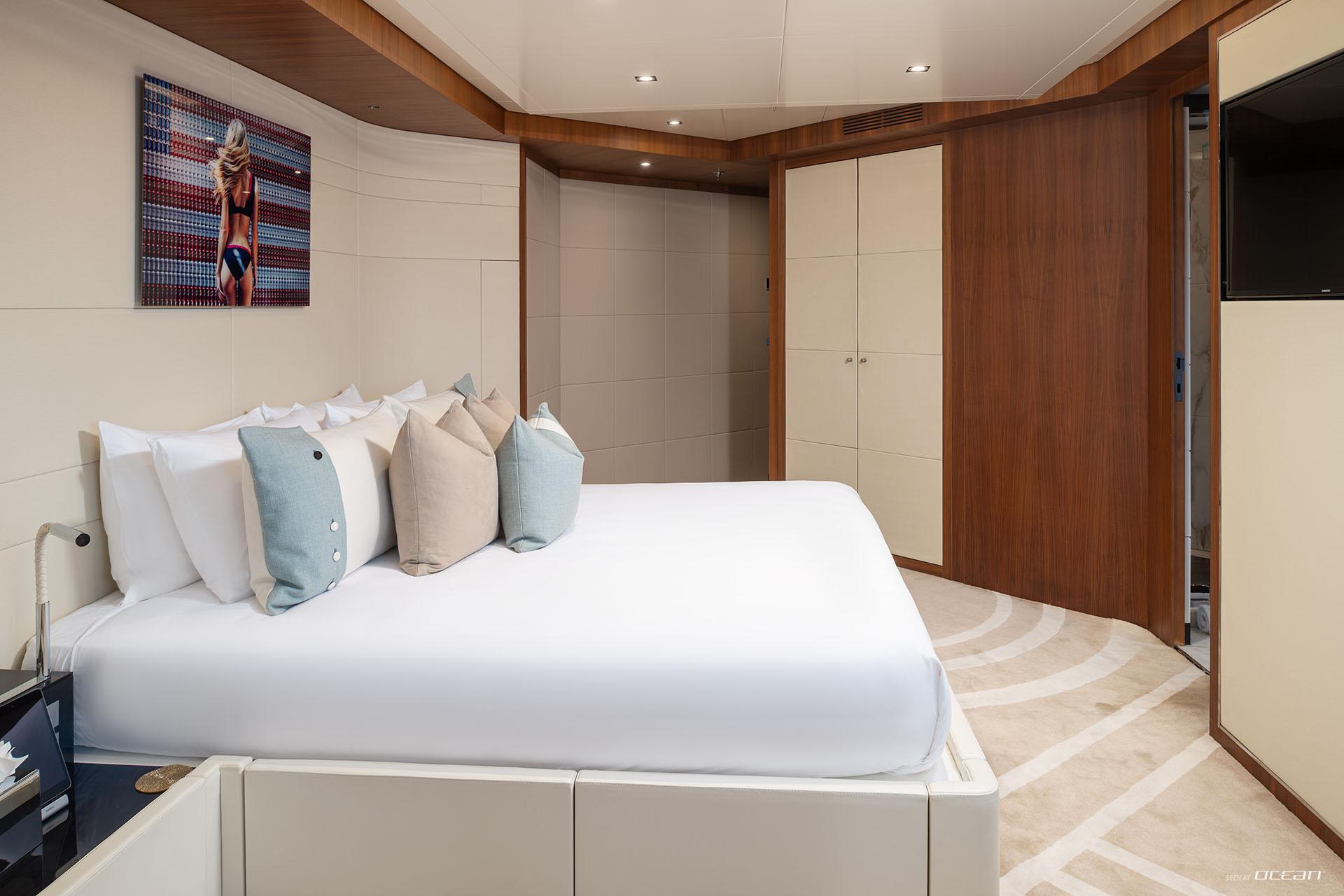 En-suite bathrooms in all cabins, master cabin with private office and walk-in wardrobe, air condition throughout, 3 generators, zero-speed stabilizers, stabilizers underway, Wi-Fi internet via Starlink, Crestron control system, TV in all cabins, Movie and music library, PlayStation 4, elevator connecting all decks, fully equipped gym, sky lounge with 220-inch cinema screen, jacuzzi on sundeck, 2 meters extension swimming platform, underwater lights, hydraulic side boarding ladder on port and starboard, 2 meter wide hydraulic swimming steps into water, and a variety of water toys.