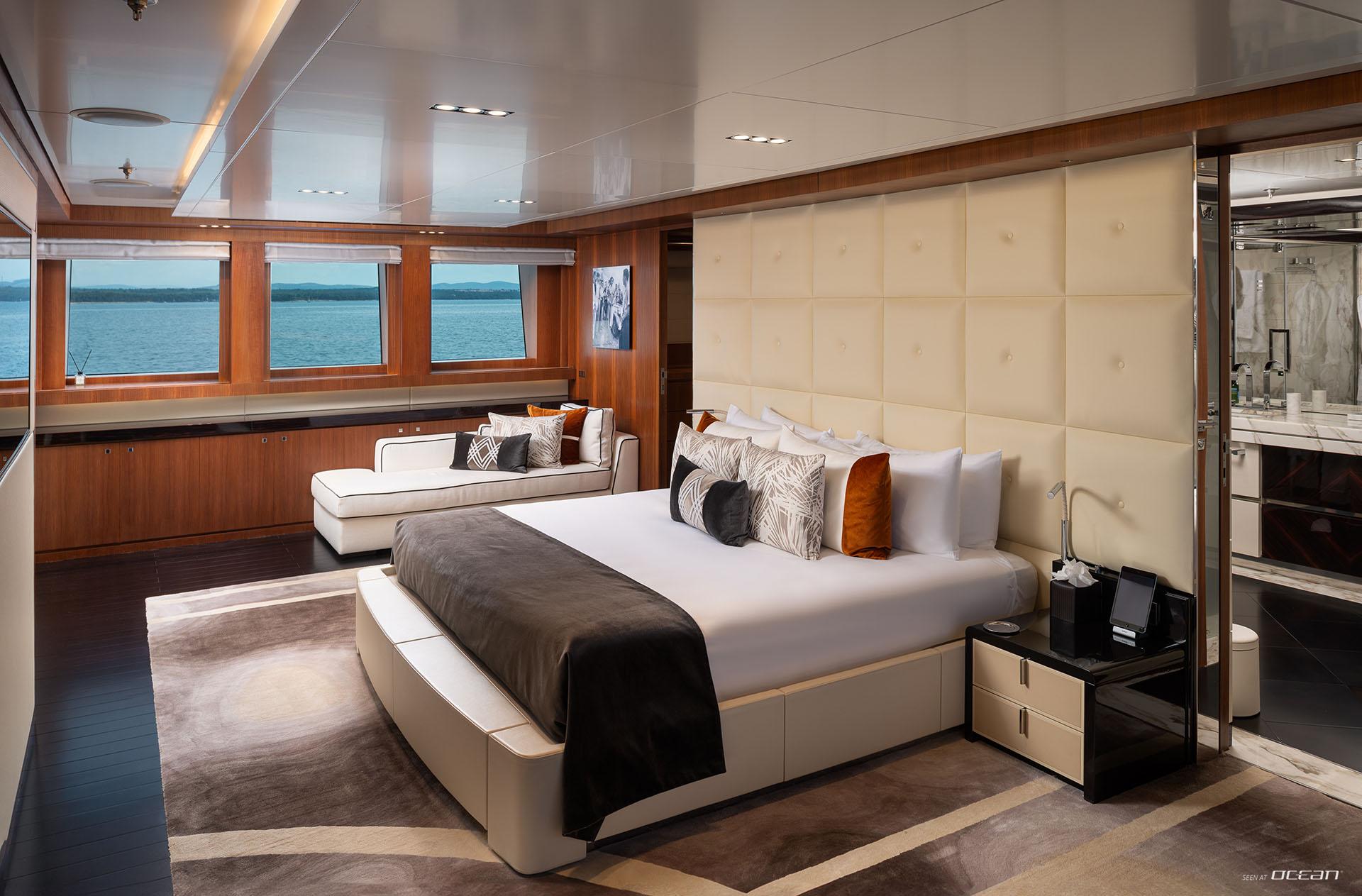 TALEYA luxury motor yacht for charter accommodates 12 guests across six cabins, including a master suite and VIP on the main deck, and two double and two twin cabins on the lower deck. One twin cabin is convertible to a double, and all twin cabins feature Pullman berths, offering flexible sleeping arrangements. Guests can enjoy luxurious privacy in each cabin, complemented by marble-clad ensuite bathrooms. An elevator connects all decks, and the yacht’s layout ensures good mobility for wheelchair users.
