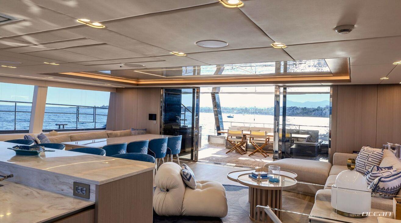 TESNI stands out through her electric and hybrid propulsion, supported by powerful battery banks and partially solar-powered systems. Advanced energy management solutions, including Sunreef’s solar skin technology, reduce fuel consumption while enhancing onboard comfort. Large sliding doors connect the salon seamlessly with the decks, while panoramic windows flood the interior with natural light, reinforcing a strong connection to the surrounding seascape.