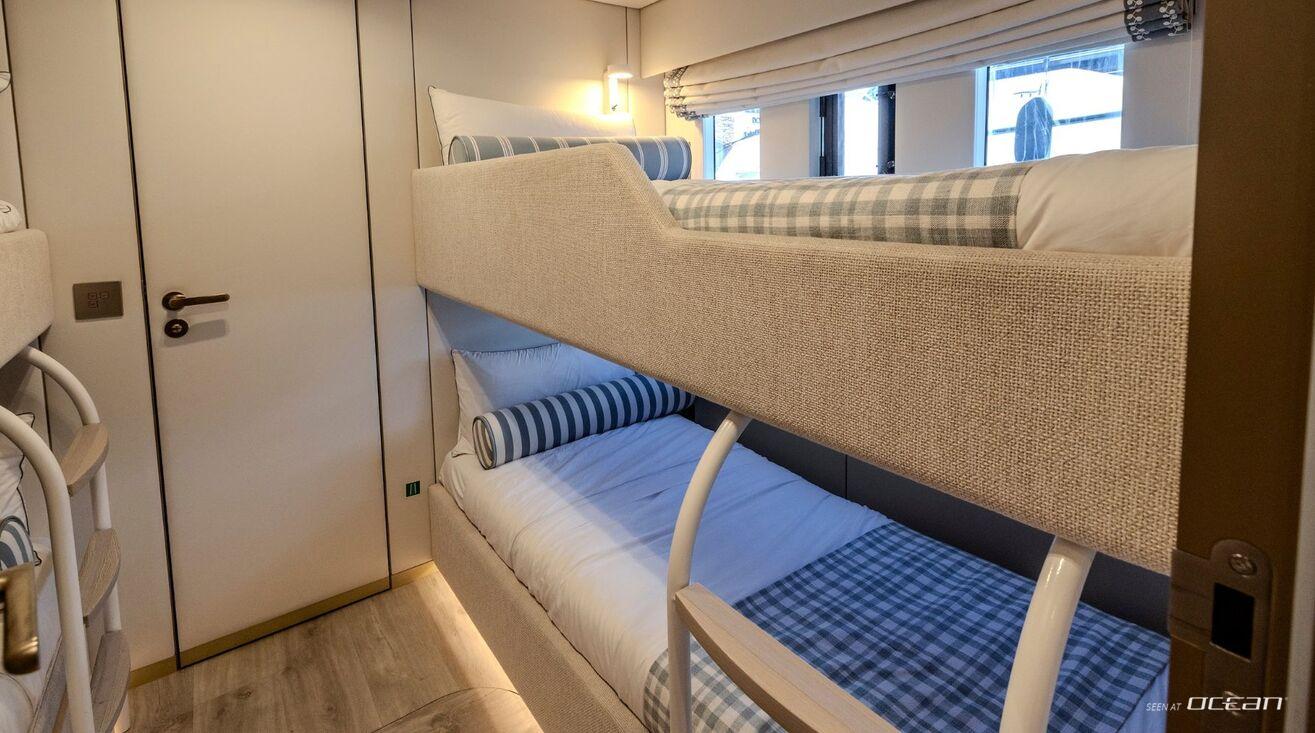 Luxury charter catamaran TESNI accommodates up to 10 guests in 4 elegant en-suite cabins, comprising a master suite, a VIP cabin, a double cabin, and a unique 4-berth cabin with bunk beds, ideal for families or mixed-age groups. The interior design features light woods, natural textures, and soft blue accents, creating a calm and welcoming atmosphere throughout. All cabins enjoy privacy, generous space, and refined detailing, supported by Starlink internet, Bluetooth sound, and access to a shared media library.