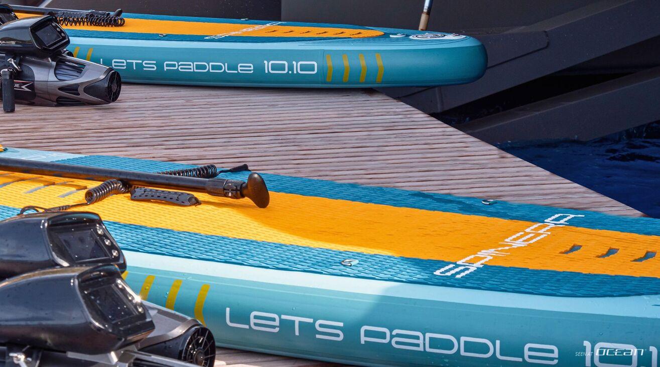 Williams DieselJet 505, jet ski, rigid Flite Efoil, Air Flite Efoil, 2 stand-up paddleboards, wake surfboard, wave maker for wake surfers, 4-person inflatable towable donut, and snorkeling gear
