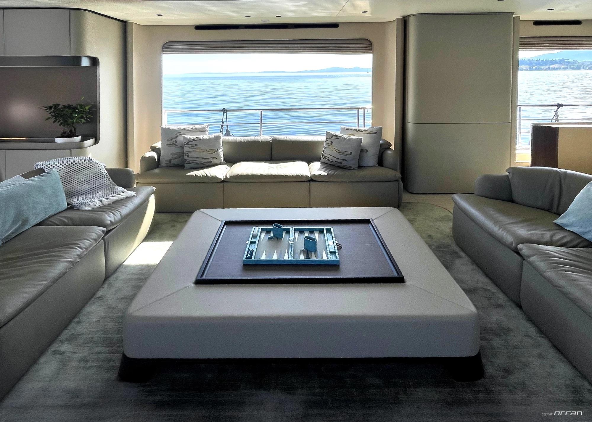 The interior of Azimut M/Y VOLANTE is penned by renowned designer Achille Salvagni, whose signature style brings a calm and welcoming atmosphere throughout. A neutral color palette, soft textures, and carefully selected materials create a serene onboard ambiance that feels both contemporary and timeless. Full-height windows flood the main deck lounge and owner’s suite with natural light, enhancing the seamless indoor-outdoor flow and reinforcing a constant connection with the sea.