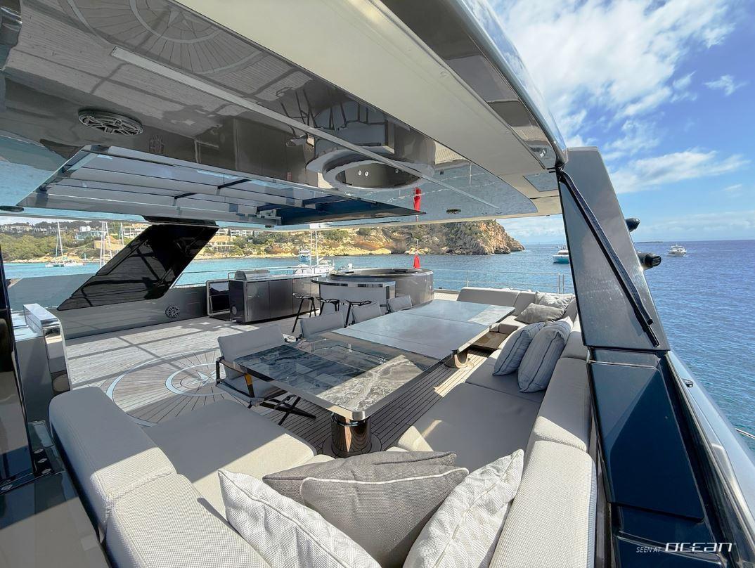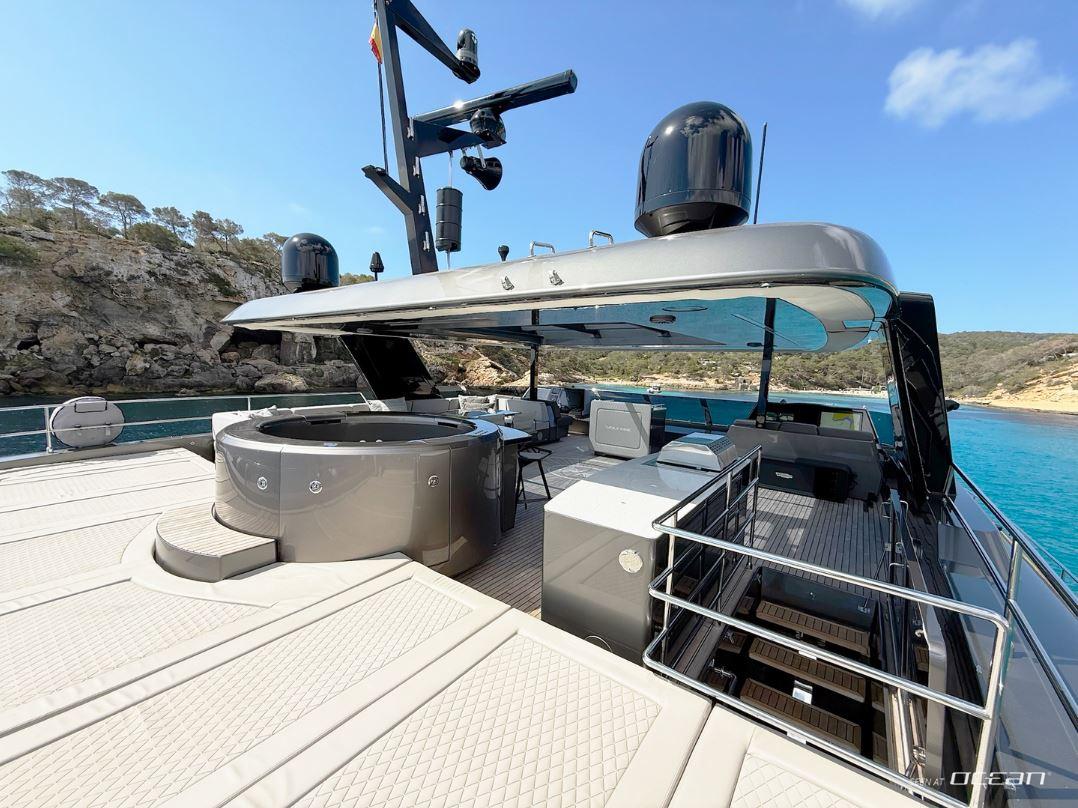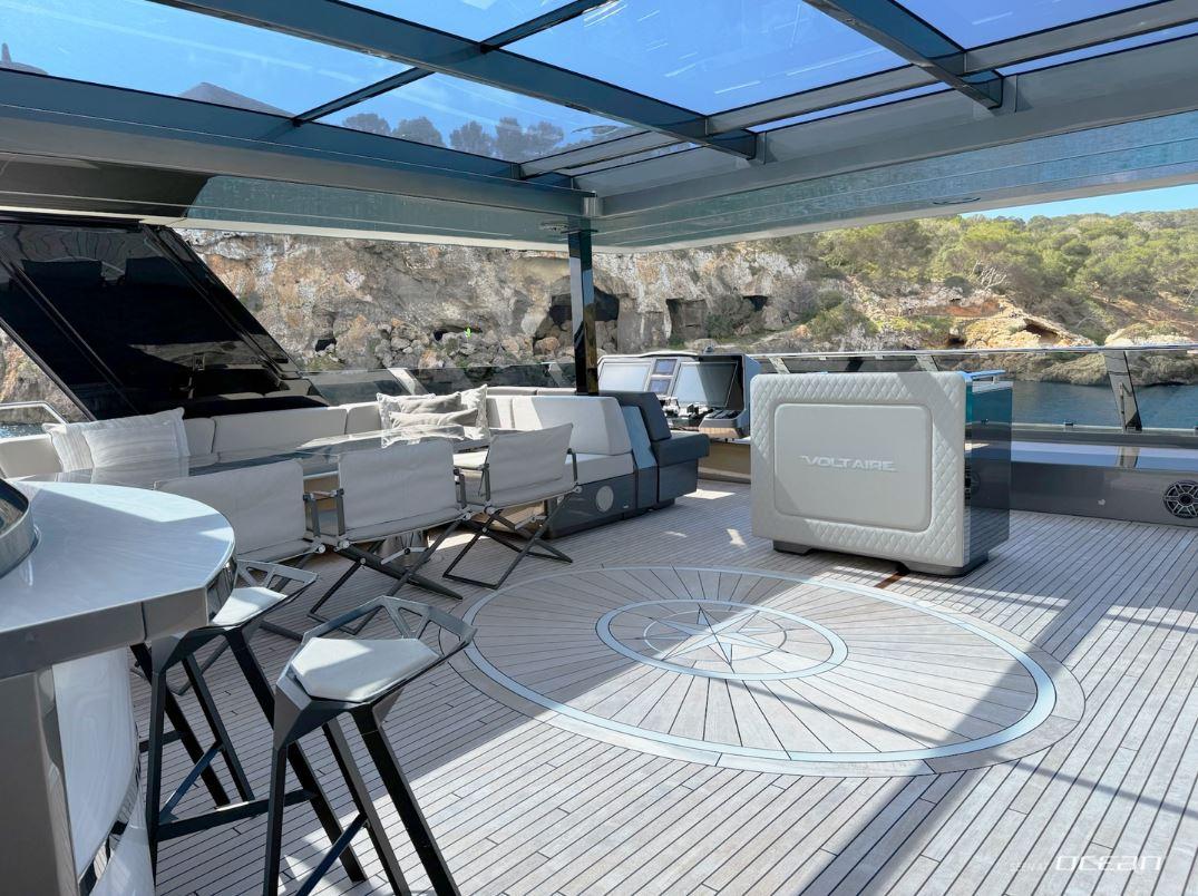 VOLTAIRE Sunreef 80 is built around outdoor enjoyment, where every deck invites guests to slow down and take in the surroundings. The expansive flybridge becomes a natural gathering point, featuring a jacuzzi, bar, BBQ, hardtop shade, and generous seating with uninterrupted sea views. From relaxed afternoons in the sun to evenings spent dining under the sky, life on board flows effortlessly from one moment to the next.
