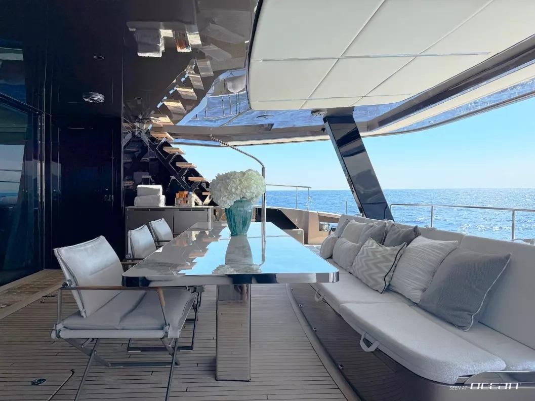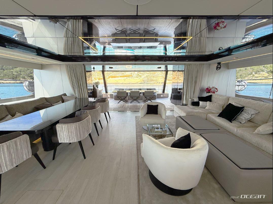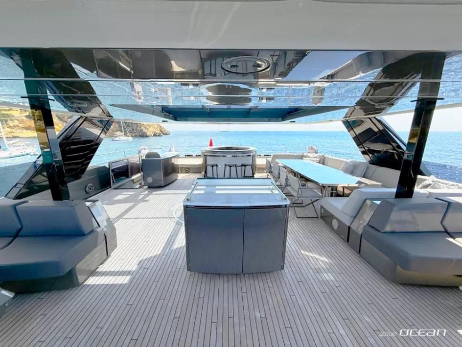 En-suite bathrooms in all cabins, air condition throughout, generator, watermaker, jacuzzi, BBQ, TV in salon and all cabins, customized Denon Hi-Fi system with JL Audio & KEF speakers throughout the yacht, Wi-Fi internet, swimming platform, and a variety of water toys