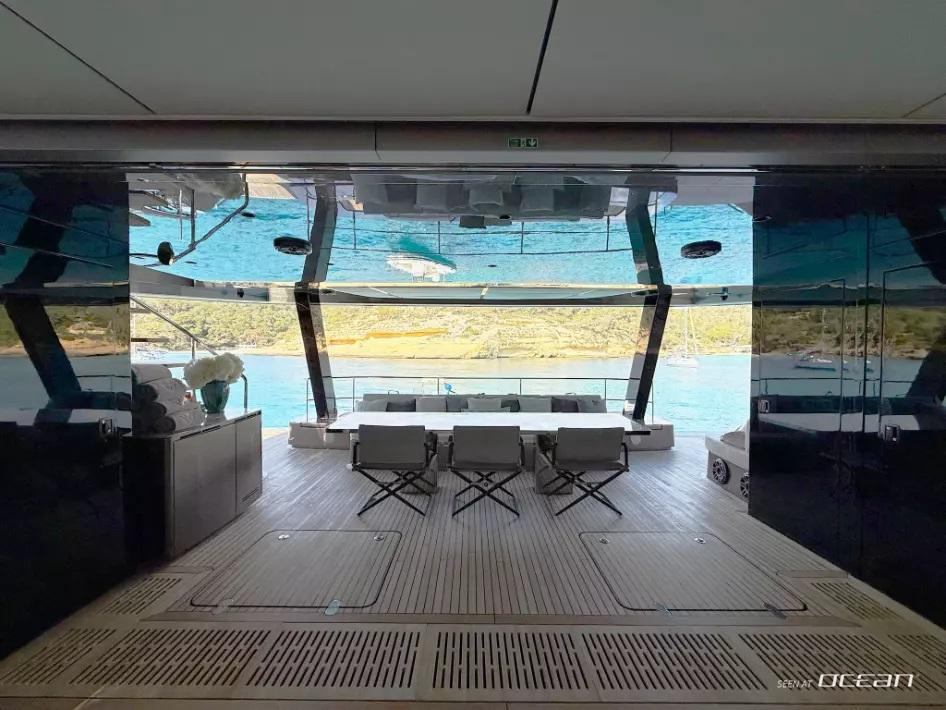 Charter Sunreef Catamaran VOLTAIRE reveals a cleverly designed layout, with a show galley positioned forward of the bright and open salon, complemented by a secondary galley below with direct access to the aft cockpit, ensuring smooth and discreet service. She accommodates up to 7 guests across a super-size master stateroom, a VIP triple cabin, and a double cabin, offering flexibility for both families and couples. Each cabin is equipped with ensuite facilities and smart TVs, creating a comfortable and private retreat on board.