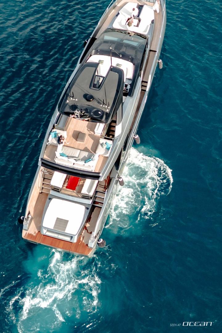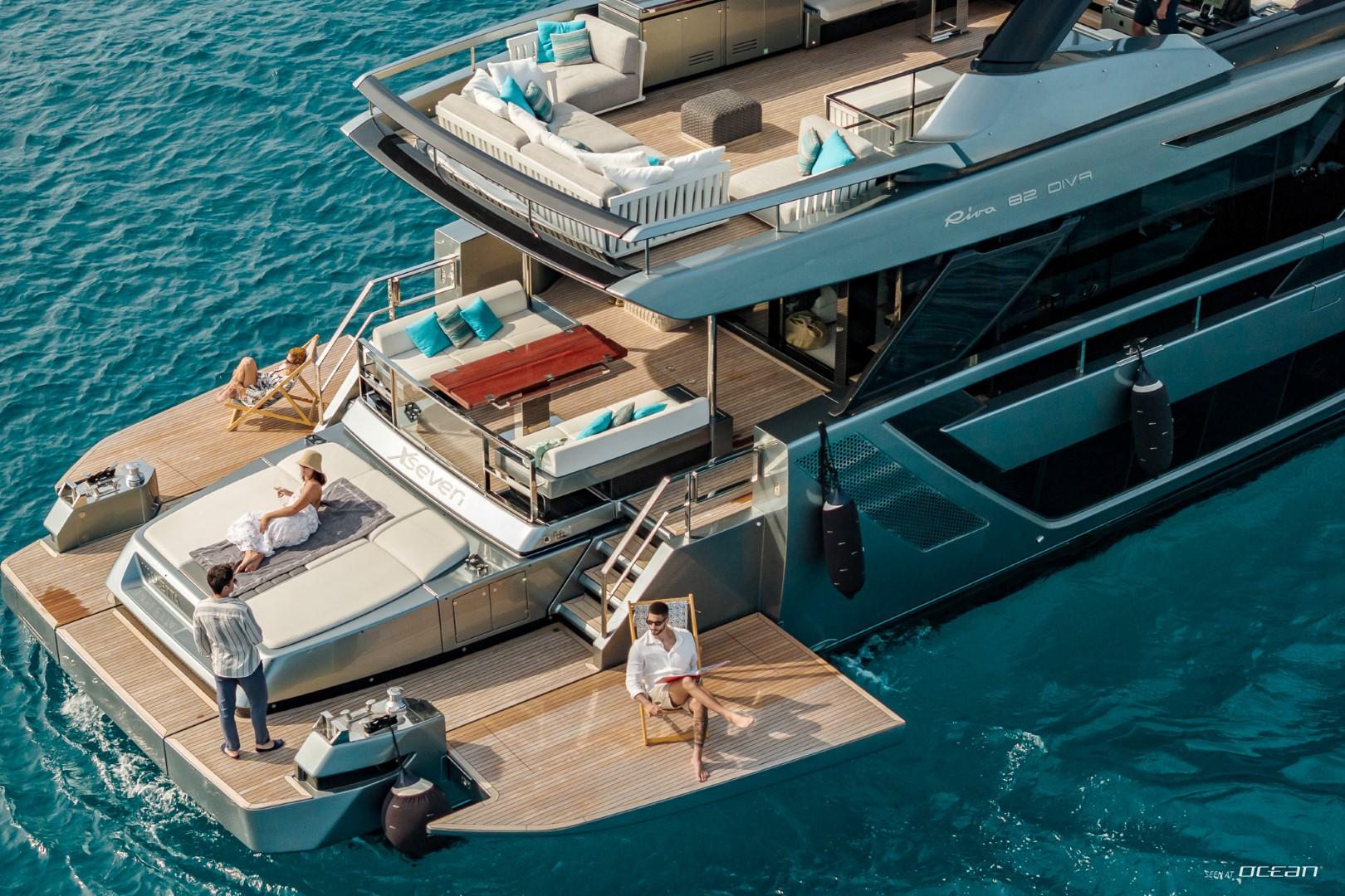 Joining our Salerno-based charter selection, X SEVEN is a Riva 82 Diva measuring 26m, offering a contemporary take on Italian yachting along the Amalfi Coast. As part of Riva’s latest flybridge series, she places strong emphasis on outdoor living and connection to the sea. Designed by Officina Italiana Design, her profile is defined by clean lines, expansive glazing, and a natural flow between interior and exterior areas, complemented by a beach club with folding terraces that extend the space at water level.