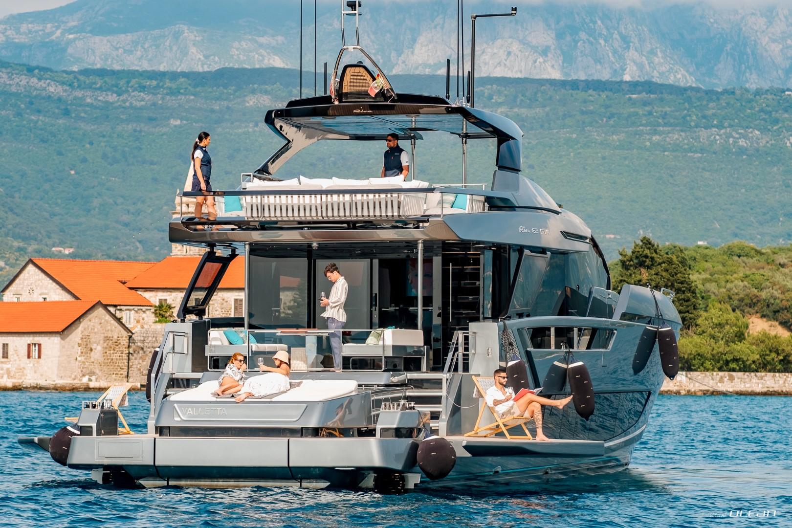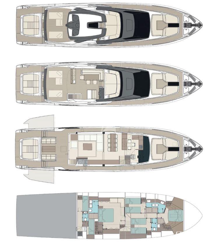 En-suite bathrooms in all cabins, air condition throughout, 2 generators, stabilizers underway and at anchor, watermaker, Wi-Fi internet, TV in salon and all cabins, premium sound system with independent Airplay in foredeck, cockpit and sundeck, spacious sunpads and lounging areas, beach club with swimming platform extended by 2 fold-down terraces on each side, and a variety of water toys.