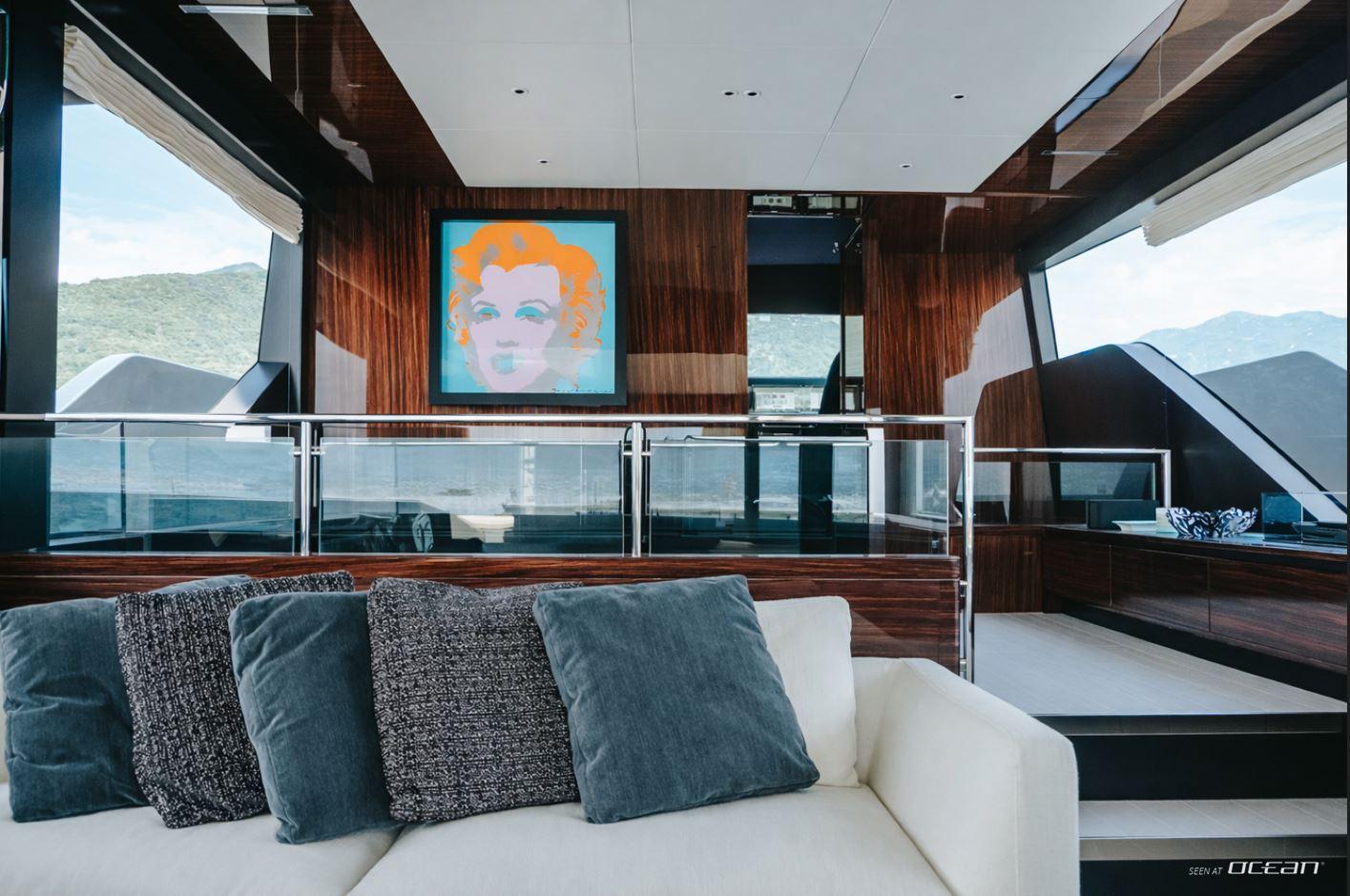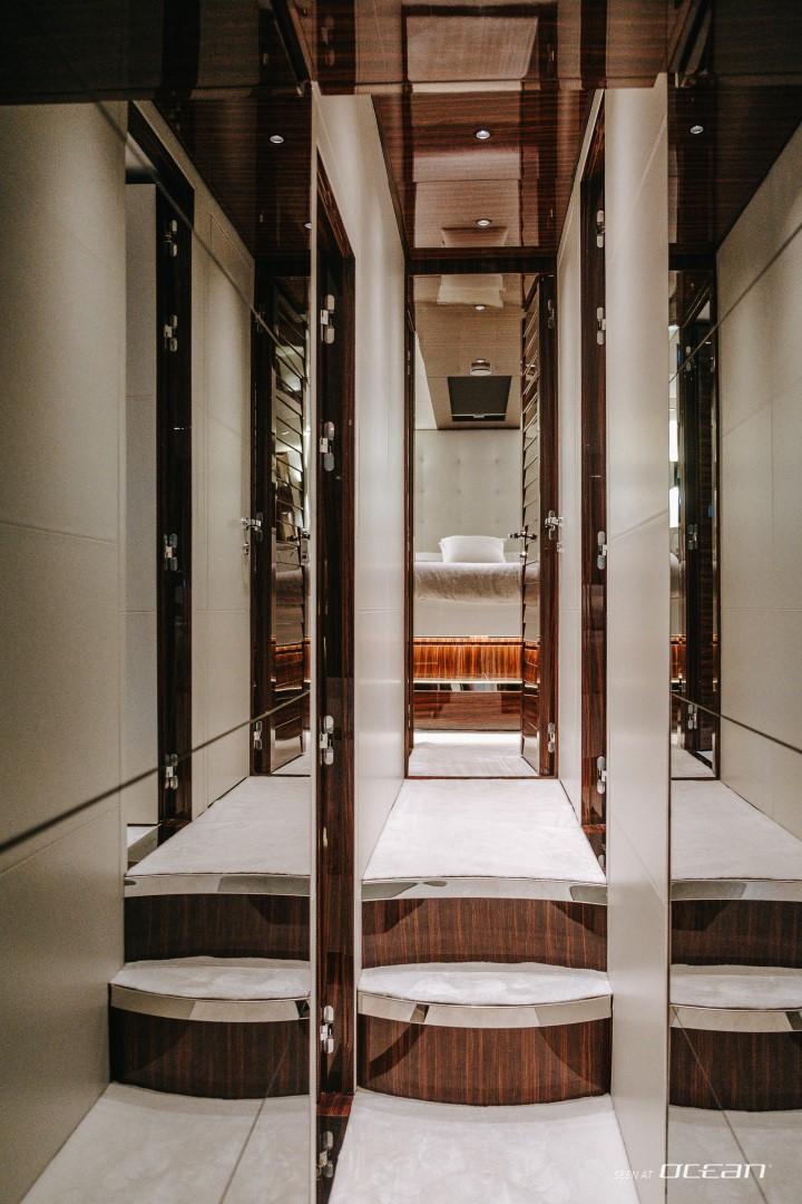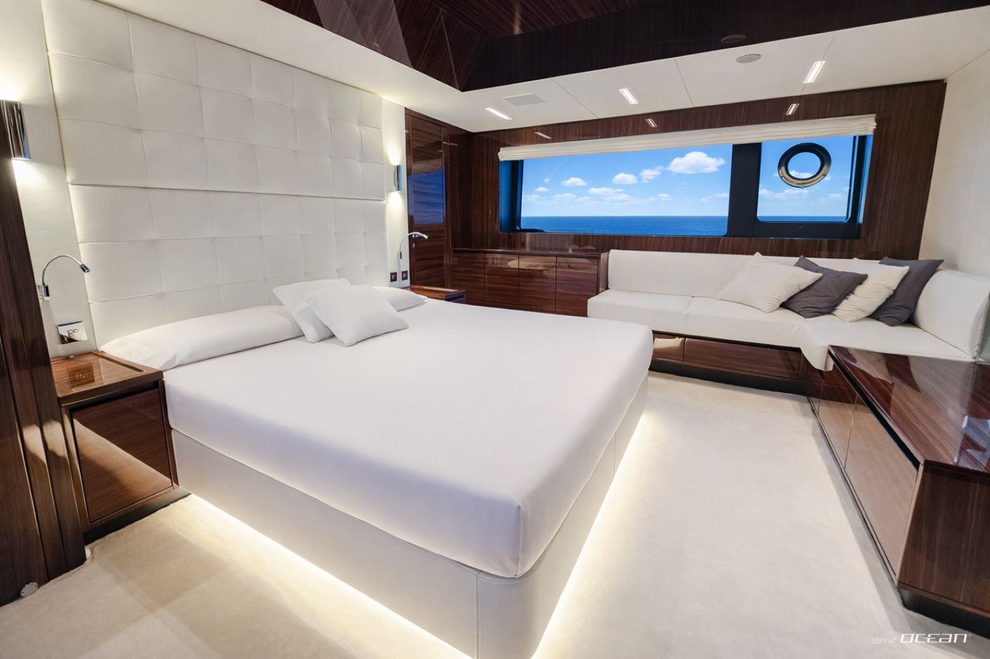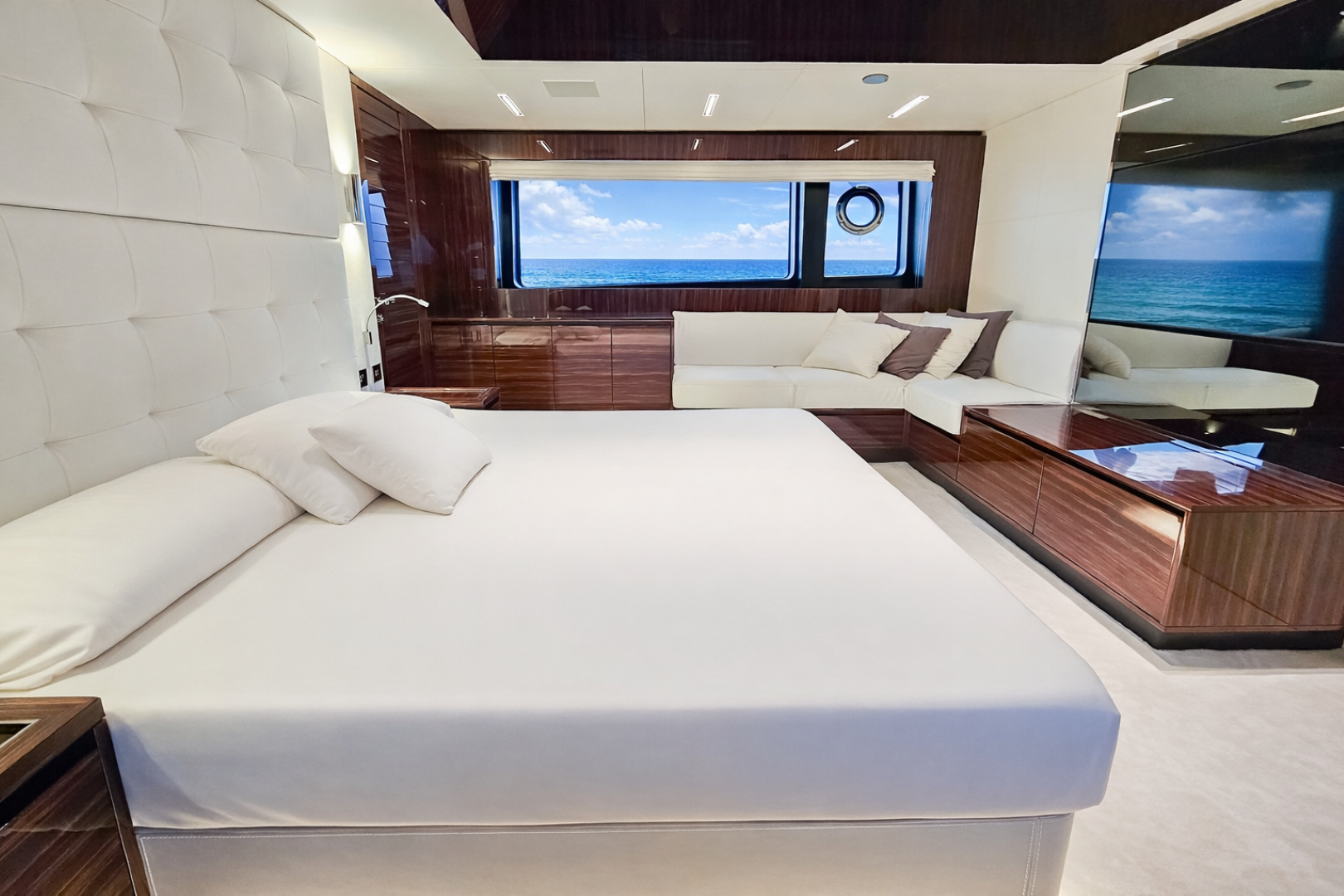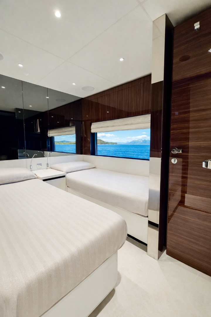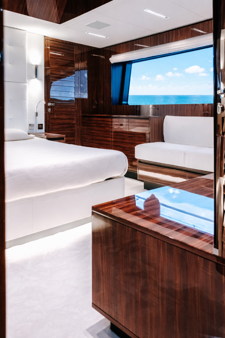 Inside, Riva luxury motor yacht X SEVEN accommodates up to 8 guests in 4 ensuite cabins, including a full-beam master stateroom, a VIP cabin forward, and 2 twin cabins. The interior feels bright and contemporary, supported by large windows and a balanced layout. A premium audio system with independent AirPlay zones and intuitive controls adds to the onboard atmosphere, while stabilizers ensure comfort both underway and at anchor.