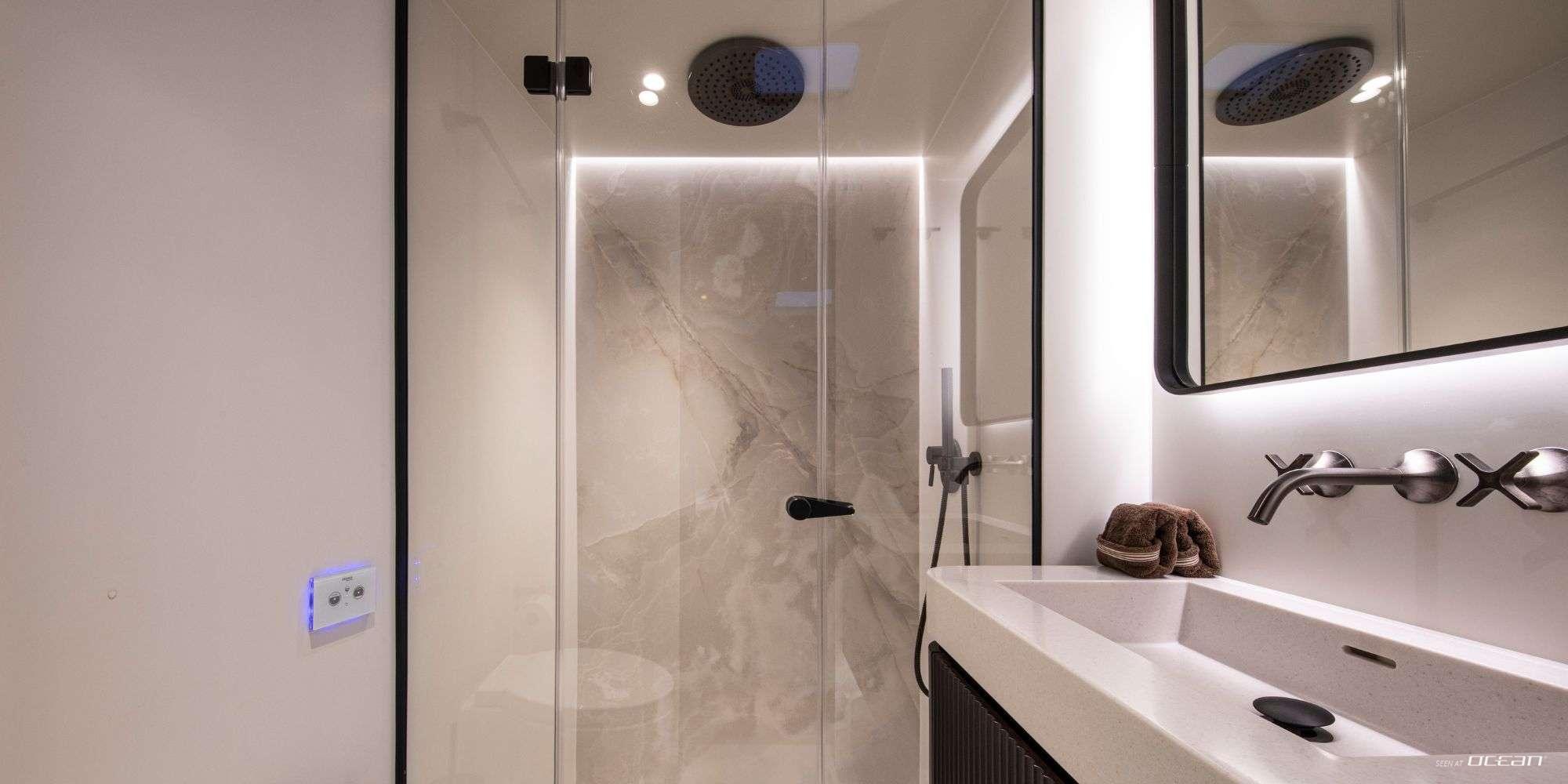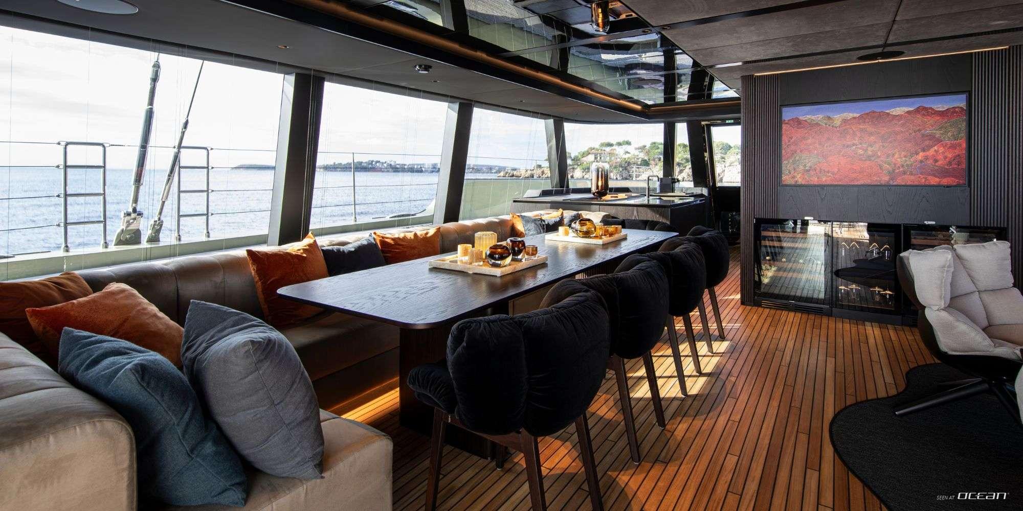 The layout on board A-PLAN has been carefully conceived for relaxed charter living. Accommodating up to 9 guests, she features a spacious master stateroom, a VIP cabin, a convertible twin to double, and a versatile triple cabin, making her equally appealing to families and couples. All cabins include en-suite bathroom facilities and smart TVs with access to a shared media library, ensuring privacy and entertainment throughout the charter.
