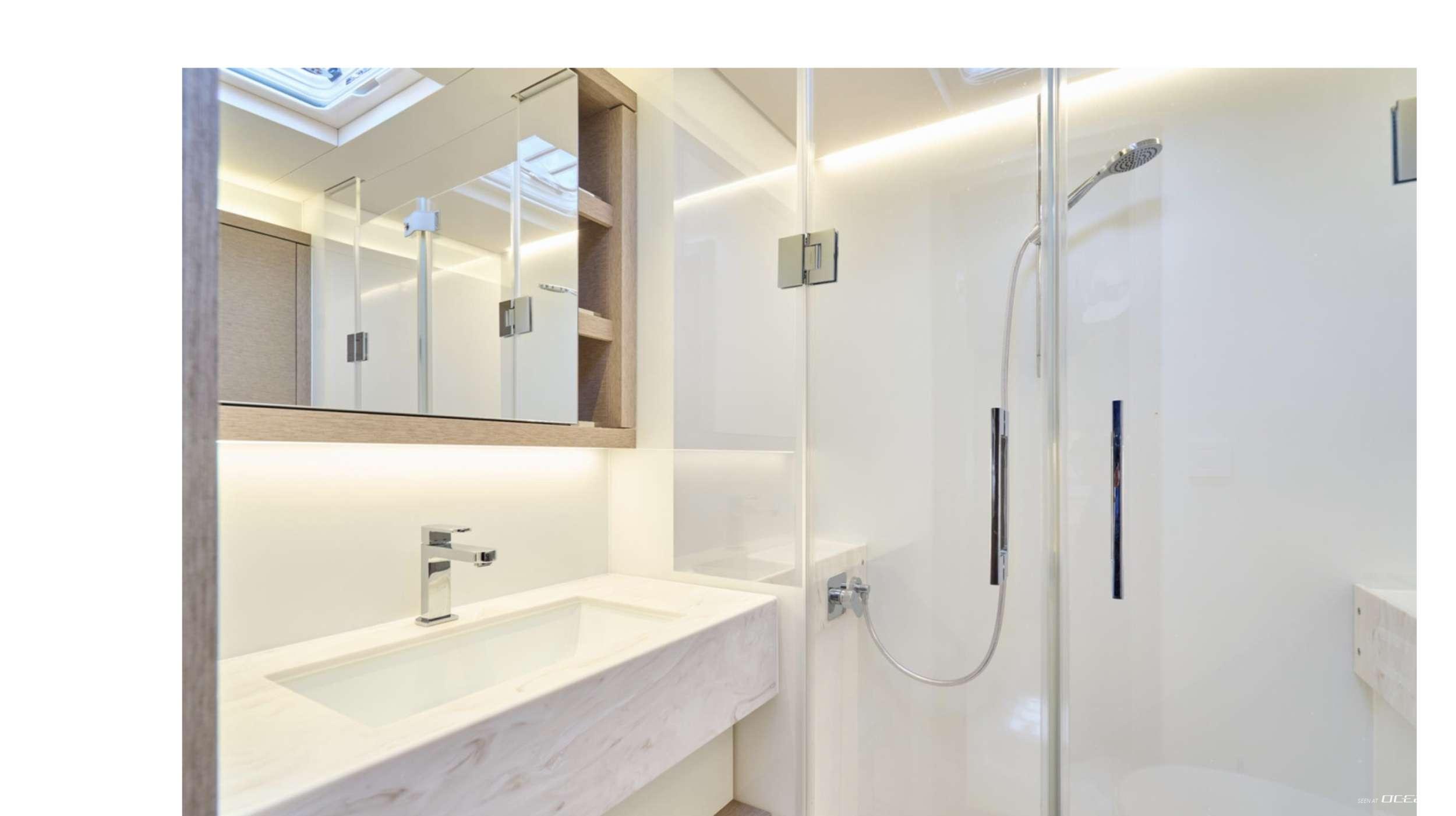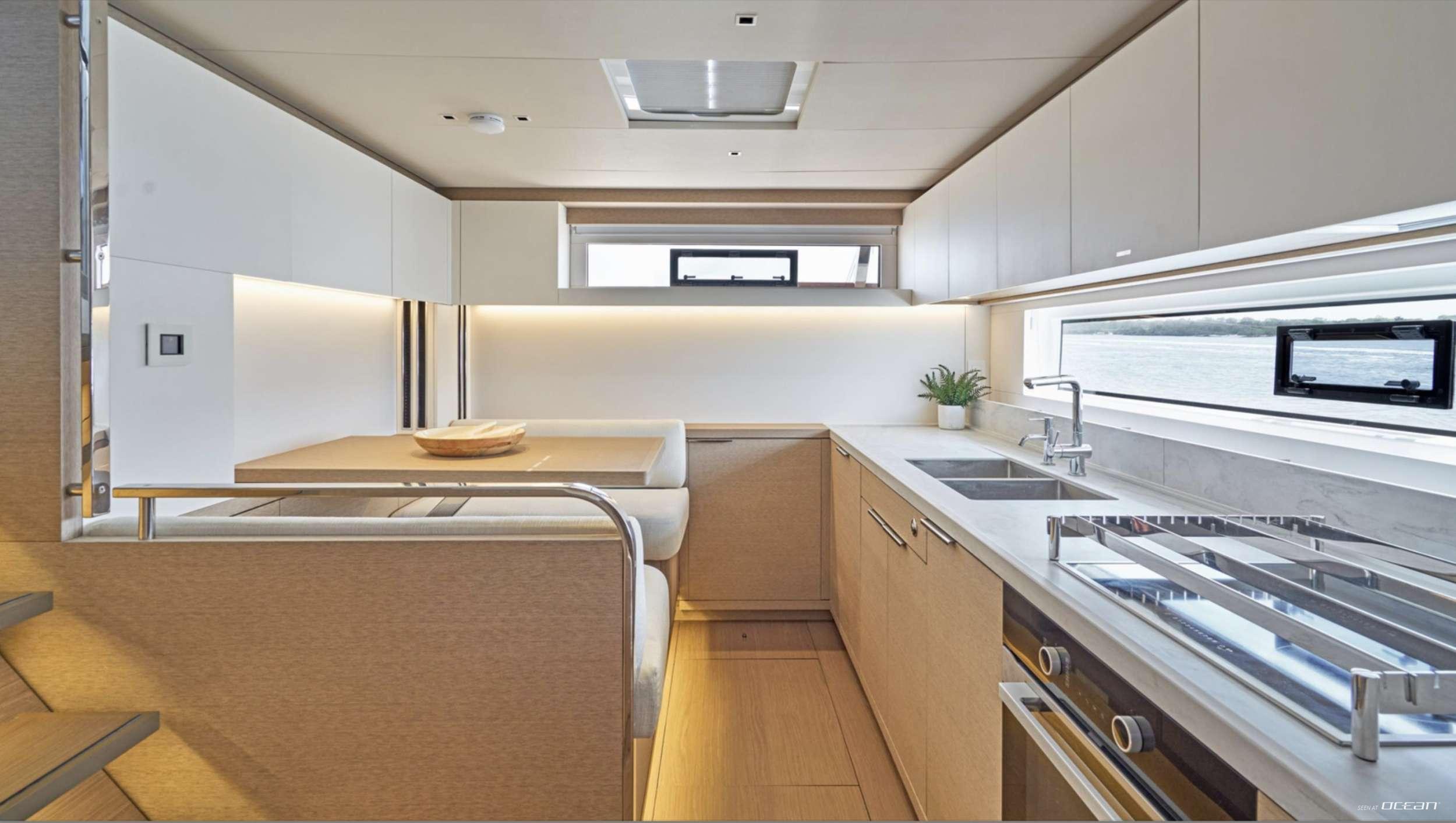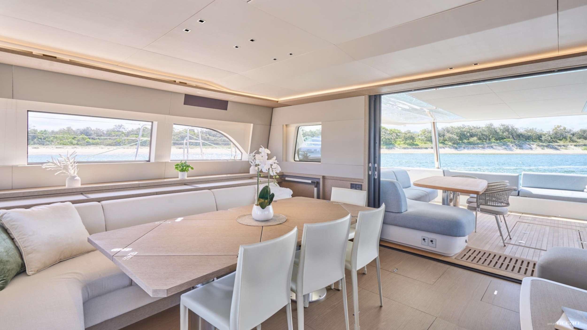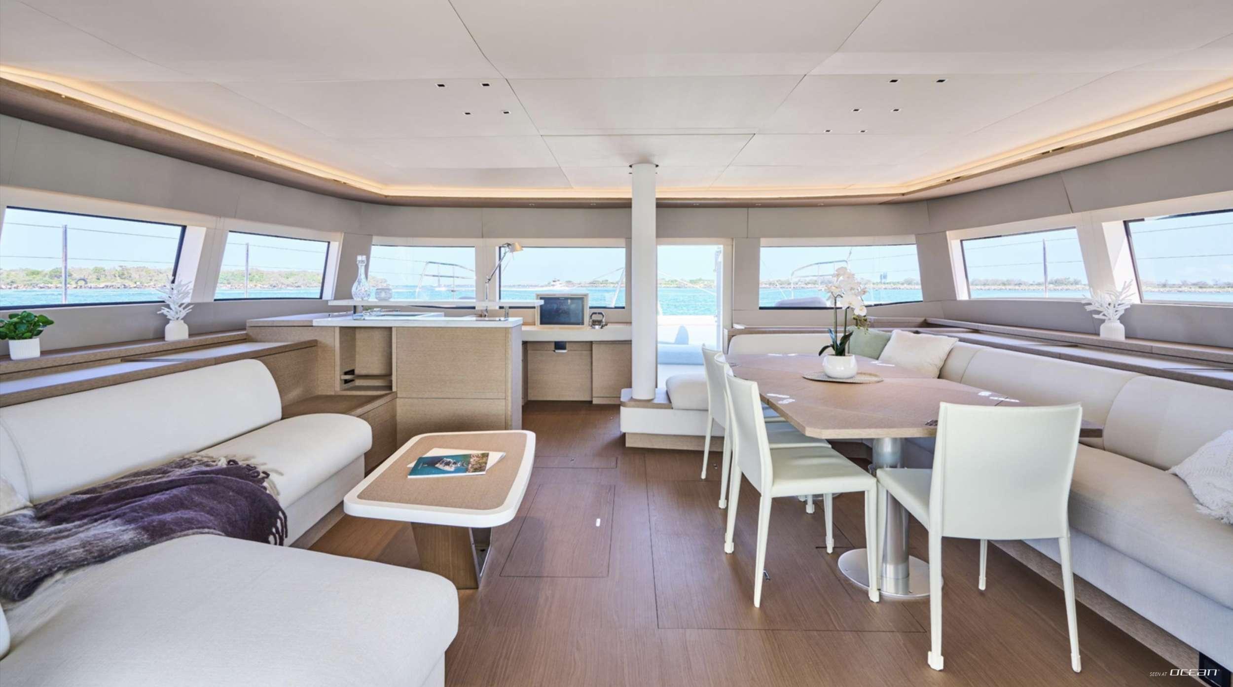 Lagoon Sixty 5 AMAREA for charter welcomes up to 8 guests in a thoughtfully arranged 4-cabin configuration including a generous owner suite and 3 additional double cabins, each with ensuite bathroom. The owner’s cabin features a dedicated desk area, TV, and direct deck access, offering a quiet retreat with uninterrupted sea views. Minimalist interior styling enhances the calm and sophisticated atmosphere, while large panoramic windows bring natural light into the salon.
