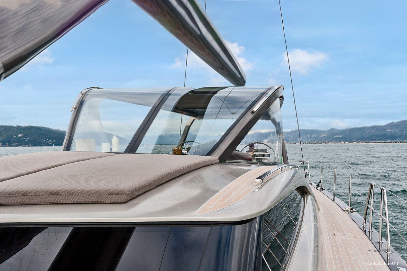 Outdoor spaces are a highlight of GIGRECA Admiral Silent 76 for charter, featuring a large cockpit with opposing sofas and folding dining tables under a retractable hard rooftop. Forward of the mast, a shaded lounge with sunbeds creates an inviting setting for post-swim aperitifs. At anchor, the swimming platform becomes a sea-level terrace, enhanced by underwater lights. Water activities include a 4.9 m tender with 70 hp engine, water skis, seabob and stand-up paddleboards, delivering adventure alongside relaxed cruising.