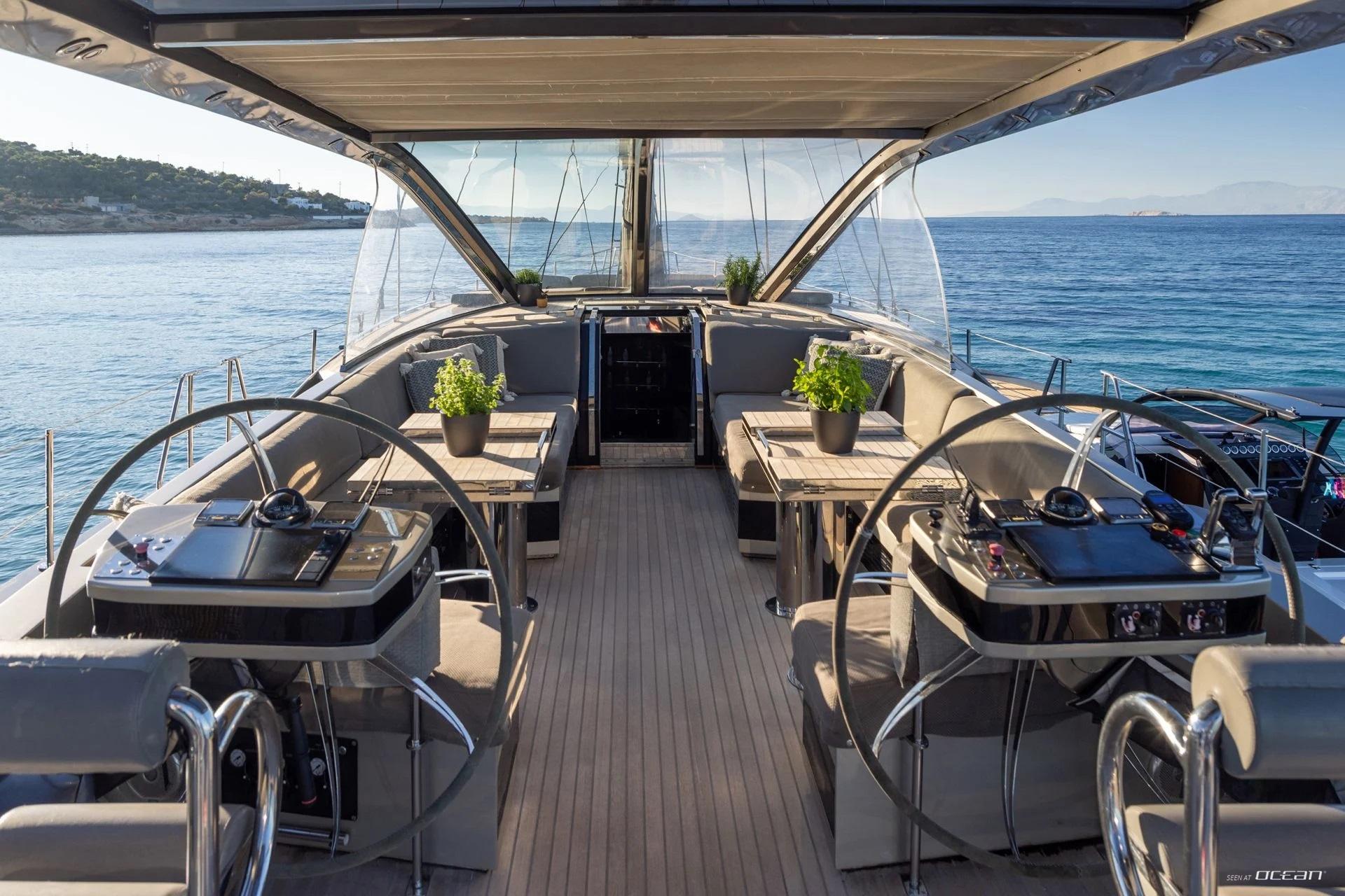 An elevated, glass-surrounded superstructure defines GIGRECA’s indoor lounge, creating a bright and elegant atmosphere throughout the day. An L-shaped sofa wraps around a generous dining table, complemented by a bar area, entertainment system and TV. Premium materials and refined finishes enhance the sense of understated luxury. The layout encourages relaxed dining and social moments both underway and at anchor.