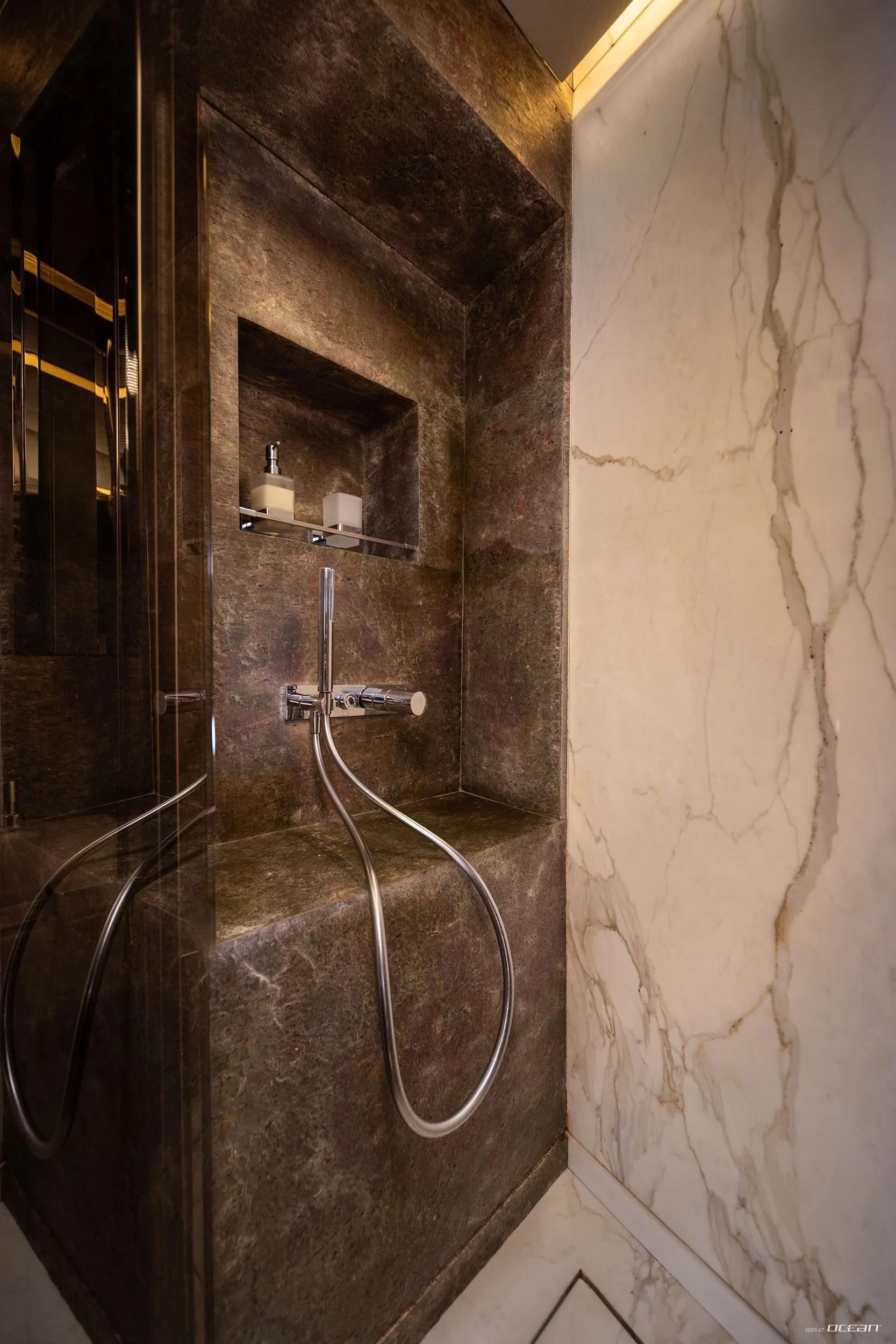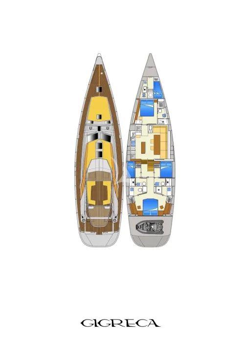Luxury sailing yacht GIGRECA offers 4 well-appointed cabins designed for privacy and comfort. A spacious master suite is positioned aft, while a VIP double cabin sits forward of the salon. Two additional guest cabins include a double and a bunk-bed cabin, each with en-suite facilities finished in marble. The accommodation plan ensures a calm retreat after full days exploring Greek waters.