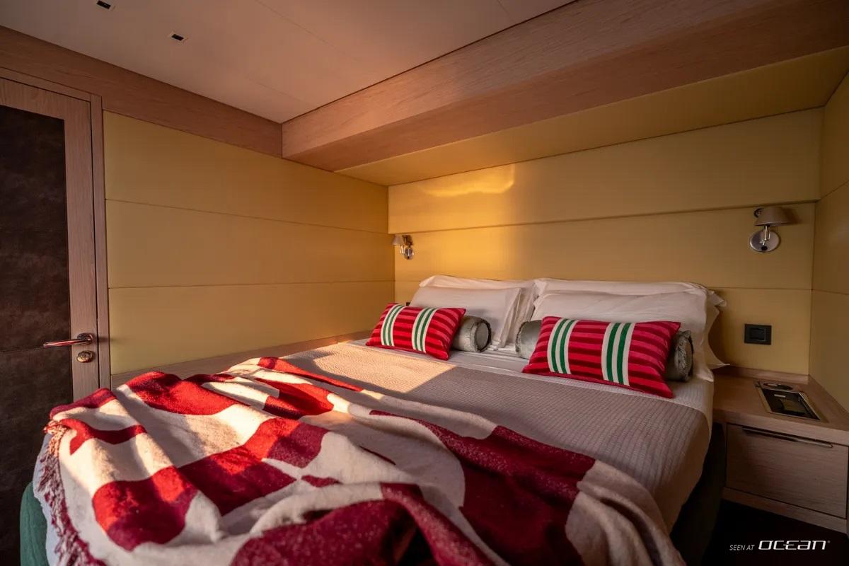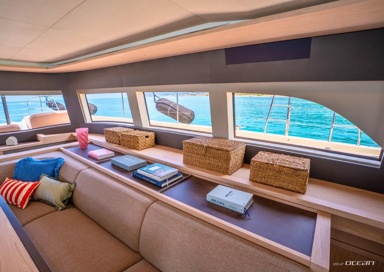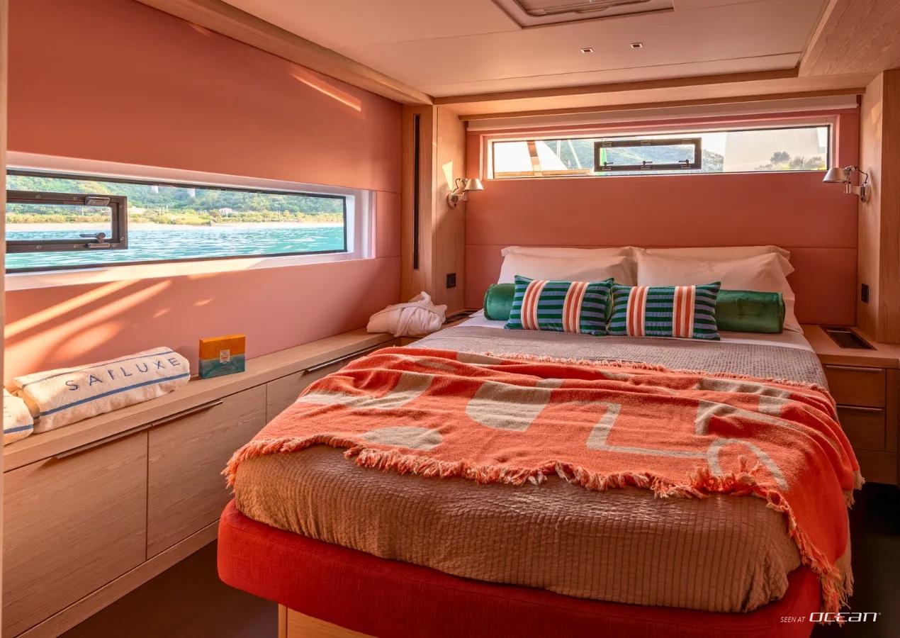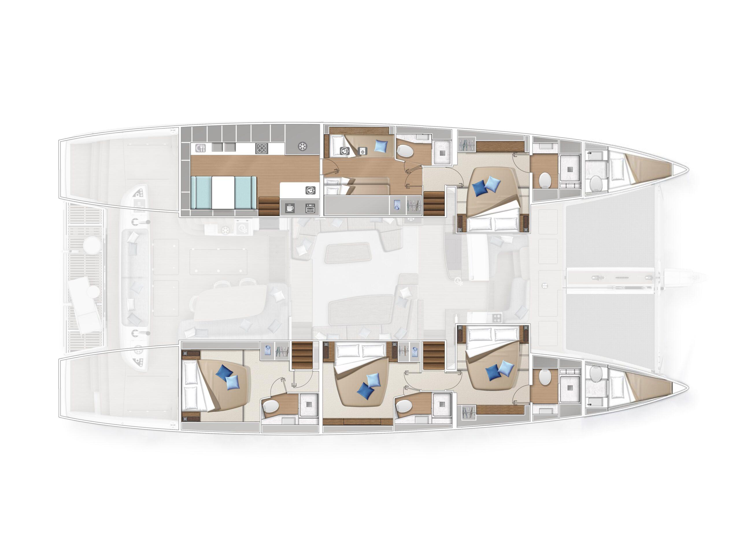 Inside, Lagoon Sixty 5 GLORIA for charter accommodates 8 guests in 4 double cabins, with an optional triple cabin available for up to 11 guests on request and at a surcharge. Each cabin features ensuite facilities, providing privacy and comfort for all guests. The layout works perfectly for families and groups of friends, supported by a professional crew of 4 ensuring a smooth and enjoyable charter experience.
