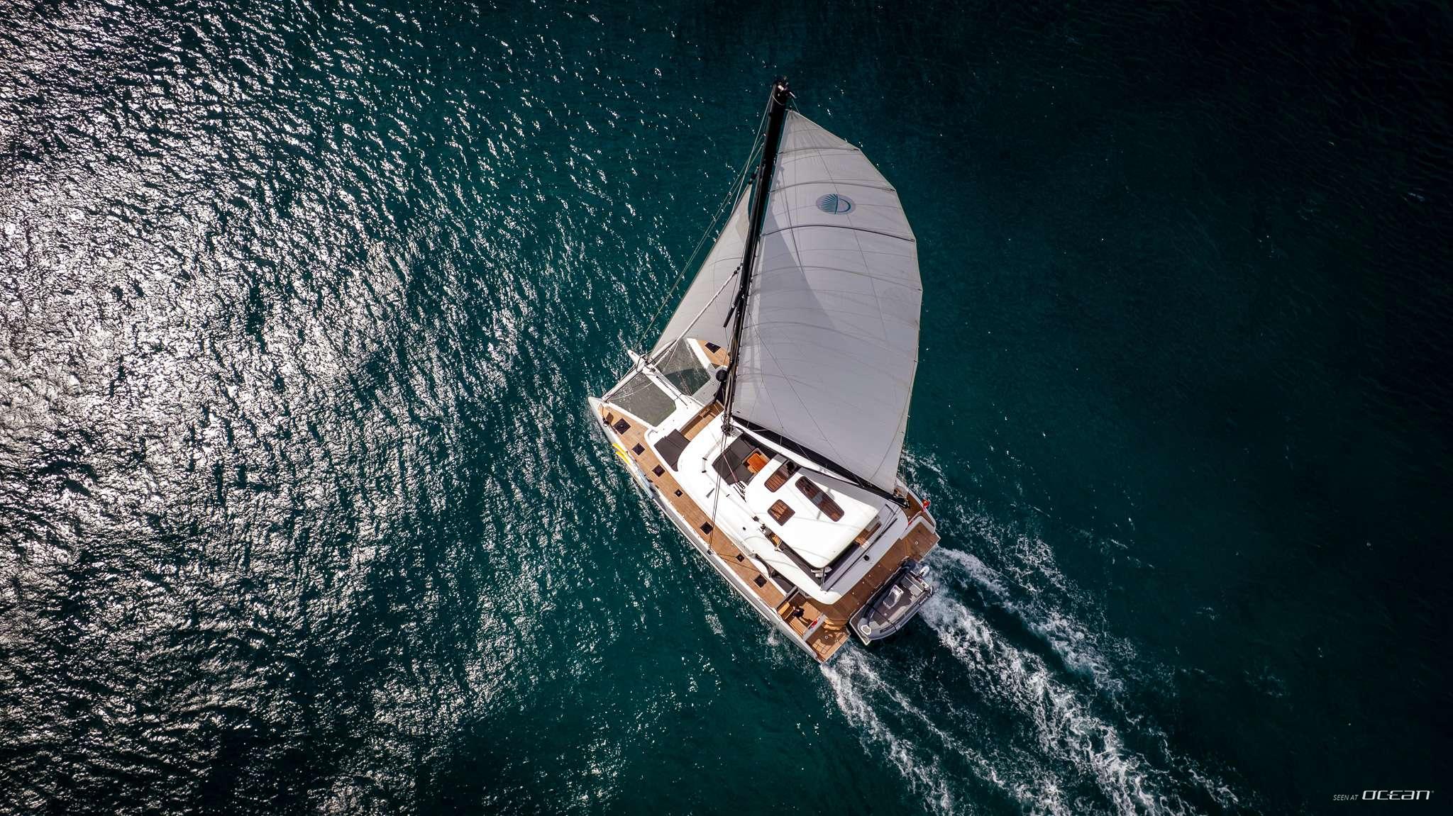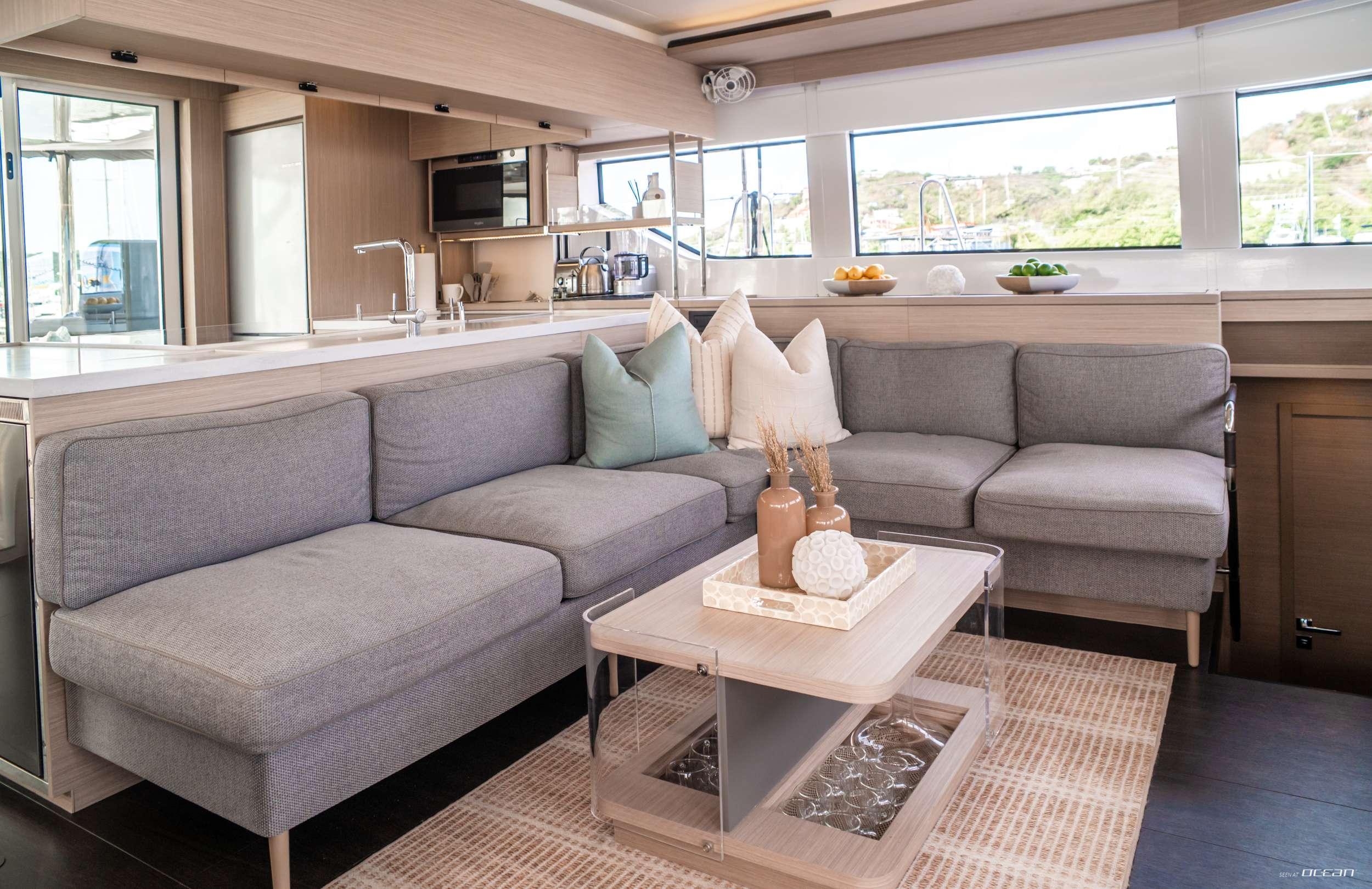 MINTED ONE highlights Lagoon’s hallmark focus on open-plan living, with spacious guest areas extending seamlessly from the forward bow lounge through the flybridge and into the aft cockpit. Large openings and level thresholds link the salon to exterior decks, allowing natural light and sea breezes to flow throughout. The interior styling is contemporary and calming, designed to feel fresh, uncluttered, and closely connected to the surrounding seascape.