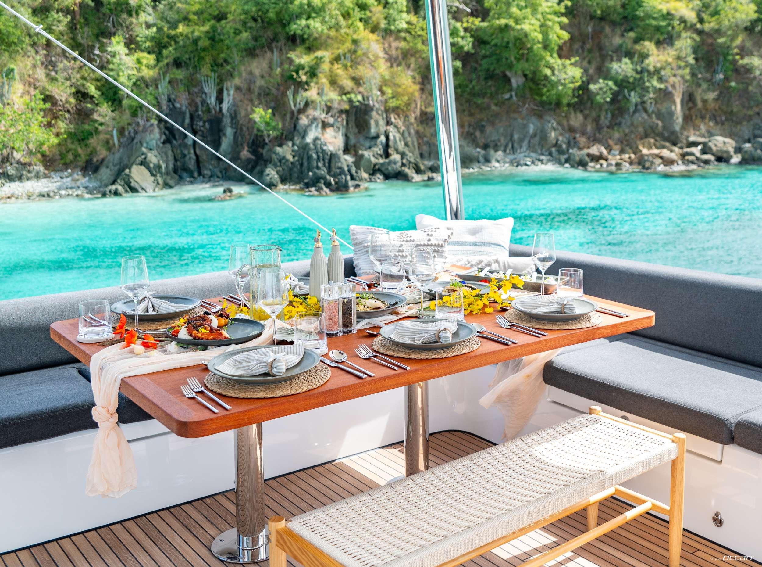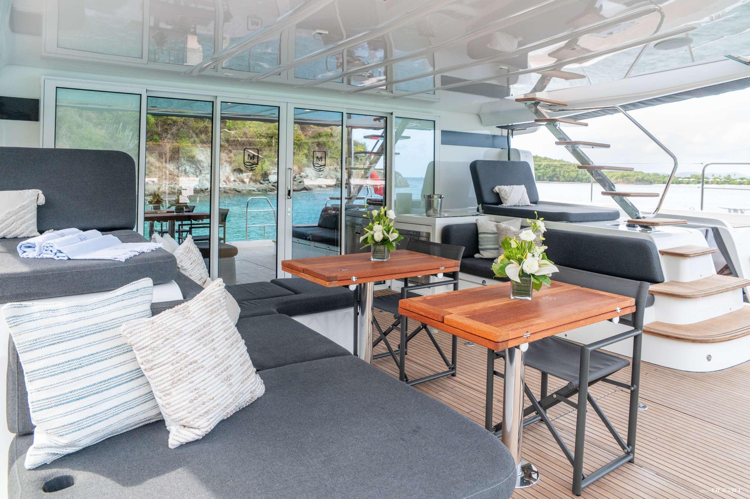 All cabins with en-suite bathrooms, air condition throughout, generator, watermaker, Wi-Fi internet, BBQ grill, ice maker, TV in salon, indoor and outdoor audio system, and water toys