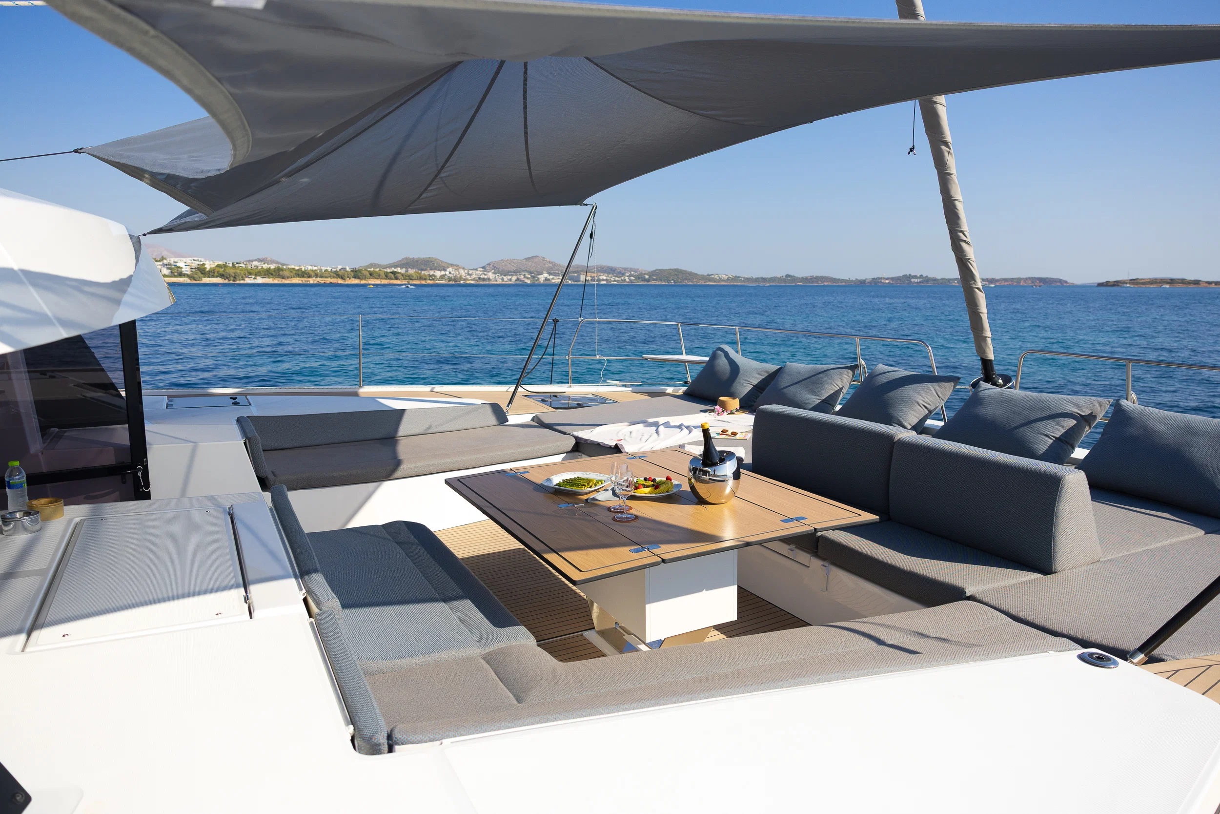 Charter Catamaran NEW HORIZONS 4 offers a clear deck arrangement built around shared living. The forward saloon, main cockpit, and flybridge provide separate yet connected areas for dining, relaxing, and enjoying the surroundings. The open-plan salon integrates directly with the aft cockpit, allowing easy movement throughout the yacht and supporting a balanced onboard experience for groups.