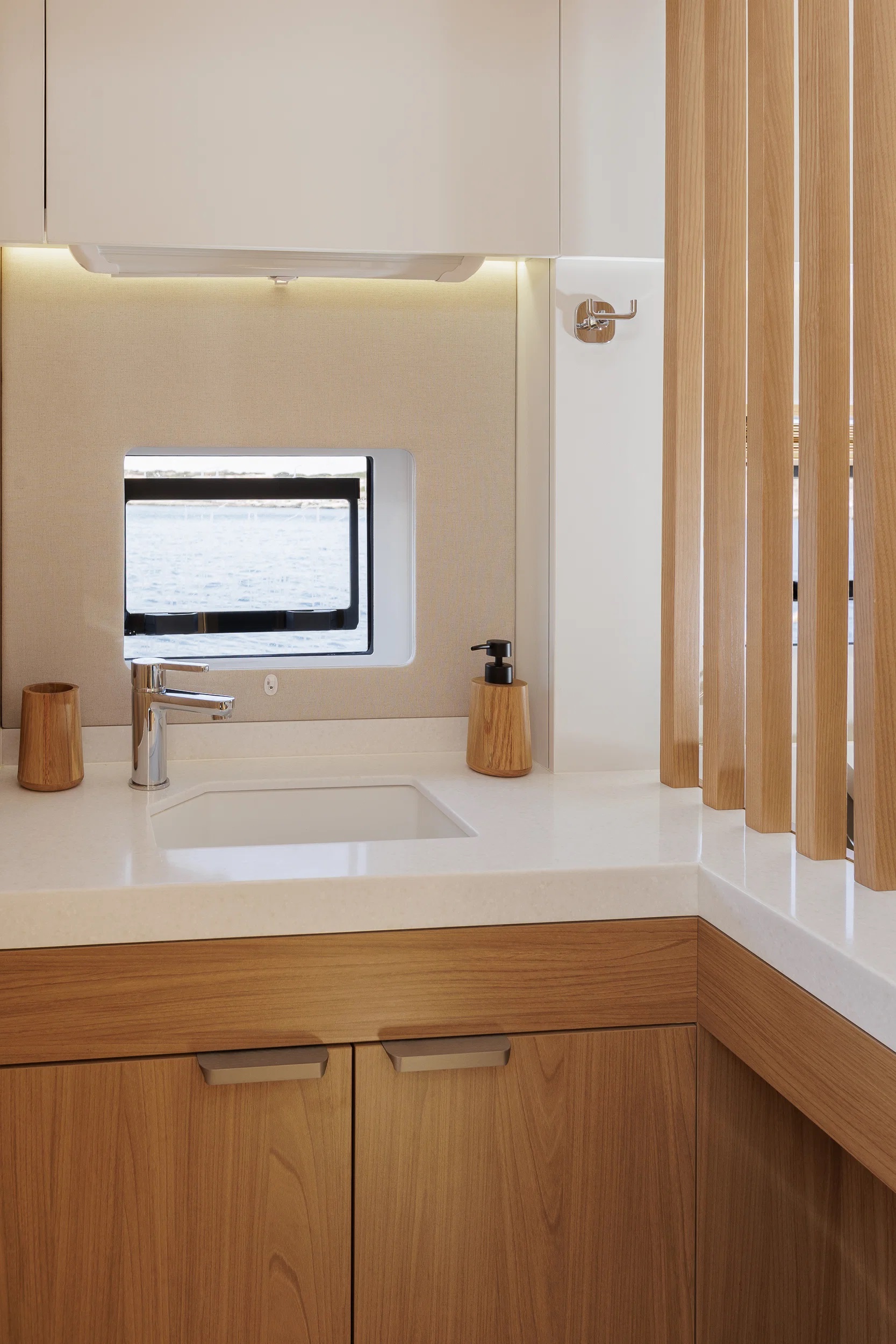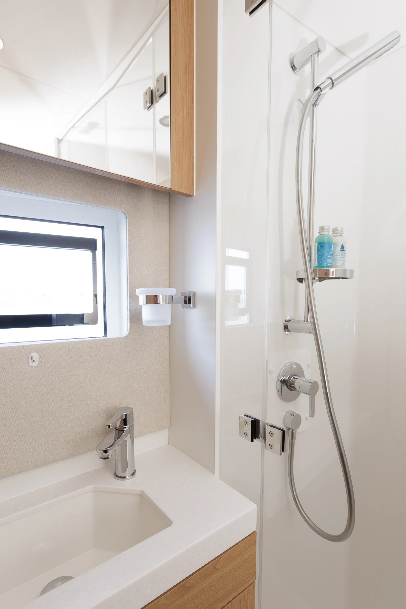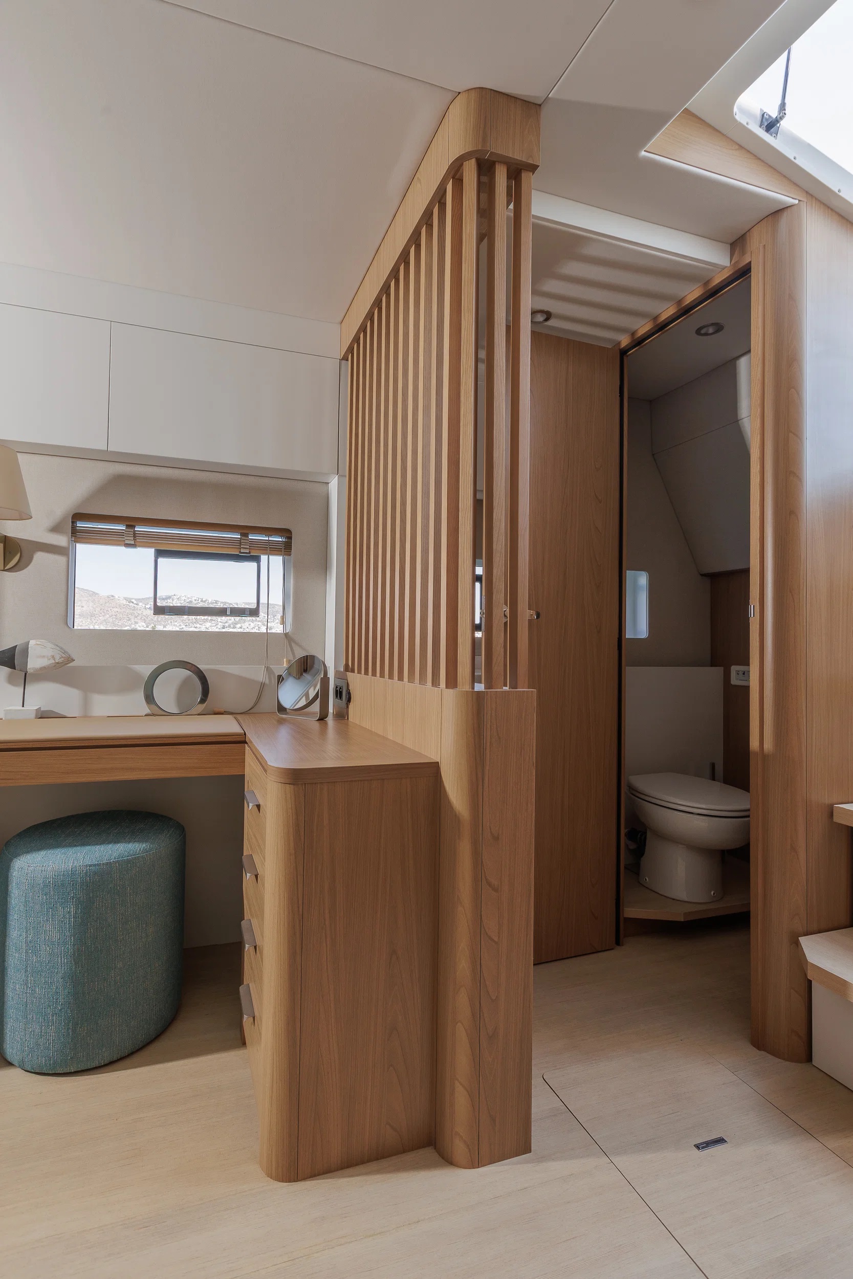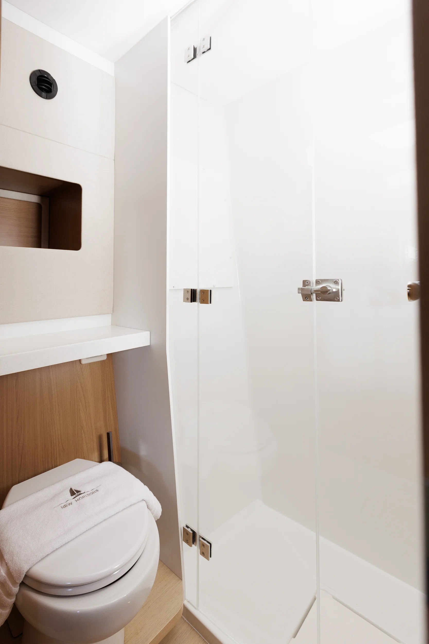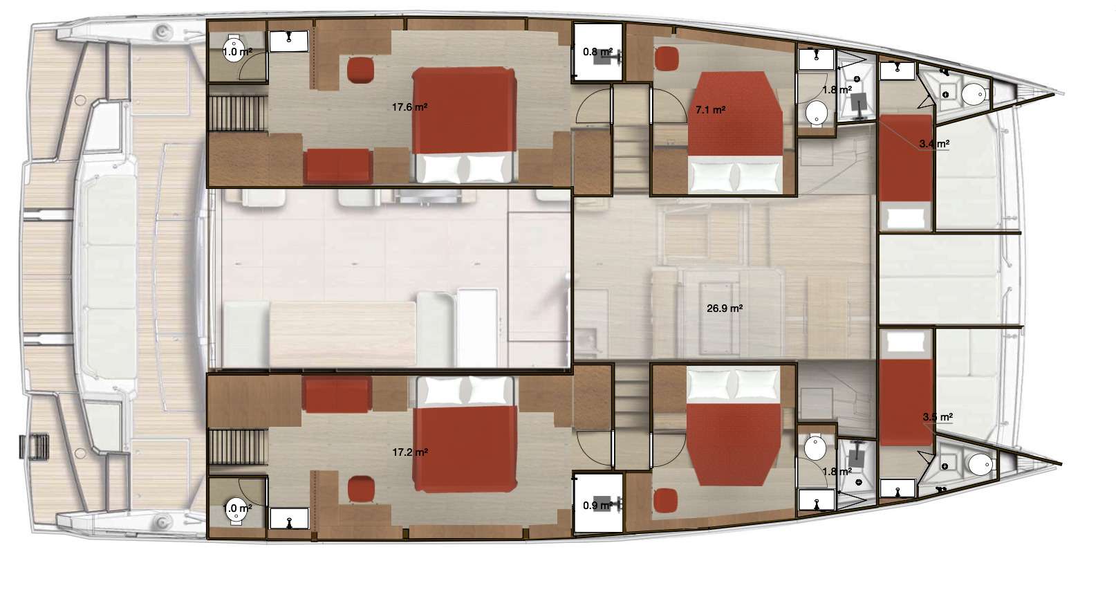 NEW HORIZONS 4 Bali 5.8 for charter accommodates up to 8 guests in 4 double cabins, including 2 larger master staterooms. Two cabins provide direct access to the aft cockpit, improving circulation and privacy. All cabins include ensuite bathroom facilities, individually controlled air conditioning, and Wi-Fi, ensuring a consistent standard of comfort during the charter.