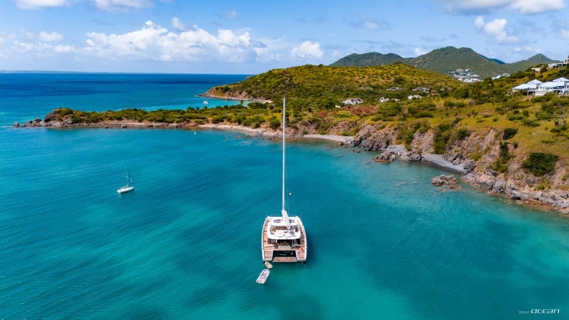 A hydraulic swim platform provides effortless access to the sea and serves as a launch base for a fast jet tender, 3 sea-scooters, assorted boards, skis, and inflatable towables. Expansive exterior areas include a generous flybridge with bar, sunbathing zones, and alfresco dining in the aft cockpit. Equally at home in Mediterranean anchorages or tropical waters, SEACLUSION is a compelling option for luxury sailing catamaran charters in the French Riviera during summer and the Caribbean throughout the winter season.