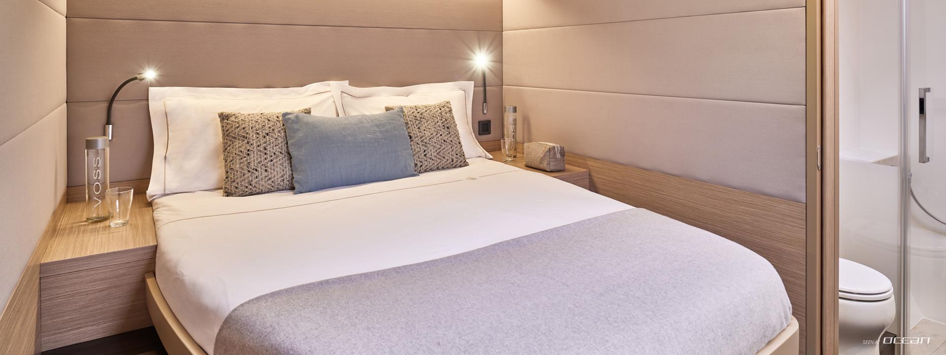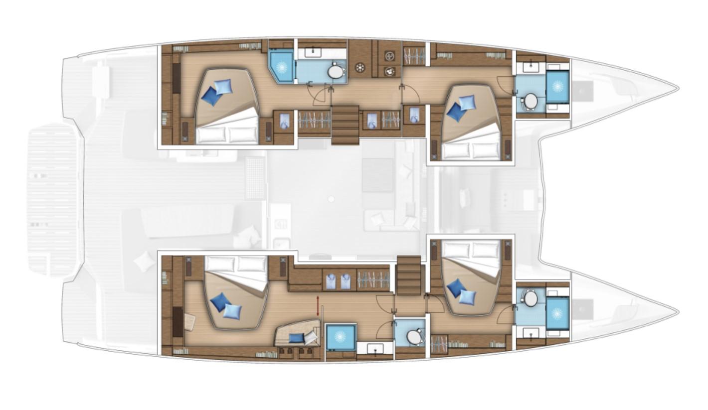 SEAS THE DAY stands apart from many sisterships thanks to her desirable 4 double cabin layout, including a deluxe master stateroom and 3 additional double cabins. This configuration makes SEAS THE DAY Lagoon 55 for charter an ideal choice for families and couples alike, delivering privacy and balance throughout the yacht. Climate-controlled interiors and abundant natural light create a calm and welcoming onboard environment.
