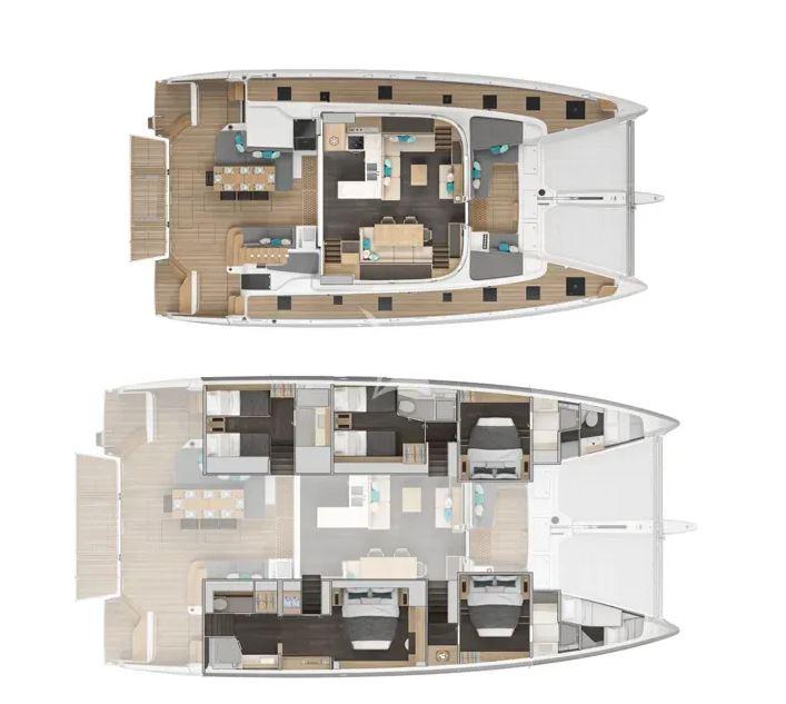 Designed for effortless living at sea, WISH Lagoon 60 catamaran for charter welcomes up to 10 guests in 5 double cabins, including a refined master suite and 4 additional doubles, all with ensuite bathrooms. The interior palette is modern, airy, and inviting, enhanced by abundant natural light and thoughtful detailing that creates a calm, sophisticated atmosphere for extended charters.