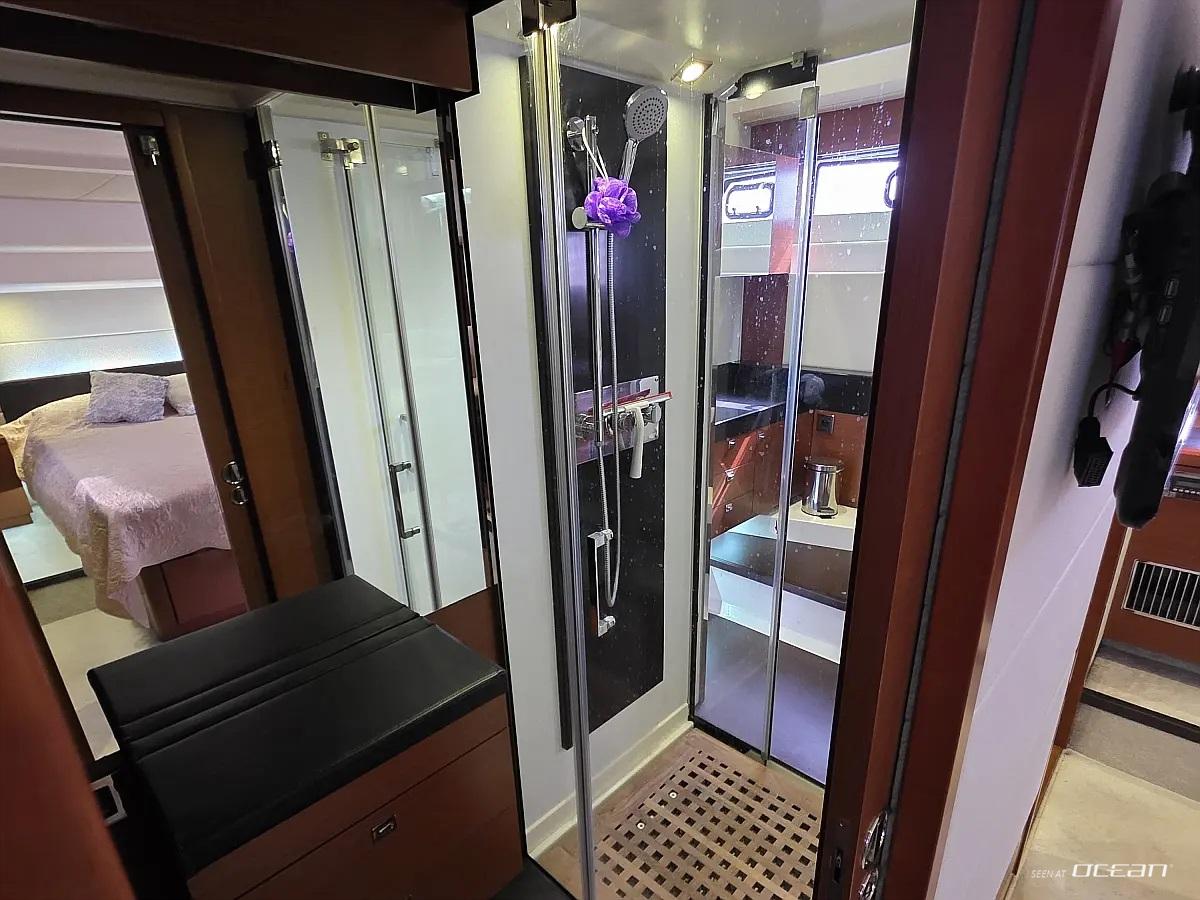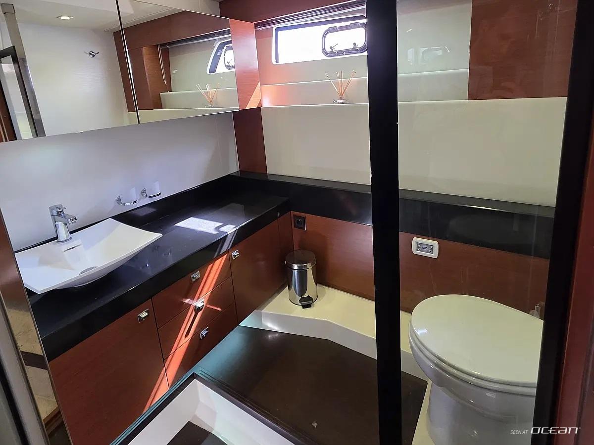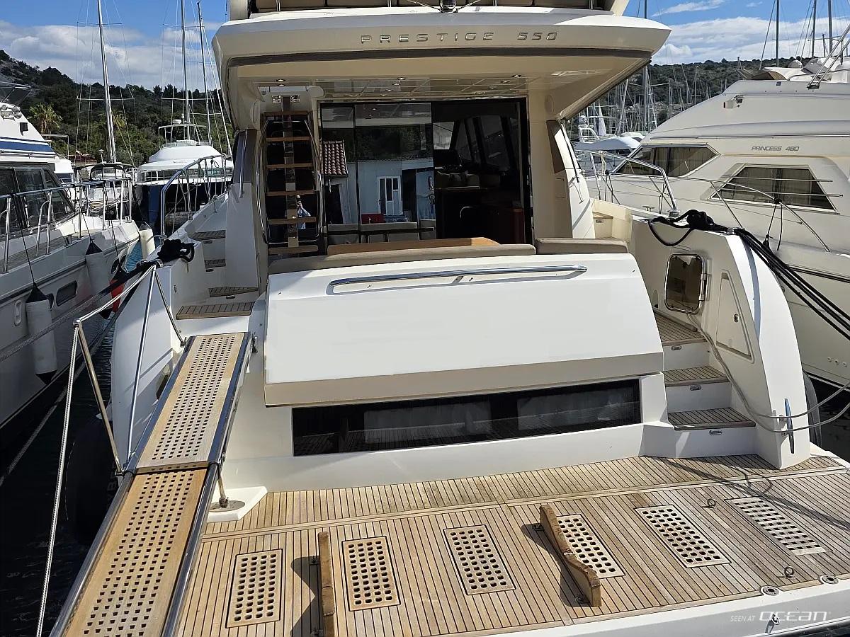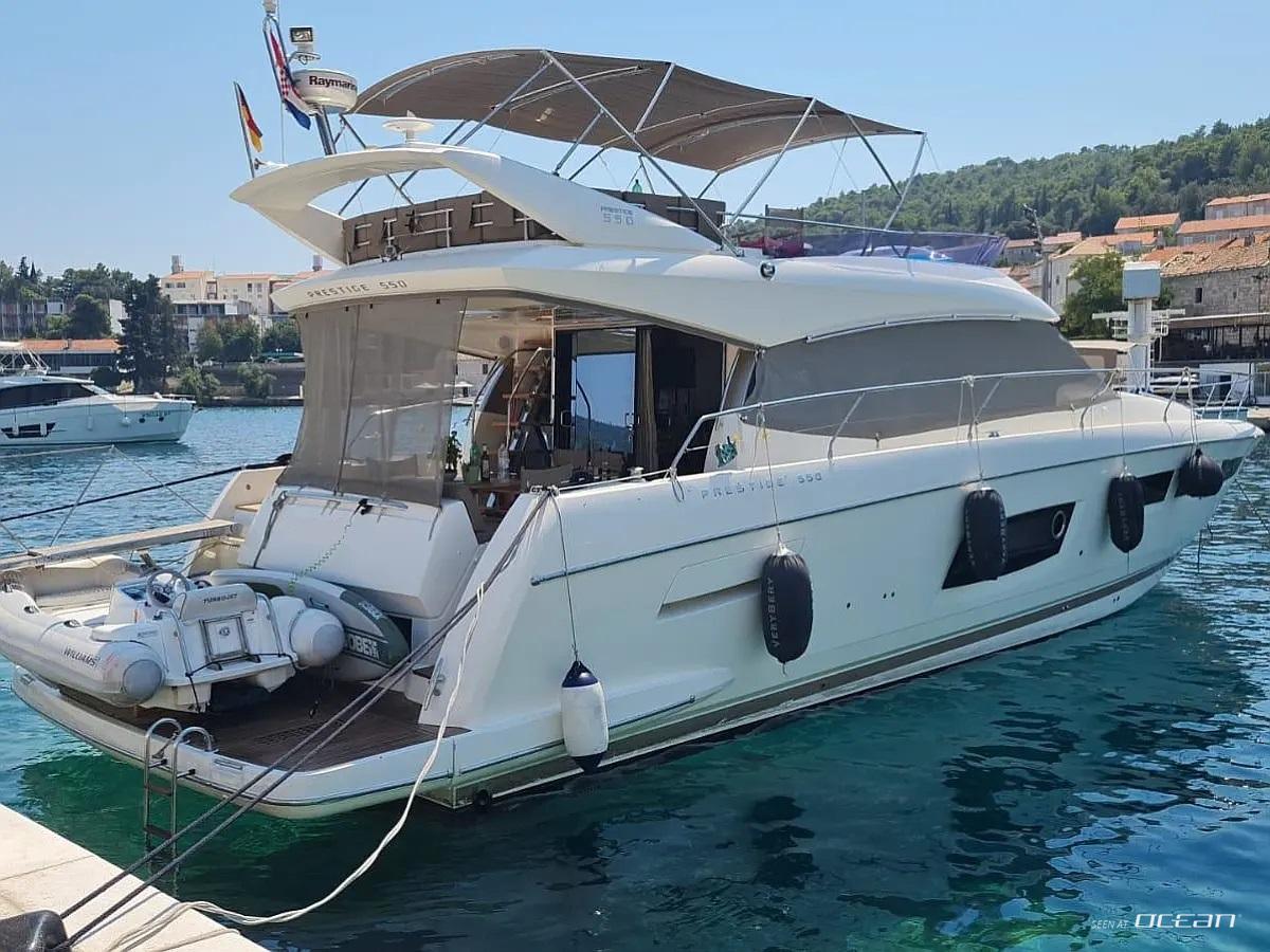 The Prestige 550 Flybridge offers an ideal blend of style, space, and performance for a bareboat motor yacht charter in Croatia. At 18 meters, she comfortably accommodates up to 6 guests in three cabins, including a full-beam master suite and a VIP and twin cabin sharing a bathroom, making her perfect for families or couples.
