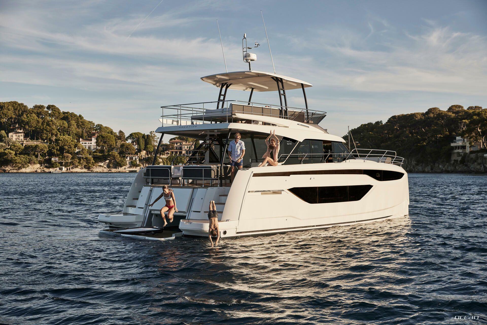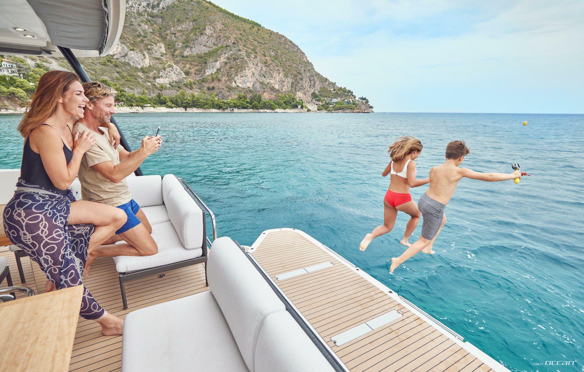 A spacious flybridge, large foredeck, and aft cockpit provide multiple outdoor zones for lounging, dining, and socializing. The hydraulic platform doubles as a beach club, creating an easy transition to the sea for swimming or launching a tender. Whether enjoying the view from the flybridge or relaxing at anchor, Prestige M48 for charter delivers an exceptional balance of performance and comfort.