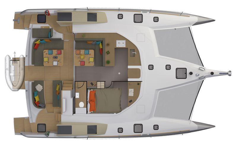 Our Neel 47 trimaran for bareboat charter features a bright, open salon that flows seamlessly into the expansive cockpit, creating a sociable outdoor living area ideal for tropical sailing. The elevated helm provides perfect visibility and keeps the skipper connected with guests enjoying the sun and sea breeze. Her sleek design and efficient sail plan ensure responsive handling, making island-hopping around Martinique and the Grenadines effortless and enjoyable.