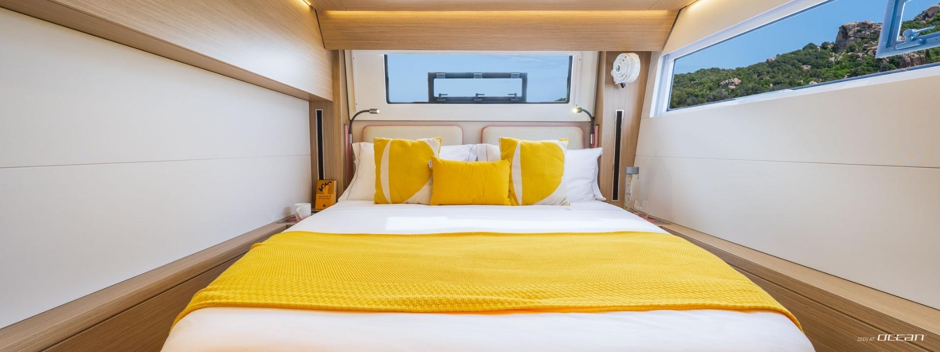 Lagoon 51 Iconic for charter in Croatia is configured in a 6+1 cabin layout, registered for up to 11 guests plus skipper. Accommodation includes 4 double cabins with ensuite bathrooms and 2 semi-double cabins located amidships, creating a flexible arrangement well-suited for families and groups of friends. A dedicated single bow cabin in the peak is reserved for the skipper, and a hostess can be appointed on request, making this sailing multihull an ideal catamaran with crew for relaxed Adriatic cruising.