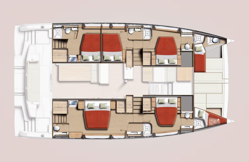 Our Bali 5.2 features a 5+2 cabin layout, accommodating up to 10 guests sleeping in comfort. This version stands out for its large master suite complemented by 4 double cabins, making it an ideal choice for both families and couples. The design follows Bali’s famous “open-space” concept, replacing the traditional trampoline with a solid foredeck lounge and connecting the salon and aft cockpit through the iconic tilting “garage-style” door. These design touches create a bright, airy, and social environment that makes sailing as enjoyable as anchoring.