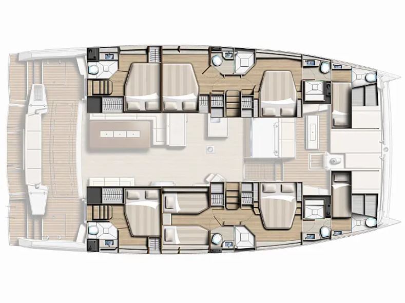 Life on board is made easy with air conditioning, generator power, a watermaker, and 12V ventilation fans in cabins and salon. Practical amenities include Bluetooth audio, a TV, icemaker, dishwasher, BBQ grill, and a hydraulic gangway for seamless marina access. Outdoor living shines on this model thanks to the flowing Bali layout between the aft platform, airy salon, flybridge, and the signature foredeck lounge in place of traditional trampolines. This setup enhances the Charter skippered luxury catamaran in Greece experience with comfort, versatility, and style.