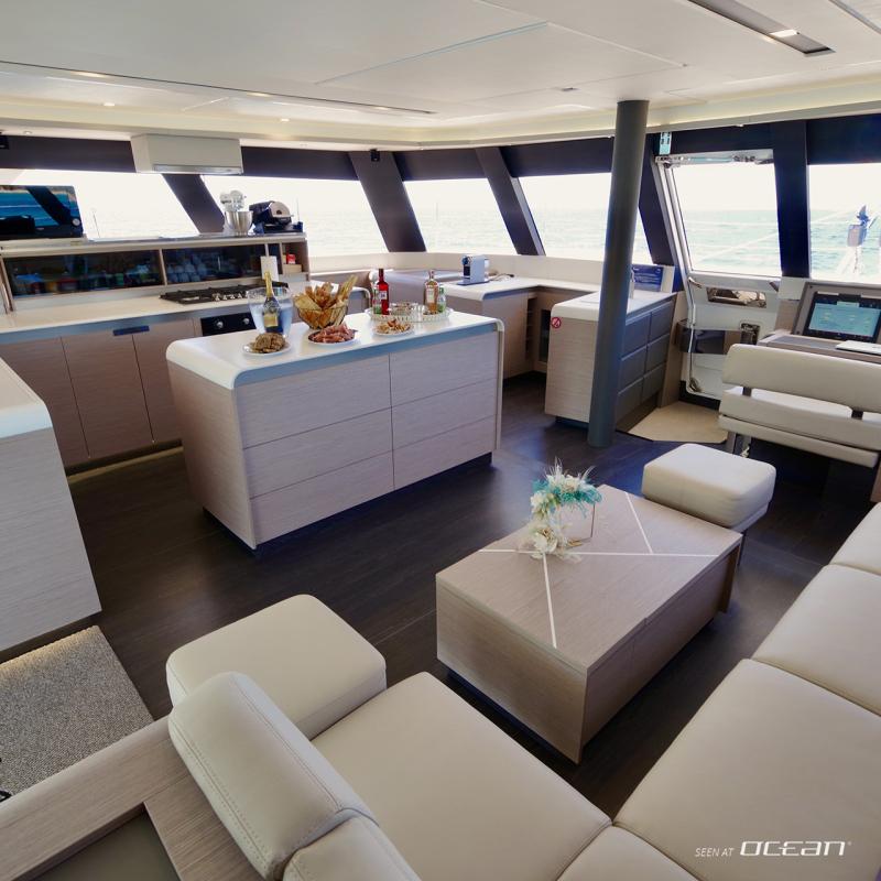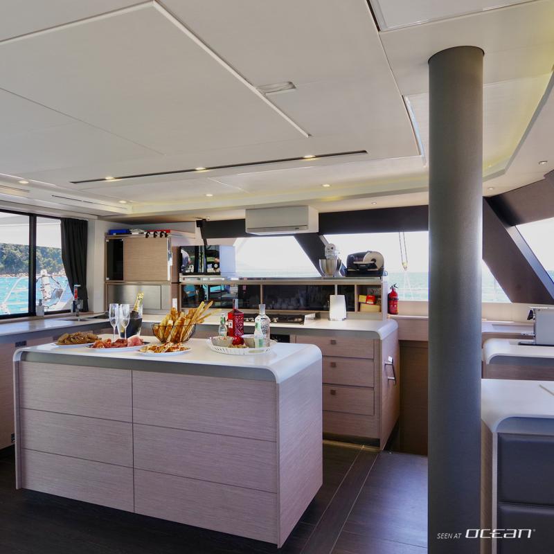Charter luxury catamaran in Naples, Samana 59 from Marina di Stabia (model 2024, 10 guests and 3 crew): full batten mainsail, furling/roll genoa, elecric winches, gennaker, air condition, generator, watermaker, electric toilets, teak cockpit, solar panels, dishwasher, ice maker, Nespresso coffee maker, washing machine, microwave, flybridge fridge, GPS chart plotter, autopilot, radar, hydraulic bathing platform, stern shower, 2 stand-up paddleboards, 2 sea scooters, snorkeling gear, 4m tender with 30hp outboard engine and all standard charter and safety equipment