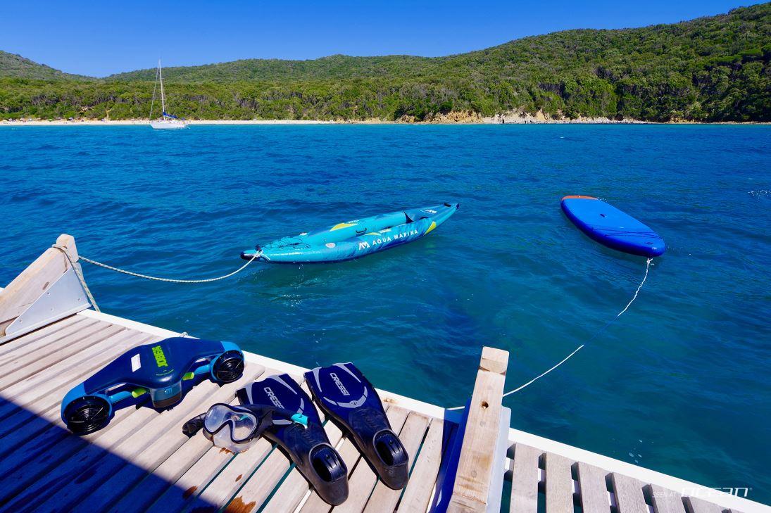 5.850 EUR/week charter pack including 3 crew members, bed linen, towels, water toys, and Wi-Fi internet