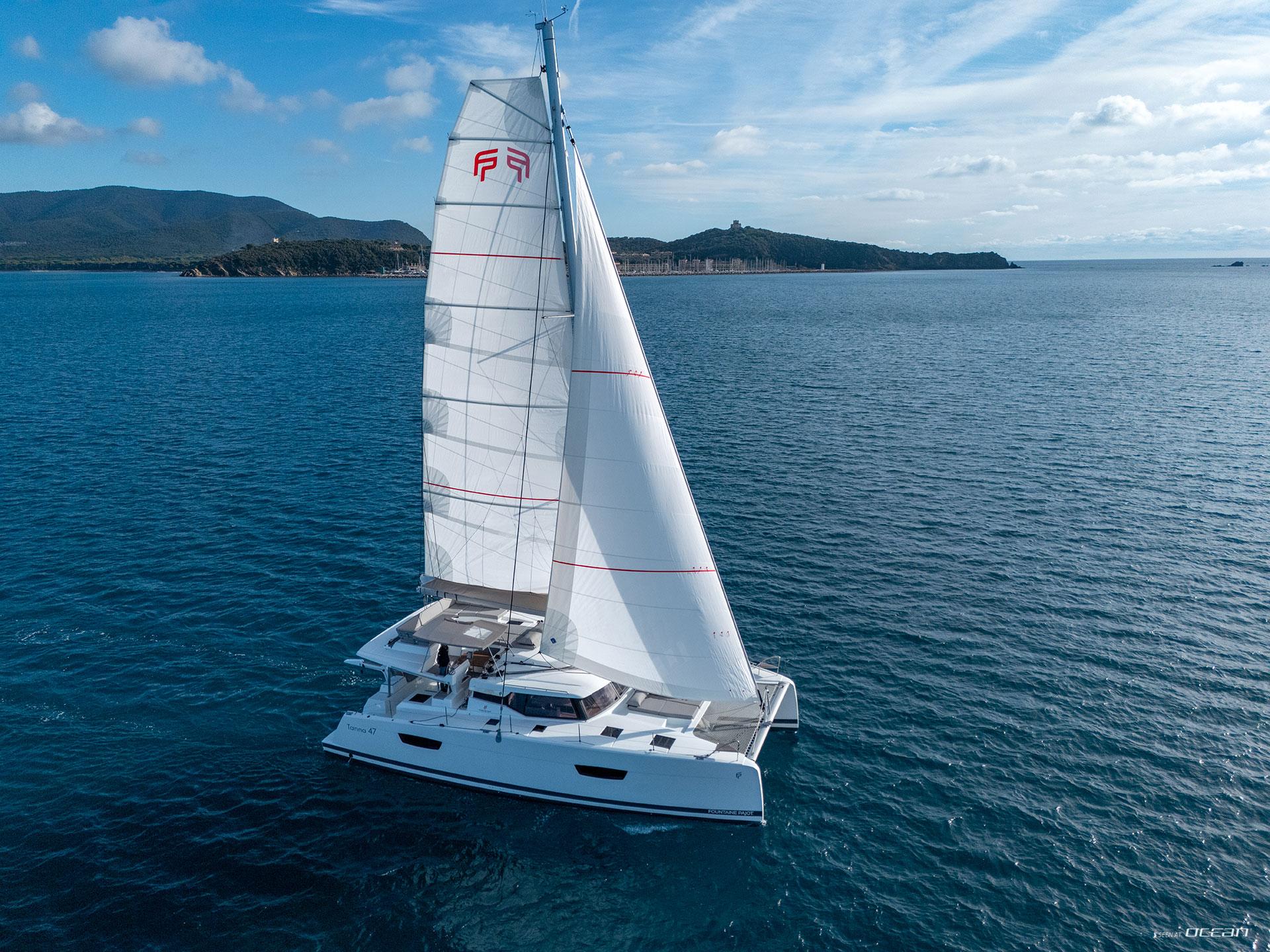 Sailing catamaran charter Sardinia, Fountaine Pajot Tanna 47 from Cannigione (model 2026): full/batten mainsail, self-tacking jib, electric winch, lazy bag, lazy jacks, generator, air condition, watermaker, electric toilets, music player, GPS chart plotter, autopilot, inverter, BBQ Plancha grill, Nespresso coffee maker, all outside cushions, electric windlass, cockpit/stern shower, bimini, dinghy with outboard engine, and all standard charter and safety equipment
